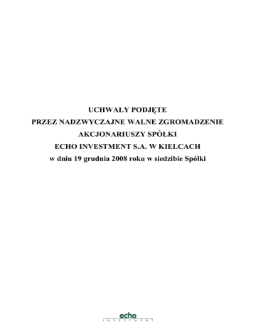 UCHWAŁY PODJĘTE PRZEZ NADZWYCZAJNE WALNE ZGROMADZENIE AKCJONARIUSZY SPÓŁKI ECHO INVESTMENT S.A. W KIELCACH w dniu 19 grudnia 2008 roku w siedzibie Spółki Uchwały podjęte przez NWZA Echo Investment S.A. w dniu 19 grudnia 2008 roku Uchwała Nr 1 Nadzwyczajnego Walnego Zgromadzenia Spółki pod firmą „Echo Investment” Spółka Akcyjna z siedzibą w Kielcach z dnia 19 grudnia 2008 roku w sprawie przyjęcia porządku obrad § 1. Porządek obrad Nadzwyczajne Walne Zgromadzenie Spółki Echo Investment Spółka Akcyjna z siedzibą w Kielcach przyjmuje następujący porządek obrad, zgodny z ogłoszeniem w Monitorze Sądowym i Gospodarczym z dnia 27 listopada 2008 r., nr 232, poz. 15076, str. 20. 1. Otwarcie Nadzwyczajnego Walnego Zgromadzenia Spółki i wybór Przewodniczącego. 2. Stwierdzenie prawidłowości zwołania Nadzwyczajnego Walnego Zgromadzenia Spółki i jego zdolności do podejmowania uchwał. 3. Przyjęcie porządku obrad. 4. Podjęcie uchwały w sprawie upoważnienia Zarządu Spółki do nabywania akcji własnych Spółki w celu ich umorzenia i/lub w trybie art. 362 § 1 pkt 8 Kodeksu spółek handlowych. 5. Zamknięcie obrad. § 2. Postanowienia końcowe 1. Uchwała wchodzi w życie z chwilą jej podjęcia. Uchwała nr 2 Nadzwyczajnego Walnego Zgromadzenia Spółki pod firmą „Echo Investment” Spółka Akcyjna z siedzibą w Kielcach z dnia 19 grudnia 2008 roku w sprawie wprowadzenia poprawki formalnej poprzez zmianę redakcji uchwały dotyczącej upoważnienia Zarządu Spółki do nabywania akcji własnych Spółki w celu ich umorzenia i/lub w trybie art. 362 § 1 pkt. 8 Kodeksu spółek handlowych §1 Nadzwyczajne Walne Zgromadzenie Spółki Echo Investment Spółka Akcyjna z siedzibą w Kielcach, postanawia wprowadzić poprawkę formalną poprzez przeniesieni dotychczasowego pkt. I § 1 pkt. 3 uchwały w sprawie upoważnienia Zarządu Spółki wprowadzić poprawkę formalną poprzez przeniesienie dotychczasowego pkt. I § 1 pkt. 3 uchwały w sprawie upoważnienia Zarządu Spółki do nabywania akcji własnych Spółki w celu ich umorzenia i/lub w trybie art. 362 § 1 pkt. 8 Kodeksu spółek handlowych do odrębnego punktu oznaczonego numerem IV w zmienionej treści: 2 Uchwały podjęte przez NWZA Echo Investment S.A. w dniu 19 grudnia 2008 roku Warunki nabywania akcji własnych będą zgodne z postanowieniami Rozporządzenia Komisji (WE) nr 2273/2003 z dnia 22 grudnia 2003 r. W związku z powyższym dotychczasowy pkt. IV uchwały otrzymuje oznaczenie V. §2 Uchwała wchodzi w życie z chwilą jej podjęcia. Uchwała nr 3 Nadzwyczajnego Walnego Zgromadzenia Spółki pod firmą „Echo Investment” Spółka Akcyjna z siedzibą w Kielcach z dnia 19 grudnia 2008 roku w sprawie upoważnienia Zarządu Spółki do nabywania akcji własnych Spółki w celu ich umorzenia i/lub w trybie art. 362 § 1 pkt. 8 Kodeksu spółek handlowych I. Utworzenie kapitału Nabycie akcji własnych w celu umorzenia Działając na podstawie art. 359 i art. 362 § 1 pkt. 5 Kodeksu spółek handlowych uchwala się, co następuje: §1 1. Nadzwyczajne Walne Zgromadzenie Spółki Echo Investment Spółka Akcyjna z siedzibą w Kielcach upoważnia Zarząd Spółki do nabywania akcji własnych Spółki, notowanych na rynku podstawowym Giełdy Papierów Wartościowych S.A. w Warszawie (dalej GPW), tj. rynku oficjalnych notowań giełdowych, w celu ich umorzenia na warunkach i w trybie ustalonych w pkt. I niniejszej uchwały. 2. Spółka nabywać będzie akcje w celu umorzenia, w pełni pokryte, według poniższych zasad: (a) łączna ilość nabywanych akcji w celu umorzenia nie będzie większa niż 210 000 000 (dwieście dziesięć milionów) akcji o wartości nominalnej 5 (pięć) groszy każda; (b) łączna minimalna wysokość zapłaty za nabywane akcje będzie nie mniejsza niż 100 (sto) złotych, zaś łączna maksymalna wysokość zapłaty za nabywane akcje będzie nie większa niż 420 500 000 (czterysta dwadzieścia milionów pięćset tysięcy) złotych; (c) akcje mogą być, stosownie do decyzji Zarządu Spółki, nabywane za pośrednictwem osób trzecich działających na rachunek Spółki, domów maklerskich, spółek zależnych oraz osób działających na rachunek spółek zależnych w obrocie giełdowym na GPW oraz w obrocie pozagiełdowych; 3 Uchwały podjęte przez NWZA Echo Investment S.A. w dniu 19 grudnia 2008 roku (d) upoważnienie Zarządu do nabywania akcji własnych w celu umorzenia obejmuje okres od dnia 20 grudnia 2008 r. do 19 grudnia 2013 r. nie dłużej jednak niż do chwili wyczerpania środków przeznaczonych na ich nabycie; (e) nie wyklucza się nabywania akcji w transakcjach pakietowych; (f) nie wyklucza się nabywania akcji w ramach publicznego wezwania na akcje Spółki; (g) nabycie akcji własnych, stosownie do decyzji Zarządu, może być finansowane z kwoty, która zgodnie z art. 348 § 1 Kodeksu spółek handlowych może być przeznaczona do podziału, przy czym Zarząd Spółki jest upoważniony do podjęcia decyzji o innych źródłach sfinansowania nabycia akcji własnych w celu umorzenia. 3. Zarząd, kierując się interesem Spółki, po zasięgnięciu opinii Rady Nadzorczej może: (a) zakończyć nabywanie akcji przed dniem 19 grudnia 2013 r. lub przed wyczerpaniem całości środków przeznaczonych na ich nabycie; (b) zrezygnować z nabycia akcji w całości lub w części. §2 Walne Zgromadzenie zobowiązuje i upoważnia Zarząd Spółki do podjęcia wszelkich czynności faktycznych i prawnych niezbędnych do nabycia akcji własnych Spółki w celu umorzenia zgodnie z treścią pkt. I § 1 niniejszej uchwały, w tym do zawarcia z biurami maklerskimi umów w sprawie skupu akcji w drodze transakcji giełdowych i pozagiełdowych. Zarząd Spółki jest upoważniony do określenia pozostałych zasad nabycia akcji, w zakresie nieuregulowanym w pkt. I § 1 niniejszej uchwały. §3 Po zakończeniu procesu nabywania akcji własnych przez Spółkę w celu um