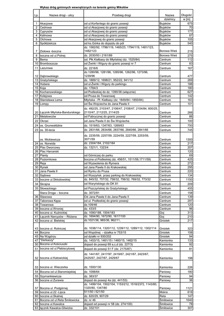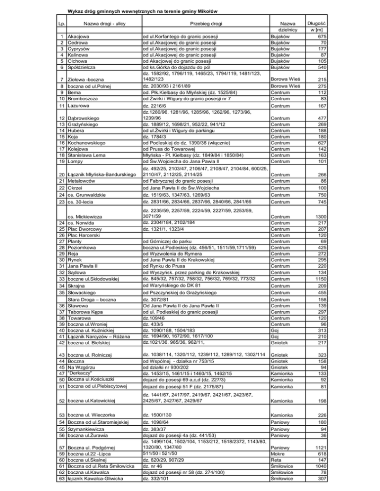 Wykaz dróg gminnych wewnętrznych na terenie gminy Mikołów Lp. 1 2 3 4 5 6 Nazwa drogi - ulicy Nazwa dzielnicy Bujaków Bujaków Bujaków Bujaków Bujaków Bujaków Długość w [m] 675 70 177 87 105 540 7 Ziołowa -boczna od ul.Korfantego do granic posesji od ul.Akacjowej do granic posesji od ul.Akacjowej do granic posesji od ul.Akacjowej do granic posesji od Akacjowej do granic posesji od ks.Górka do dojazdu do pól dz. 1582/92, 1796/119, 1465/23, 1794/119, 1481/123, 1482/123 Borowa Wieś 215 8 boczna od ul.Polnej 9 Bema 10 Bromboszcza dz. 2030/93 i 2161/89 od. Płk.Kiełbasy do Młyńskiej (dz. 1525/84) od Żwirki i Wigury do granic posesji nr 7 Borowa Wieś Centrum Centrum 275 112 83 11 Lazurowa dz. 2216/6 dz.1280/96, 1281/96, 1285/96, 1262/96, 1273/96, 1239/96 dz. 1889/12, 1698/21, 952/22, 941/12 od ul.Żwirki i Wigury do parkingu dz. 1784/3 od Podleskiej do dz. 1390/36 (włącznie) od Prusa do Towarowej Młyńska - Pł. Kiełbasy (dz. 1849/84 i 1850/84) od Św.Wojciecha do Jana Pawła II Centrum 167 Centrum Centrum Centrum Centrum Centrum Centrum Centrum Centrum 477 269 188 180 627 142 163 101 20 Łącznik Młyńska-Bandurskiego 21 Metalowców dz. 492/25, 2103/47, 2106/47, 2108/47, 2104/84, 600/25, 2110/47, 2112/25, 2114/25 Centrum od Fabrycznej do granic posesji Centrum 266 86 22 Okrzei od Jana Pawła II do Św.Wojciecha Centrum 100 24 os. Grunwaldzkie dz. 1519/63, 1347/63, 1269/63 dz. 2831/66, 2834/66, 2837/66, 2840/66, 2841/66 Centrum 750 Centrum 745 od Górniczej do parku boczna ul.Podleskiej (dz. 456/51, 1511/59,1711/59) od Wyzwolenia do Rymera od Jana Pawła II do Krakowskiej od Rynku do Prusa od Wyszyńsk. przez parking do Krakowskiej dz. 845/32, 757/32, 758/32, 756/32, 769/32, 773/32 Centrum Centrum Centrum Centrum Centrum Centrum Centrum Centrum Centrum Centrum Centrum 1300 217 207 120 69 425 272 295 220 134 1150 34 Skrajna od Waryńskiego do DK 81 Centrum 209 35 Słowackiego od Pszczyńskiej do Grażyńskiego Centrum 455 36 37 38 39 40 41 42 Stara Droga – boczna Stawowa Taborowa Kępa Towarowa boczna ul.Wroniej boczna ul. Kuźnickiej Łącznik Narcyzów – Różana boczna ul. Bielskiej dz. 3072/81 Od Jana Pawła II do Jana Pawła II od ul. Podleskiej do granic posesji dz.109/46 dz. 433/5 dz. 1090/188, 1504/183 dz. 1694/90, 1672/90, 1617/100 dz.1021/36, 965/36, 962/11, Centrum Centrum Centrum Centrum Centrum Goj Goj Gniotek 158 139 297 120 96 313 210 217 43 44 45 47 50 boczna ul. Rolniczej Boczna Na Wzgórzu "Derkaczy" Boczna ul.Kościuszki dz. 1038/114, 1320/112, 1239/112, 1289/112, 1302/114 od Wspólnej - działka nr 753/15 od działki nr 930/202 dz. 1453/15, 1461/15 i 1460/15, 1462/15 dojazd do posesji 69 a,c,d (dz. 227/3) Gniotek Gniotek Gniotek Kamionka Kamionka 323 158 94 133 92 51 boczna od ul.Plebiscytowej dojazd do posesji 51 F (dz. 2175/87) Kamionka 81 52 boczna ul.Katowickiej dz. 1441/67, 2417/97, 2419/67, 2421/67, 2423/67, 2425/67, 2427/67, 2429/67 Kamionka 198 53 boczna ul. Wieczorka dz. 1500/130 Kamionka 226 54 Boczna od ul.Staromiejskiej dz. 1098/64 Paniowy 180 55 Szymankiewicza 56 boczna ul.Żurawia dz. 383/37 dojazd do posesji 4a (dz. 441/53) dz. 1499/104, 1502/104, 1153/212, 1518/2372, 1143/80, 1320/80, 1347/80 511/50 i 521/50 dz. 620/29, 907/29 dz. nr 46 dojazd od posesji nr 58 (dz. 274/100) dz. 332/101 Paniowy Paniowy 94 36 12 13 14 15 16 17 18 19 Akacjowa Cedrowa Cyprysów Kalinowa Olchowa Spółdzielcza Przebieg drogi Dąbrowskiego Grażyńskiego Hubera Koja Kochanowskiego Kolejowa Stanisława Lema Lompy 23 os. 30-lecia 24 25 26 27 28 29 30 31 32 33 57 59 60 61 62 63 os. Mickiewicza os. Norwida Plac Dworcowy Plac Harcerski Planty Poziomkowa Reja Rynek Jana Pawła II Sądowa boczne ul.Skłodowskiej Boczna ul. Podgórnej boczna ul.22 -Lipca boczna ul.Skalnej Boczna od ul.Reta Śmiłowicka boczna ul.Kawalca łącznik Kawalca-Gliwicka dz. 2235/59, 2257/59, 2224/59, 2227/59, 2253/59, 3071/59 dz. 2304/184, 2102/184 dz. 1321/1, 1323/4 Paniowy Mokre Reta Śmiłowice Śmiłowice Śmiłowice 1121 618 147 1040 78 307