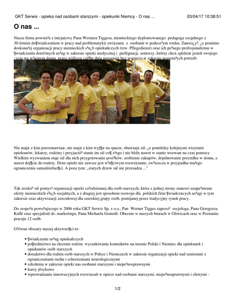 GKT Serwis - opieka nad osobami starszymi - opiekunki Niemcy - O nas ... 03/04/17 10:38:51 O nas ... Nasza firma powsta³a z inicjatywy Pana Wernera Tiggesa, niemieckiego dyplomowanego pedagoga socjalnego z 30-letnim do¶wiadczeniem w pracy nad problematyk± zwi±zan± z osobami w podesz³ym wieku. Zauwa¿y³, ¿e pomimo doskona³ej organizacji pracy niemieckich s³u¿b opiekuñczych (tzw. Pflegedienst) oraz ich pe³nego profesjonalizmu w ¶wiadczeniu dora¼nych us³ug w zakresie opieki medycznej i pielêgnacji, seniorzy, którzy chc± spêdziæ jesieñ swojego ¿ycia we w³asnym domu, przez wiêksz± czê¶æ dnia pozostaj± bez wsparcia w zakresie pozosta³ych potrzeb. Nie maj± z kim porozmawiaæ, nie maj± z kim wyj¶æ na spacer, obawiaj± siê, ¿e pomiêdzy kolejnymi wizytami opiekunów, lekarzy, rodziny i przyjació³ stanie im siê co¶ z³ego i nie bêd± nawet w stanie wezwaæ na czas pomocy. Wielkim wyzwaniem staje siê dla nich przygotowanie posi³ków, zrobienie zakupów, dopilnowanie porz±dku w domu, a nawet doj¶cie do toalety. Dom opieki nie zawsze jest w³a¶ciwym rozwi±zanie, zw³aszcza w przypadku ma³ego ograniczenia samodzielno¶ci. A poza tym: „starych drzew siê nie przesadza ...” Tak zrodzi³ siê pomys³ organizacji opieki ca³odziennej dla osób starszych, która z jednej strony stanowi uzupe³nienie oferty niemieckich s³u¿b socjalnych, a z drugiej jest sposobem rozwoju dla polskich firm ¶wiadcz±cych us³ugi w tym zakresie oraz aktywizacji zawodowej dla szerokiej grupy osób, pomijanej przez tradycyjny rynek pracy. Do zespo³u powo³uj±cego w 2006 roku GKT Serwis Sp. z o.o., Pan Werner Tigges zaprosi³ socjologa, Pana Grzegorza Kallê oraz specjalistê ds. marketingu, Pana Michaela Gomolê. Obecnie w naszych biurach w Gliwicach oraz w Poznaniu pracuje 12 osób. G³ówne obszary naszej aktywno¶ci to: • ¶wiadczenie us³ug opiekuñczych • po¶rednictwo na zlecenie rodzin: wyszukiwanie kontraktów na terenie Polski i Niemiec dla opiekunek i opiekunów osób starszych • doradztwo dla rodzin osób starszych w Polsce i Niemczech w zakresie organizacji opieki nad seniorami z ograniczeniami ruchu i schorzeniami neurologicznymi • szkolenia w zakresie opieki nas osobami starszymi i niepe³nosprawnymi • kursy jêzykowe • wprowadzanie innowacyjnych rozwi±zañ w opiece nad osobami starszymi, niepe³nosprawnymi i chorymi 1/2 GKT Serwis - opieka nad osobami starszymi - opiekunki Niemcy - O nas ... 03/04/17 10:38:51 projekt „Guzik ¿ycia” • dzia³ania na rzecz poprawy jako¶ci ¿ycia seniora - "srebrna gospodarka" Bran¿a opiekunów osób starszych jest wyj±tkowa na rynku pracy i us³ug. Poniewa¿ opowiadamy siê za odpowiedzialnym biznesem, zale¿y nam na aktywizacji zawodowej zarówno kobiet, jaki i mê¿czyzn, dla których na razie znajdujemy kontrakty w kraju i za granic±, Poprzez zestaw szkoleñ chcemy zapewniæ im jak najlepsze przygotowanie do wykonywanych dzia³añ. Dziêki zdobytemu do¶wiadczeniu i sieci sprawdzonych partnerów w Polsce i za granic± mo¿emy nie tylko realizowaæ podstawowe za³o¿enia firmy, lecz tak¿e aktywnie przyczyniaæ siê do pozytywnych zmian w dynamicznie rozwijaj±cej siê bran¿y. Grono naszych partnerów regularnie siê powiêksza. W 2006 nawi±zali¶my wspó³pracê z niemieckim stowarzyszeniem Diakonie24 Ruhr-Hellweg, które wraz z nami pracuje nad jeszcze wy¿szymi standardami opieki nad swoimi pacjentami. W nastêpnych latach do grona naszych partnerów do³±czy³y organizacje ze zwi±zków Caritas i Diakonie z innych rejonów Niemiec. 2/2