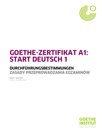 GOETHE-ZERTIFIKAT A1: START DEUTSCH 1 DURCHFÜHRUNGSBESTIMMUNGEN ZASADY PRZEPROWADZANIA EGZAMINÓW Stand: 1. April 2013 Stan na: 1 kwietnia 2013 GOETHE-ZERTIFIKAT A1: START DEUTSCH 1 Durchführungsbestimmungen ZASADY PRZEPROWADZANIA EGZAMINÓW Durchführungsbestimmungen zur Prüfung GOETHE-ZERTIFIKAT A1: START DEUTSCH 1 Zasady Przeprowadzania Egzaminów GOETHE-ZERTIFIKAT A1: START DEUTSCH 1 Stand: 1. April 2013 Stan na dz. 1 kwietnia 2013 r. Die Durchführungsbestimmungen zur Prüfung GOETHEZERTIFIKAT A1: START DEUTSCH 1 sind Bestandteil der Prüfungsordnung des Goethe-Instituts in ihrer jeweils aktuellen Fassung. Zasady Przeprowadzania Egzaminów GOETHE-ZERTIFIKAT A1: START DEUTSCH 1 stanowią część Regulaminu Egzaminów Goethe-Institut w jego aktualnym brzmieniu. Die Prüfung START DEUTSCH 1 wird vom Goethe-Institut getragen. Sie wird an den in § 2 der Prüfungsordnung genannten Prüfungszentren weltweit nach einheitlichen Kriterien durchgeführt und bewertet. Podmiotem odpowiedzialnym w odniesieniu do egzaminu START DEUTSCH 1 jest Goethe-Institut. Egzamin przeprowadzany i oceniany jest na całym świecie według jednolitych kryteriów w centrach egzaminacyjnych, o których mowa w § 2 Regulaminu Egzaminów. Die Prüfung dokumentiert die erste Stufe – A1 – der im Gemeinsamen europäischen Referenzrahmen für Sprachen (GER) beschriebenen sechsstufigen Kompetenzskala und damit die Fähigkeit zur elementaren Sprachverwendung. Egzamin poświadcza osiągnięcie pierwszego poziomu – A1 – w sześciostopniowej skali oceny kompetencji Europejskiego Systemu Opisu Kształcenia Językowego, a tym samym umiejętność porozumiewania się na poziomie podstawowym. §1 Prüfungsbeschreibung §1 Opis egzaminu § 1.1 Bestandteile der Prüfung § 1.1 Części egzaminu Die Prüfung START DEUTSCH 1 besteht aus folgenden obligatorischen Teilprüfungen: schriftliche Gruppenprüfung, mündliche Gruppenprüfung. Egzamin START DEUTSCH 1 składa się z następujących obowiązkowych części: pisemnego egzaminu grupowego, ustnego egzaminu grupowego. § 1.2 § 1.2 Prüfungsmaterialien 2 / 10 Materiały egzaminacyjne Die Prüfungsmaterialien bestehen aus Kandidatenblättern mit dem Antwortbogen (Hören, Lesen, Schreiben), Prüferblättern mit dem Bogen Sprechen – Ergebnis und dem Bogen Gesamtergebnis sowie Tonträgern. Na materiały egzaminacyjne składają się arkusze egzaminacyjne wraz z arkuszami odpowiedzi (SŁUCHANIE, CZYTANIE, PISANIE), materiały dla egzaminatorów z arkuszem Mówienie-Ocena, arkuszem Ocena końcowa oraz nośniki dźwięku. Die Kandidatenblätter enthalten die Aufgaben für die Prüfungsteilnehmenden: Aufgaben zum Prüfungsteil HÖREN (Teil 1–3); Texte und Aufgaben zum Prüfungsteil LESEN (Teil 1–3); Texte und Aufgaben zum Prüfungsteil SCHREIBEN (Teil 1 und 2). Arkusze egzaminacyjne zawierają zadania dla zdających: Im Prüfungsteil SPRECHEN erhalten die Prüfungsteilnehmenden Stichwörter und Handlungskarten (Teil 1–3). W części MÓWIENIE zdający otrzymują hasła i karty tematyczne (części 1 – 3). In den Antwortbogen tragen die Prüfungsteilnehmenden ihre Lösungen bzw. ihren Text ein. Na arkusze odpowiedzi zdający nanoszą rozwiązania wzgl. napisany przez siebie tekst. Stand: 1. April 2013 Stan na: 1 kwietnia 2013 zadania do części SŁUCHANIE (część 1 – 3); teksty i zadania do części CZYTANIE (część 1 – 3); teksty i zadania do części PISANIE (części 1 i 2). GOETHE-ZERTIFIKAT A1: START DEUTSCH 1 Durchführungsbestimmungen ZASADY PRZEPROWADZANIA EGZAMINÓW 3 / 10 Die Prüferblätter enthalten die Transkriptionen der Hörtexte; die Lösungen; die Anweisungen zur Bewertung der schriftlichen Prüfungsteile; Musterbewertungen zu schriftlichen Leistungsbeispielen; die Anweisungen zur Durchführung und Bewertung der mündlichen Prüfung. Materiały dla egzaminatorów zawierają transkrypcję tekstów do słuchania; rozwiązania; instrukcje dotyczące oceny części pisemnych egzaminu; wzory oceny odpowiedzi pisemnych; instrukcje dotyczące przeprowadzenia i oceny egzaminu ustnego. In die Ergebnisfelder auf dem Antwortbogen zu den Prüfungsteilen LESEN, HÖREN, SCHREIBEN und in den Bogen Sprechen – Ergebnis tragen die Prüfenden ihre Bewertung ein. Auf dem Bogen Gesamtergebnis werden die Ergebnisse der Teilprüfungen zusammengeführt. Egzaminatorzy wpisują w pola wyników na arkuszach odpowiedzi do części CZYTANIE, SŁUCHANIE, PISANIE oraz na arkuszu Mówienie-Wynik swoją ocenę. Na arkuszu Ocena końcowa wpisuje się łącznie wynik wszystkich części. Die Tonträger enthalten die Texte zum Prüfungsteil HÖREN sowie alle Anweisungen und Informationen. Nośniki dźwięku zawierają teksty do części egzaminu SŁUCHANIE oraz wszystkie instrukcje i informacje. § 1.3 § 1.3 Prüfungssätze Zestawy egzaminacyjne Die Materialien zu den schriftlichen Prüfungsteilen sind jeweils in Prüfungssätzen zusammengefasst. Die Materialien zum Prüfungsteil SPRECHEN können untereinander und mit den schriftlichen Prüfungssätzen beliebig kombiniert werden. Materiały do egzaminu pisemnego połączone są w zestawy egzaminacyjne. Materiały do poszczególnych części MÓWIENIE mogą być zestawiane ze sobą oraz z zestawami egzaminacyjnymi do części pisemnej w sposób dowolny. § 1.4 § 1.4 Zeitliche Organisation Organizacja czasu Die schriftliche Prüfung findet in der Regel vor der mündlichen statt. Falls schriftliche und mündliche Prüfung nicht am selben Tag stattfinden, liegen zwischen schriftlicher und mündlicher Prüfung maximal 14 Tage. Egzamin pisemny odbywa się z reguły przed ustnym. Jeżeli egzamin ustny i pisemny nie odbywają się tego samego dnia, to przedział czasowy pomiędzy nimi nie może przekraczać 14 dni. Die schriftliche Prüfung dauert ohne Pausen insgesamt 65 Minuten: Egzamin pisemny trwa bez przerw łącznie 65 min.: Prüfungsteil Dauer Część egzaminu Czas trwania HÖREN ca. 20 Minuten SŁUCHANIE ok. 20 min. LESEN 