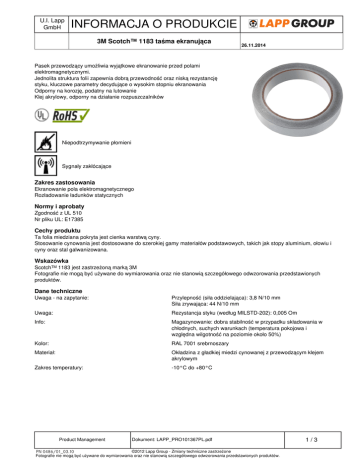 U.I. Lapp GmbH INFORMACJA O PRODUKCIE 3M Scotch™ 1183 taśma ekranująca 26.11.2014 Pasek przewodzący umożliwia wyjątkowe ekranowanie przed polami elektromagnetycznymi. Jednolita struktura folii zapewnia dobrą przewodność oraz niską rezystancję styku, kluczowe parametry decydujące o wysokim stopniu ekranowania Odporny na korozję, podatny na lutowanie Klej akrylowy, odporny na działanie rozpuszczalników Niepodtrzymywanie płomieni Sygnały zakłócające Zakres zastosowania Ekranowanie pola elektromagnetycznego Rozładowanie ładunków statycznych Normy i aprobaty Zgodność z UL 510 Nr pliku UL: E17385 Cechy produktu Ta folia miedziana pokryta jest cienka warstwą cyny. Stosowanie cynowania jest dostosowane do szerokiej gamy materiałów podstawowych, takich jak stopy aluminium, ołowiu i cyny oraz stal galwanizowana. Wskazówka Scotch™ 1183 jest zastrzeżoną marką 3M Fotografie nie mogą być używane do wymiarowania oraz nie stanowią szczegółowego odwzorowania przedstawionych produktów. Dane techniczne Uwaga - na zapytanie: Przylepność (siła oddzielająca): 3,8 N/10 mm Siła zrywająca: 44 N/10 mm Uwaga: Rezystancja styku (według MILSTD-202): 0,005 Om Info: Magazynowanie: dobra stabilność w przypadku składowania w chłodnych, suchych warunkach (temperatura pokojowa i względna wilgotność na poziomie około 50%) Kolor: RAL 7001 srebrnoszary Materiał: Okładzina z gładkiej miedzi cynowanej z przewodzącym klejem akrylowym Zakres temperatury: -10°C do +80°C Product Management Dokument: LAPP_PRO101367PL.pdf ©2012 Lapp Group - Zmiany techniczne zastrzeżone PN 0486/01_03.10 Fotografie nie mogą być używane do wymiarowania oraz nie stanowią szczegółowego odwzorowania przedstawionych produktów. 1/3 Powered by TCPDF (www.tcpdf.org) Zawartość opakowania [m] 61721420 3M Scotch™ 1183 / 9x16,5 9 16.5 61721421 3M Scotch™ 1183 / 12x16,5 12 16.5 61721422 3M Scotch™ 1183 / 19x16,5 19 16.5 61721423 3M Scotch™ 1183 / 25x16,5 25 16.5 26.11.2014 ©2012 Lapp Group - Zmiany techniczne zastrzeżone PN 0486/01_03.10 Fotografie nie mogą być używane do wymiarowania oraz nie stanowią szczegółowego odwzorowania przedstawionych produktów. Dokument: LAPP_PRO101367PL.pdf 3M Scotch™ 1183 taśma ekranująca INFORMACJA O PRODUKCIE Szerokość [mm] U.I. Lapp GmbH Oznaczenie wyrobu Product Management Numer artykułu 2/3 Powered by TCPDF (www.tcpdf.org) U.I. Lapp GmbH INFORMACJA O PRODUKCIE 3M Scotch™ 1183 taśma ekranująca Product Management 26.11.2014 Dokument: LAPP_PRO101367PL.pdf ©2012 Lapp Group - Zmiany techniczne zastrzeżone PN 0486/01_03.10 Fotografie nie mogą być używane do wymiarowania oraz nie stanowią szczegółowego odwzorowania przedstawionych produktów. 3/3