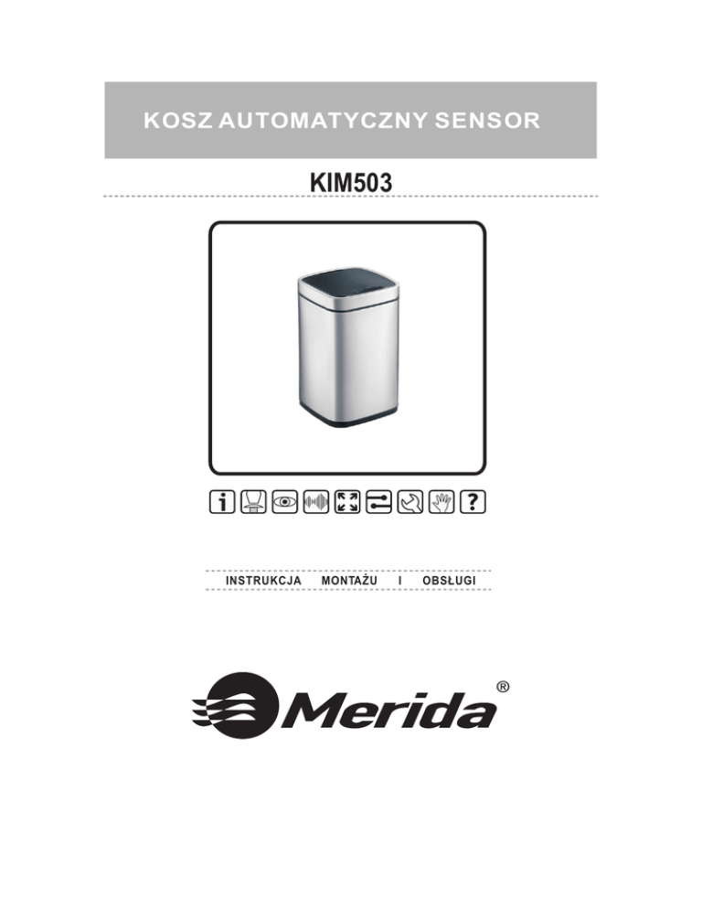 KOSZ AUTOMATYCZNY SENSOR KIM503 INSTRUKCJA MONTAŻU I OBSŁUGI Instrukcja montażu i obsługi 1. Części składowe, montaż baterii. Części kosza 1. Klapa; 2. Pokrywa kosza; 3. Wyświetlacz i panel sterowania; 4. Kosz; 5. Wyjmowane wewnętrzne wiadro; 6. Zaczep do odwieszania pokrywy; 7. Pokrywa baterii; 8. Włącznik Instalacja baterii 1. Otwórz pokrywę baterii i wyjmij pojemnik na baterie. 2. Włóż baterie do pojemnika znajdującego się w pokrywie kosza (4 x R6 (AA )) 3. Włóż pojemnik na baterie w pokazanej pozycji i zamknij pokrywę baterii 4. Włącz urządzenia Tą stroną w dół 2 www.merida.com.pl Instrukcja montażu i obsługi 2. Zasięg pracy sensora, tryb pracy, mocowanie worka na śmieci. Efektywny zasięg pracy sensora Efektywny zasięg czujnika zbliżeniowego to 28 cm (± 5 cm) nad panelem. Gdy zbliżysz na taką odległość rękę, klapa otworzy się. Tryby pracy: OPEN Tryb oczekiwania (Stand-by) Pokrywa kosza pozostaje zamknięta i czeka na sygnał do otwarcia. Tryb sygnalizowany jest pulsującą czerwoną diodą. Migające czerwone światło w trybie oczekiwania (Stand - by) OPEN Tryb pracy automatycznej Ruch ręką nad czujnikiem zbliżeniowym otwiera klapę kosza. Klapa pozostaje otwarta tak długo jak czujnik wykrywa rękę, sygnalizowane jest to krążącą na wyświetlaczu czerwoną diodą. Zabranie ręki z zasięgu pracy czujnika zamyka klapę po 5 s.. Czs do zamknięcia pokazany jest na wyświetlaczu. CLOSE CLOSE Migające światło czujnika gdy klapa jest otwarta. OPEN CLOSE Oznaczenie świetlne (odliczanie) przy zamykaniu klapy. Tryb pracy ręcznej Ten tryb pozwala otworzyć klapę kosza na stałe. Przycisk “open” - otwiera klapę, przycisk “close” - zamyka ją. OPEN CLOSE Mocowanie worka na śmieci 1. włóż worek na śmieci do wiadra i wywiń jego górną krawędź (jak na rysunku obok) 2. nadmiar worka wsuń w elastyczny uchwyt. Kosz zawsze będzie wyglądał schludnie i estetycznie. www.merida.com.pl 3 Instrukcja montażu i obsługi 3. Zaczep serwisowy, otwory odprowadzające, rozwiązywanie problemów. Zaczep serwisowy Pokrywa z chowanym zaczepem, pozwalającym zawiesić ją na brzegu kosza, co pozwala na wygodny serwis - czyszczenie, wymianę worka. Zaczep znajduje się na wewnętrznej stronie pokrywy kosza. Pociągnij go do góry i zawieś na koszu. Przy normalnym użytkowaniu zamknij zaczep Uwagi: 1. Przy normalnej eksploatacji zaczep musi być zamknięty. 2. Gdy pokrywa jest zawieszona na koszu należy uważać aby nie uszkodzić zaczepu przy wyjmowaniu wiadra wewnętrznego. Dolne otwory odprowadzające Otwory w podstawie kosza pozwalają na odprowadzanie płynu w przypadku wystąpienia jakichkolwiek wycieków. Rozwiązywanie problemów 1. Wyświetlacz nie świeci się - sprawdź czy baterie są poprawnie włożone lub wymień zużyte baterie. 2. Sensor nie reaguje na zbliżenie - kosz może być ustawiony w trybie pracy ręcznej. Naciśnięcie przycisku "close” ustawi urządzenie w tryb automatyczny. 4 www.merida.com.pl Instrukcja montażu i obsługi 4. Informacje o bezpieczeństwie. Ważne informacje o bezpieczeństwie Wykorzystanie kosza niezgodnie z przeznaczeniem może spowodować utratę gwarancji oraz może być niebezpieczne. To urządzenie nie jest przeznaczone do użytkowania przez osoby (w tym dzieci) o zmniejszonej sprawności fizycznej, psychicznej lub motorycznej, chyba, że będą one nadzorowane przez osobę odpowiedzialną za ich bezpieczeństwo. Dzieci nie powinny bawić się urządzeniem. Obsługa i użytkowanie baterii Wymianę baterii powinny przeprowadzać osoby dorosłe, zgodnie ze schematem wymiany baterii (strona 2 niniejszej instrukcji). W wypadku utylizacji kosza baterie powinny zostać wyjęte z urządzenia przed złomowaniem. Zużyte baterie należy utylizować zgodnie z obowiązującymi przepisami. W przypadku zastosowania niewłaściwego typu baterii urządzenie może zostać uszkodzone (może nastąpić zwarcie elektryczne). Właściwymi bateriami dla urządzenia są baterie R6 (AA). UWAGA: Ten produkt zawiera elementy elektroniczne wewnątrz pokrywy. Pokrywy nie zanurzać w wodzie. Przy czyszczeniu kosza nie używać żrących detergentów. Do czyszczenia kosza należy użyć lekko wilgotnej szmatki bawełnianej a następnie wytrzeć szmatką suchą. www.merida.com.pl 5