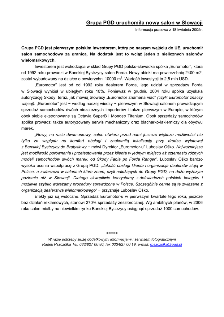 Grupa PGD uruchomiła nowy salon w Słowacji Informacja prasowa z 18 kwietnia 2005r. Grupa PGD jest pierwszym polskim inwestorem, który po naszym wejściu do UE, uruchomił salon samochodowy za granicą. Na dodatek jest to wciąż jeden z nielicznych salonów wielomarkowych. Inwestorem jest wchodząca w skład Grupy PGD polsko-słowacka spółka „Euromotor”, która od 1992 roku prowadzi w Banskiej Bystrzycy salon Forda. Nowy obiekt ma powierzchnię 2400 m2, został wybudowany na działce o powierzchni 10000 m2. Wartość inwestycji to 2,5 mln USD. „Euromotor” jest od od 1992 roku dealerem Forda, jego udział w sprzedaży Forda w Słowacji wyniósł w ubiegłym roku 10%. Ponieważ w grudniu 2004 roku spółka uzyskała autoryzację Skody, teraz, jak mówią Słowacy „Euromotor znamena viac” (czyli: Euromotor znaczy więcej). „Euromotor” jest − według naszej wiedzy − pierwszym w Słowacji salonem prowadzącym sprzedaż samochodów dwóch niezależnych importerów i także pierwszym w Europie, w którym obok siebie eksponowane są Octavia SuperB i Mondeo Titanium. Obok sprzedaży samochodów spółka prowadzi także autoryzowany serwis mechaniczny oraz blacharko-lakierniczy dla obydwu marek. „Nowy, na razie dwumarkowy, salon otwiera przed nami jeszcze większe możliwości nie tylko ze względu na komfort obsługi i znakomitą lokalizację przy drodze wylotowej z Banskiej Bystrzycy do Bratysławy − mówi Dyrektor „Euromotor-u” Luboslav Oško. Najważniejsza jest możliwość porównania i przetestowania przez klienta w jednym miejscu aż czternastu różnych modeli samochodów dwóch marek, od Skody Fabia po Forda Ranger”. Luboslav Oško bardzo wysoko ocenia współpracę z Grupą PGD. „Jakość obsługi klienta i organizacja dealerstw stoją w Polsce, a zwłaszcza w salonach które znam, czyli należących do Grupy PGD, na dużo wyższym poziomie niż w Słowacji. Dlatego skwapliwie korzystamy z doświadczeń polskich kolegów i możliwie szybko wdrażamy procedury sprawdzone w Polsce. Szczególnie cenne są te związane z organizacją dealerstwa wielomarkowego“ − przyznaje Luboslav Oško. Efekty już są widoczne. Sprzedaż Euromotor-u w pierwszym kwartale tego roku, jeszcze bez działań reklamowych, stanowi 270% sprzedaży zeszłorocznej. Wg ambitnych planów, w 2006 roku salon miałby na niewielkim rynku Banskiej Bystrzycy osiągnąć sprzedaż 1000 samochodów. ***** W razie potrzeby służę dodatkowymi informacjami i serwisem fotograficznym Radek Pszczółka Tel. 033/827 00 80, fax 033/827 00 19, e-mail: [email protected]