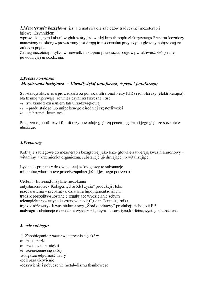 1.Mezoterapia bezigłowa jest alternatywą dla zabiegów tradycyjnej mezoterapii igłowej.Czynnikiem wprowadzającym koktajl w głąb skóry jest w niej impuls prądu elektrycznego.Preparat leczniczy naniesiony na skórę wprowadzany jest drogą transdermalną przy użyciu głowicy połączonej ze zródłem prądu. Zabieg mezoterapii tylko w niewielkim stopniu przekracza progową wrażliwość skóry i nie powodujejej uszkodzenia. 2.Proste równanie Mezoterapia bezigłowa = Ultradżwięki( fonoforeza) + prąd ( jonoforeza) Substancja aktywna wprowadzana za pomocą ultrafonoforezy (UD) i jonoforezy (elektroterapia). Na tkankę wpływają również czynniki fizyczne i tu : związane z działaniem fali ultradżwiękowej - prądu stałego lub unipolarnego ośredniej częstotliwości - substancji leczniczej Połączenie jonoforezy i fonoforezy powoduje głębszą penetrację leku i jego głębsze stężenie w obszarze. 3.Preparaty Koktajle zabiegowe do mezoterapii bezigłowej jako bazę głównie zawierają kwas hialuronowy + witaminy + krzemionka organiczna, substancje ujędrniające i rewitalizujące. Łysienie- preparaty do owłosionej skóry głowy to substancje mineralne,witaminowe,przeciwzapalne( jeżeli jest tego potrzeba). Cellulit - kofeina,fonzylane,mezokaina antystarzeniowe- Kolagen „U źródeł życia” produkcji Hebe przebarwienia – preparaty o działaniu hipopigmentacyjnym trądzik pospolity-substancje regulujące wydzielanie sebum teleangiektazje- rutyna,kasztanowiec,vit.C,asian Centella,arnika trądzik różowaty- Kwas hialuronowy „Źródło odnowy” produkcji Hebe , vit.PP, nadwaga- substancje o działaniu wyszczuplajacym- L-carnityna,koffeina,wyciąg z karczocha 4. cele zabiegu: 1. Zapobieganie procesowi starzenia się skóry zmarszczki zwiotczenie mięśni zcieńczenie się skóry -zwiększa odporność skóry -polepsza ukrwienie -odzywienie i pobudzenie metabolizmu tkankowego 2. Hamowanie wypadaniu włosów -poprawa odżywienia włosów -hamowanie ich wypadaniu 3 Przeciw cellulitowo -spalanie tkanki tłuszczowej -rozszerza naczynia krwionośne -dynamizowanie krążenia -uwalniają tłuszcze z komórek -pobudza regenerację tkanki łącznej -wyszczuplenie poddanych zabiegiem partii ciała 4.Przebarwienia -środki odbarwiające -spowolnienie syntezy melaniny -hamowanie tyrozyny - hamowanie tworzenia metanosomów 5.Trądzik pospolity -normalizację wydzielania sebum -poprawa ukrwienia -nawilżenie skóry 6.Blizny -środki działające zmniękczająco 7.Trądzik różowaty Tylko profilaktycznie ( W fazie zaostrzonej z wykwitami grudkowa-krostkowymi większość zabiegów kosmetycznych jest przeciwskazaniem,od II stopnia tylko z konsultacją lekarza ) likwitacja pozszerzonych naczyń krwionośnych wyciszające rumień odnowa płaszcza hydro-lipidowego 8.Nadwaga pobudzą mikrokrążenie rozkład 3-glicerydów przeciwobrzękowe wyszczupla modeluje sylwetkę 9.Skóra twarzy nawilżenie skóry ujędrnienie pobudzenie produkcji kolagenu i elastyny stymulują metabolizm komórek skóry 10. Dotlenienie dla cer zatrutą nikotyną 11.Cera zniszczona nadmierną ekspozycją na słońce i solarium 12. Zniszczona szkodliwymi czynnikami powietrza 13 dekold 5.przeciwskazania do mezoterapii jak w waszy skrypcie 6. Metodyka zabiegu na twarz na skórą nakładamy koktajl zabiegowy żel sprzegajacy zamykamy obwód opaską lub blachą głowice okrągłą płaską dobieramy mA do odczuć klientki robimy ruchy okrągłe po mięśniach po upływie czasu 20 minut zmieniamy na małą głowicę dobieramy mA opracowujemy 10 lub 20 min po mięśniach czas się konczy