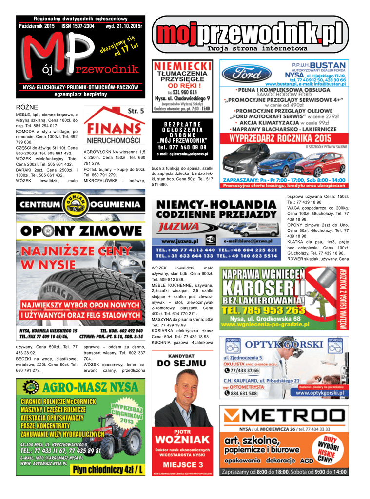 Regionalny dwutygodnik og³oszeniowy Październik 2015 ISSN 1507-2304 wyd. 21.10.2015r siê y m e uj lat ukaz od 17 NYSA G£UCHO£AZY PRUDNIK OTMUCHÓW PACZKÓW egzemplarz bezp³atny RÓŻNE MEBLE, kpl., ciemno brązowe, z witryną szklaną. Cena 180zł. do neg. Tel. 889 294 017. KOMODA w stylu windage, po remoncie. Cena 1300zł. Tel. 692 799 630. CZĘŚCI do dźwigu 6t i 10t. Cena 500-2000zł. Tel. 505 861 432. WÓZEK wielofunkcyjny Toto. Cena 200zł. Tel. 505 861 432. BARAKI 2szt. Cena 2500zł. i 1500zł. Tel. 505 861 432. WÓZEK inwalidzki, mało AGROWŁÓKNINA wiosenna 1,5 x 250m. Cena 150zł. Tel. 660 791 279. FOTEL bujany – kupię do 50zł. Tel. 660 791 279. MIKROFALÓWKĘ i lodówkę, BEZPŁATNE OGŁOSZENIA DROBNE „MÓJ PRZEWODNIK” tel. 077 448 09 09 e-mail: [email protected] buda z funkcją do spania, szelki do zapięcia dziecka, bardzo lekki, stan bdb. Cena 50zł. Tel. 517 511 680. brązowa używana Cena: 150zł. Tel.: 77 439 18 98 WAGA gospodarcza do 200kg. Cena 100zł. Głuchołazy. Tel. 77 439 18 98. OPONY zimowe 2szt do Uno. Cena 80zł. Głuchołazy. Tel. 77 439 18 98. KLATKA dla psa, 1m3, pręty bez ocieplenia. Cena 100zł. Głuchołazy. Tel. 77 439 18 98. ROWER składak, używany. Cena używany. Cena 500zł. Tel. 77 433 28 92. BECZKI na wodę, plastikowe, metalowe, 220l. Cena 50zł. Tel. 660 791 279. sprawne transport 704. WÓZEK erwono – oddam za darmo, własny. Tel. 602 337 spacerowy, kolor czczarny, przedłużona WÓZEK inwalidzki, mało używany, stan bdb. Cena 600zł. Tel. 509 812 539. MEBLE KUCHENNE, używane, 2,5szafki wiszące, 2,5 szafki stojące + szafka pod zlewozmywak + stół, zlewozmywak 2-komorowy, blaszany. Cena 400zł. Tel. 604 770 271. MASZYNA do pisania Cena: 50zł Tel.: 77 439 18 98 KOSIARKA elektryczna +kosz Cena: 50zł. Tel.: 77 439 18 98 KUCHNIA gazowa 4palnikowa BEZPŁATNE OGŁOSZENIA DROBNE „MÓJ PRZEWODNIK” tel. 077 448 09 09 [email protected] 964 401. PRALKA automatyczna Polar, sprawna. Cena 300zł. Tel. 604 964 401. MEBLE pokojowe, wysoki połysk, kolor ciemny brąz; szafo biblioteka-200zł., komoda – 100zł., ława - cena 80zł. Tel. 604 964 401. NAROŻNIK pokojowy, bordowy, stan bdb. Cena 700zł. Tel. 604 964 401. MEBLE kuchenne i do pokoju stołowego, kredens, szafka pod telewizor, + lodówka i pralka. Cena 400zł/całość. Tel. 793 537 377. DRZEWO suche. Cena 8zł./ worek. Tel. 881 789 212. TROCINY. Cena 1,50zł./worek. Tel. 881 789 212. ŻELAZKO nowe krawieckie. 100zł. Tel. 77 439 18 98. MASZYNA do szycia Łucznik, używana. Cena 150zł. Tel. 77 439 18 98. GARNEK gliniany 20L. Cena 100zł. Tel. 77 439 18 98. KUCHNIA elektryczna, 4-palnikowa + piekarnik, brązowa, nieużywana, nowa. Cena 500zł. Tel. 77 439 18 98. BLAT nowy, marmurowy, kolorowy średni brąz, 60x180cm. Cena 800zł. Tel. 77 439 18 98 KARNISTRY na paliwo, 20L, 10szt. Cena 20zł./szt. Tel. 604 str. BEZPŁATNE OGŁOSZENIA DROBNE, tel. 77 448 09 09 pn. - pt. od 9.00 - 17.00, [email protected], www.mojprzewodnik.pl Cena: 50zł. Tel.: 880 372 605. LAMPA oświetleniowa stojąca na dwie żarówki. Cena 50zł do negocjacji. Tel.: 880 372 605. KURTKI skórzane damskie kolor czarny. Cena: 50-80zł do negoc- BEZPŁATNE OGŁOSZENIA DROBNE „MÓJ PRZEWODNIK” tel. 077 448 09 09 [email protected] jacji. Tel.: 880 372 605. SPODNIE skórzane. Cena 4050zł do negocjacji. Tel.: 880 372 605. PŁASZCZ skórzany na szczupłą osobę, kolor brąz 165cm. Cena 150zł do negocjacji. Tel.: 880 372 605. PŁASZCZ skórzany damski, długi, z kapturem, na większą osobę, kolor szary, 170cm. Cena 150zł do negocjacji. Tel.: 880 372 605. KOŻUCH nowy 3/4. Cena 150zł do negocjacji. Tel.: 880 372 605. FUTRO z nutrii wzrost 168. Cena 100zł do negocjacji. Tel.: 880 372 605. CZAPKA z nutrii. Cena 30zł. Tel. 880 372 605. CZAJNIK bezprzewodowy. Cena 40zł. Tel. 880 372 605. KOŻUCH męski, nowy, kolor czarny, wzrost 175-180cm. Cena 120zł. Tel. 880 372 605. KURTKA męska, skórzana, nowa, wzrost 175-180cm, brązowa. Cena 300zł. Tel. 880 372 605. KURTKA skórzana, kolor wiśniowy, wzrost 175-180cm. Cena 200zł. Tel. 880 372 605. wzrost 175-180cm. Cena 60zł. SPODNIE skórzane. Cena 100zł. Tel. 880 372 605. Tel. 880 372 605. PÓŁBUTY KURTKA skórzana, kolor czarny. prawie nowe, rozm. 41. Cena Cena 150zł. Tel. 880 372 605. 40zł. Tel. 880 372 605. PŁASZCZ zimowy z podpinką, SPODNIE kolor czarna kawa z mlekiem, wzrost 175-180cm. Cena 20zł. BEZPŁATNE OGŁOSZENIA DROBNE, tel. 77 448 09 09 pn. - pt. od 9.00 - 17.00, [email protected], www.mojprzewodnik.pl skórzane, dżinsowe, męskie, męskie, str. BEZPŁATNE OGŁOSZENIA DROBNE „MÓJ PRZEWODNIK” tel. 077 448 09 09 [email protected] Tel. 880 372 605. KURTKA zimowa z kożuchem, wzrost 175-180cm. Cena 60zł. Tel. 880 372 605. ODKURZACZ Celmer, Admirał. Cena 60zł. Tel. 880 372 605. ROWER z przerzutkami, koła 28’. Cena 250zł. Tel. 880 372 605. DYWAN, kolor niebieski, 2.5 x 1.80m. Cena 50zł. Tel. 880 372 605. WAGA kuchenna. Cena 50zł. Tel. 880 372 605. KPL. KÓŁ do górala. Cena 60zł. Tel. 880 372 605. SZAFA 2-drzwiowa 210 x 90 x 60. Cena 90zł. Tel. 880 372 605. TOSTER. Cena 40zł. Tel. 880 372 605. DYWAN 235x160, kolo jasny, niezniszczony. Cena 80zł. Tel. 880 372 605. LAMPKI nocne. Cena 30zł. Tel. 880 372 605. ZLEWOZMYWAK 2-komorowy, nierdzewny. Cena 50zł. Tel. 880 372 605. PILARKA do drewna, stołowa 5kW. Cena 400zł. Tel. 795 128 464. PILARKA do drewna, stołowa 3kW. Cena 250zł. Tel. 795 128 464. KOŻUCH damski, beżowy, wzrost 160cm, krótki. Tel. 77 433 48 74. GARNITUR męski, nowy, kolor ciemny, na szczupłą osobę, wzrost 175cm. Cena 120zł. Tel. 77 433 48 74. AMERYKANKA szer. 115cm, dł. 210cm. Cena 100zł. Tel. 600 883 005. AMERYKANKA, szer. 90cm, dł. 190cm. Cena 100zł. Tel. 600 883 005. PRALKA Frania. Cena 100zł. Tel. 600 883 005. GRILL elektryczny, nowy. Cena 140zł. Tel. 600 883 005. POMPA elektryczna, nowa, moc 720W. Cena 150zł. Tel. 600 883 005. KILIMY 2szt. Cena 25zł./szt. Tel. 600 883 005. SILNIK elektrycz