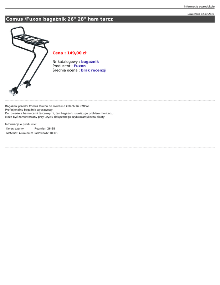Informacje o produkcie Utworzono 04-03-2017 Comus /Fuxon bagażnik 26" 28" ham tarcz Cena : 149,00 zł Nr katalogowy : bagażnik Producent : Fuxon Średnia ocena : brak recenzji Bagażnik przedni Comus /Fuxon do rowrów o kołach 26 i 28cali Profesjonalny bagażnik wyprawowy. Do roweów z hamulcami tarczowymi, ten bagażnik rozwiązuje problem montarzu Może być zamontowany przy użyciu dołączonego szybkozamykacza piasty Informacje o produkcie: Kolor: czarny Rozmiar: 26-28 Materiał: Aluminium ładowność 10 KG