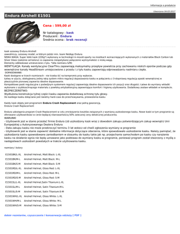 Informacje o produkcie Utworzono 04-03-2017 Endura Airshell E1501 Cena : 599,00 zł Nr katalogowy : kask Producent : Endura Średnia ocena : brak recenzji kask szosowy Endura Airshell zawodniczy, szosowy model, w którym jeździ min. team NetApp Endura NISKA WAGA: Super lekki kask (220g*) wykonany w technologii in-mould oparty na mostkach wzmacniających wykonanych z materiałów Black Carbon lub Silver Glass (zależnie od koloru) co zapewnia niespotykane połączenie wytrzymałości z niską wagą. Elementy odblaskowe umieszczone z tyłu. *(dla rozmiaru S/M) WENTYLACJA: Kanały wentylacyjne ClearThru zapewniają maksymalny przepływ powietrza przy zachowaniu niskich oporów podczas gdy wewnętrzne kanały HeadStream umiejscowione z przodu i z tyłu kasku zapewniają odprowadzaniu nadmiaru ciepła. DOPASOWANIE: Kaski dostępne w trzech rozmiarach - nie trzeba iść na kompromis przy wyborze. Łatwy w użyciu, obsługiwany jedną ręką system mikro regulacji dopasowania kasku w połączeniu z 3-stopniową regulacją opaski wewnętrznej w płaszczyźnie pionowej zapewnia idealne dopasowanie. Kompaktowe paski regulacyjne z podwójnym systemem regulacji zapewniają idealne dopasowanie ich pozycji oraz długości. Łatwe do wymiany wkładki wykonane z szybkoschnącego materiału z powłoką antybakteryjną zapewniające komfort i higienę użytkowania. Dodatkowy zestaw wkładek w komplecie. BEZPIECZEŃSTWO: Wydłużona konstrukcja tylnej części kasku zapewnia dodatkową ochronę tyłu głowy. Do każdego kasku dołączane jest świetny hard-case do przechowywania, przewożenia kasku Każdy kask objęty jest programem Endura Crash Replacement oraz pełną gwarancją. Endura Crash Replacement Endura udostępnia program Crash Replacement w celu zmniejszenia kosztów związanych z wymianą uszkodzonego kasku. Nowe kaski w tym programie są oferowane użytkownikowi w cenie będącej równowartością 50% zalecanej ceny detalicznej producenta. WARUNKI - Użytkownik jest w stanie przesłać firmie Endura Ltd uszkodzony kask wraz z dowodem zakupu potwierdzającym zakup wewnątrz Unii Europejskiej u Autoryzowanego Dealera Endura - Data zakupu kasku nie może przekroczyć terminu 3 lat wstecz od chwili zgłoszenia wymiany w programie - Użytkownik jest w stanie zapewnić dokładne informacje dotyczące zdarzenia, które spowodowało uszkodzenie kasku. Należy pamiętać, że uszkodzenia kasku spowodowane zaniedbaniem w stosunku do kasku takie jak np. przejechanie samochodem po kasku czy narażenie kasku na działanie ognia nie będą uznawane jako podstawa do wymiany kasku w programie, ponieważ program został stworzony z myślą o następstwach uszkodzeń powstałych w trakcie użytkowania kasku. rozmiary i kolory E1501BK/L-XL Airshell Helmet, Matt Black: L-XL E1501BK/M-L Airshell Helmet, Matt Black: M-L E1501BK/S-M Airshell Helmet, Matt Black: S-M E1501RD/L-XL Airshell Helmet, Gloss Red: L-XL E1501RD/M-L Airshell Helmet, Gloss Red: M-L E1501RD/S-M Airshell Helmet, Gloss Red: S-M E1501SL/L-XL Airshell Helmet,Satin Titanium:L-XL E1501SL/M-L Airshell Helmet, Satin Titanium:M-L E1501SL/S-M Airshell Helmet, Satin Titanium:S-M E1501WH/L-XL Airshell Helmet, Gloss White: L-XL E1501WH/M-L Airshell Helmet, Gloss White: M-L E1501WH/S-M Airshell Helmet, Gloss White: S-M dobór rozmiarów, czyszcczenie i konserwacja odzieży [ PDF ] Dostępne opcje Endura Airshell E1501 Kolor: Wybierz kolor, Czarny, Czerwony, Biały, Czarno-niebieski, Szary. Rozmiar: Wybierz rozmiar, S/M, M/L, L/XL.