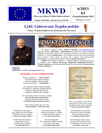 MKWD 6/2013 63 (Muzyczny Kabaret Wojtka Dąbrowskiego) 10 października 2013 Organ niezależny ukazuje się co 50 dni 3450 dni p.w. do UE Cykl: Całoroczna Szopka polska Teksty: Wojciech Dąbrowski (Zasłużony dla Warszawy) W sierpniu redakcja portalu Fabrica Librorum www.portalliteracki.pl ogłosiła konkurs Rymowisko z palindromami. Konkursowa zabawa literacka polegała na ułożeniu krótkich 4-5 wersowych utworów rymowanych (fraszki, limeryki), z użyciem palindromów, czyli krótkich zwrotów tak samo brzmiących przy czytaniu z lewej strony do prawej jak i wspak. Listę konkursowych palindromów do wykorzystania opracował prof. Tadeusz Morawski. MKWD wziął udział w zabawie i… zdobył I nagrodę, przyznaną przez jury w składzie: prof. Tadeusz Morawski, Małgorzata Krupińska-Nowicka i Wanda Stańczak (przewodnicząca II Oddziału warszawskiego Stowarzyszenia Autorów Polskich). nr 33 (673), 29 sierpnia 2013 roku FRASZKI Z PALINDROMAMI Wczasy na Majorce → i laba na Bali. ← Tak pobożni popi wakacje spędzali. Razem się kąpali, jeden się utopił. Więc go pochowali. → I popili popi. ← Raz Andrzej, heteryk, miłością zapałał, Lecz płonna w Andrzeja wstąpiła nadzieja, Bo diwa z opery innego wybrała, → A jego nie chciała i chce ino geja. ← Nie chciał ładny Romek siedzieć na jabłoni, → Ino gile Roman na moreli goni, ← Więc go powiesili i liczyć zaczęli → Ile Roman ładny dyndał na moreli. ← Choć ruch niewielki, lato czy zima → Ma mirabelki w ćwikle Bar Imam. Mer, co za kołnierz nie wylewał, Rzekł: Raz się żyje i dał w szyję. Rozdając premie, głośno śpiewał: → Ej, i po premii mer popije. ← Włodek liczne ma zalety, Lecz kobiety nie chcą Włodka. Włodek nie ma psa, niestety, → A kto psy ma, damy spotka. ← Iwan rankiem pływał łódką, Pijąc rum zmieszany z wódką. → A na rzece hece z rana, ← → A na wigor grog Iwana. ← Kazia Smerfów się nie bała, Wszystkie w kufrze zamykała. Nic już Kazi nie przerazi. → I za kufrem Smerf u Kazi. ← Wychwalano piosenkarza, Zapraszano za ocean. Czy ktoś sobie wyobraża → Na epika taki pean? ← Aga była naturystką. Przy narciarzach zdjęła wszystko, I na stoku, to nie blaga, → Aga nagim śmiga naga. ← Przed kantyną stał na warcie, Strzegąc działa, biedny skaut. Co ważniejsze: broń czy żarcie? → Tu armata, a tam raut. ← str. 2 MKWD, nr 6 (63) /2013, Warszawa, 10 października 2013 roku (3450 dni po wstąpieniu do UE) Przekrój numer pierwszy (15 kwietnia 1945) i ostatni (3555, 30 września 2013) nr 39 (679), 10 października 2013 roku MOJA PRZYGODA Z PRZEKROJEM Odkąd pamiętam, życie moje ściśle wiązało się z Przekrojem. Jestem Przekroju rówieśnikiem, Starszy zaledwie dwa miesiące! Zostałem wiernym czytelnikiem, Dość wcześnie, będąc jeszcze brzdącem. Rozmaitości w poprzek strony, Własny rysunek na okładce. A kiedy numer był skończony, Co tydzień sprzedawałem matce. Mieszkałem wówczas tuż nad Wisłą, Skąd z okna widok był na Wawel, A Przekrój sprzyjał mym pomysłom I zastępował mi zabawę. Gazetka, przyznam to nieskromnie, Trafiła prosto do Eilego, A ten napisał list i do mnie Zaczął się zwracać per kolego! Koledzy raczej szli na Kopiec, Biegli na Błonia, grali w berka, Ze mnie był nieco dziwny chłopiec, Nudził mnie Świerszczyk i Iskierka. I to nie koniec niespodzianek. Do dzisiaj serce mi łomocze! Zaproponował mi wymianę: Co tydzień Przekrój za Obłoczek. Wolałem ślęczeć w swym pokoju, Samotnie, nie wiem sam, dlaczego, I przeglądałem stos Przekrojów, Wszystkie numery, od pierwszego. Więc ja, obrotem spraw zdumiony, Nie wyłączając dni wakacji, Biegłem z Obłoczkiem uskrzydlony Po nowy Przekrój do redakcji. Lektura była wyśmienita I Przekrój mnie opętać zdołał, Szybko nauczył pisać, czytać, Zanim zajęła się mną szkoła. Któż tam nie pisał! O mój Boże! Uczta duchowa co niedzielę: Zielona Gęś, Gałczyński, Mrożek, Teodor Klon, zwany Kisielem, Do dziś pamiętnik się zachował (Dla czytelników rzadka gratka), Gdzie opisałem w prostych słowach Historie z życia… pięciolatka. Juliusz Kydryński, brat Lucjana… Lista autorów jest obszerna. Czytałem wszystko: Sartra, Manna I satyryczne wiersze Kerna. Powiecie: bujda! Stary grzeszy! Nie uwierzycie? Sprawdźcie sami, Że zapisałem cały zeszyt Drukowanymi literami. Do dziś cytować mi się zdarza Myśli Fafika i Wacusia, Choć prosił Kern, by nie powtarzać, Kilka przypomnieć będę musiał. Pisałem rano i wieczorem I tym z pewnością was zaskoczę: Wkrótce zostałem redaktorem Pisma, co zwało się Obłoczek. Zdjęcia z okładek Plewińskiego, Po teatralnych wiodły scenach. Nie było jeszcze Raczkowskiego, Za to Filutek był Lengrena, Redakcja była w mym pokoju, Druk tylko w jednym egzemplarzu. Szesnaście kolumn, jak w Przekroju, Lecz dobre wzory, to nie zarzut. Grafiki Mroza i Wiśniaka I reprodukcje dzieł Picassa. Sami przyznacie: dla dzieciaka To edukacja pierwsza klasa. MKWD, nr 6 (63) /2013, Warszawa, 10 października 2013 roku (3450 dni po wstąpieniu do UE) Bon tonu uczył mnie Kamyczek, Choć Jan Kamyczek był kobietą! Wszystkich korzyści nie wyliczę. Ileż zawdzięczam dziś poetom! Nasza znajomość trwała długo, Za nią dziękuję skromnym gestem, Bo to Przekroju jest zasługą, Że jestem taki jaki jestem. Dzieliłem z wami wszystkie sprawy, Choć osobiście mnie nie znacie. Gdy się przeniosłem do Warszawy. To Przekrój za mną! Jak przyjaciel. Gdy dziś dotarła wieść hiobowa, Że Przekrój już się nie ukaże, Zostały tylko gorzkie słowa, Że mój świat ginie w wirze zdarzeń. nr 36 (676), 19 września 2013 roku Żaden nie sieje, ani nie orze, Chce przywilejów, sam nie pomoże. HEJ, TAM POD LASEM… Grają na dudach… nowa wersja piosenki biesiadnej Ten co na co dzień do trzech nie zliczy, Najwięcej żąda, najgłośniej krzyczy. Hej, tam pod lasem coś błyszczy z dala