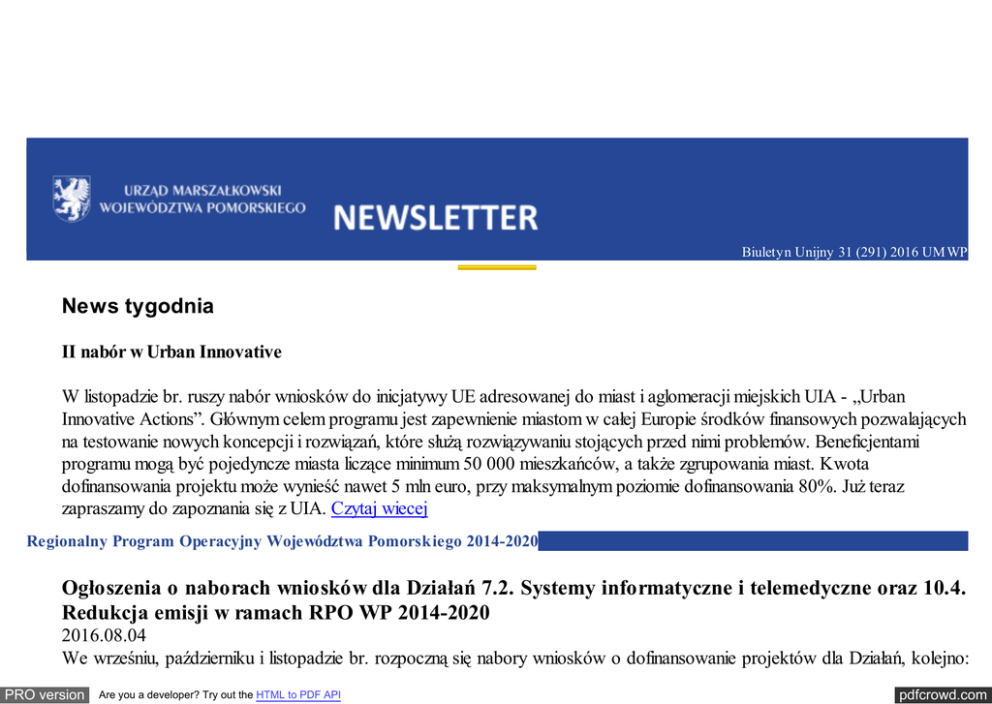 Biuletyn Unijny 31 (291) 2016 UM WP News tygodnia II nabór w Urban Innovative W listopadzie br. ruszy nabór wniosków do inicjatywy UE adresowanej do miast i aglomeracji miejskich UIA - „Urban Innovative Actions”. Głównym celem programu jest zapewnienie miastom w całej Europie środków finansowych pozwalających na testowanie nowych koncepcji i rozwiązań, które służą rozwiązywaniu stojących przed nimi problemów. Beneficjentami programu mogą być pojedyncze miasta liczące minimum 50 000 mieszkańców, a także zgrupowania miast. Kwota dofinansowania projektu może wynieść nawet 5 mln euro, przy maksymalnym poziomie dofinansowania 80%. Już teraz zapraszamy do zapoznania się z UIA. Czytaj wiecej Regionalny Program Operacyjny Województwa Pomorskiego 2014-2020 Ogłoszenia o naborach wniosków dla Działań 7.2. Systemy informatyczne i telemedyczne oraz 10.4. Redukcja emisji w ramach RPO WP 2014-2020 2016.08.04 We wrześniu, październiku i listopadzie br. rozpoczną się nabory wniosków o dofinansowanie projektów dla Działań, kolejno: PRO version Are you a developer? Try out the HTML to PDF API pdfcrowd.com 10.4. Redukcja emisji (typy projektów 4) i 5)), 7.2. Systemy informatyczne i telemedyczne oraz 10.4. Redukcja emisji (typy projektów 1), 2) i 3)) w ramach Regionalnego Programu Operacyjnego na lata 2014-2020. Czytaj więcej Opublikowano nowe akty wykonawcze w związku z nowelizacją ustawy Pzp 2016.08.04 Informujemy, że zostały opublikowane następujące akty wykonawcze do ustawy z dnia 29 stycznia 2004 r. Prawo zamówień publicznych, zmienionej ustawą z dnia 22 czerwca 2016 r. o zmianie ustawy Prawo zamówień publicznych oraz niektórych innych ustaw (Dz. U. poz. 1020). Czytaj więcej Nowa wersja Podręcznika Beneficjenta SL2014 2016.08.03 Uprzejmie informujemy, że na stronach Regionalnego Programu Operacyjnego Województwa Pomorskiego na lata 2014-2020 (RPO WP 2014-2020) – www.rpo.pomorskie.eu udostępniony został Podręcznik Beneficjenta SL2014 (Instrukcja użytkownika B) w wersji 1.5 uzupełniony o zapisy dotyczące RPO WP 2014-2020. Niniejszy dokument obowiązuje od 3 sierpnia br.” Czytaj więcej Główny Punkt Informacyjny Funduszy Europejskich Spotkanie informacyjne w Gdańsku: „Odnawialne źródła energii i ochrona środowiska - Fundusze Europejskie w perspektywie 2014-2020” 2016.08.04 Lokalny Punkt Informacyjny Funduszy Europejskich w Gdańsku zaprasza na spotkanie informacyjne organizowane 24 sierpnia 2016 r. poświęcone możliwościom pozyskania wsparcia przez przedsiębiorców na rzecz odnawialnych źródeł energii i ochrony środowiska ze środków pochodzących z Unii Europejskiej w perspektywie finansowej na lata 2014-2020. Czytaj więcej Spotkania informacyjne w Kwidzynie i Smętowie Granicznym: „Wsparcie dla osób młodych w ramach Poddziałania 1.2.1 PO WER 2014-2020” 2016.08.04 Lokalny Punkt Informacyjny Funduszy Europejskich w Malborku zaprasza na spotkania informacyjne organizowane 24 i 31 sierpnia 2016 r., dotyczące możliwości wsparcia osób młodych do 29 roku życia bez pracy, w tym w szczególności osób, które nie uczestniczą w kształceniu i szkoleniu (tzw. młodzież NEET). Czytaj więcej PRO version Are you a developer? Try out the HTML to PDF API pdfcrowd.com Mobilny Punkt Informacyjny w Gdańskim Parku Naukowo-Technologicznym 2016.08.04 Główny Punkt Informacyjny Funduszy Europejskich w Gdańsku zaprasza na bezpłatne konsultacje w zakresie możliwości uzyskania wsparcia ze środków Unii Europejskiej w ramach Mobilnego Punktu Informacyjnego. Czytaj więcej Mobilne Punkty Informacyjne na Pomorzu - SIERPIEŃ 2016 2016.08.04 Serdecznie zapraszamy do skorzystania z działań Mobilnych Punktów Informacyjnych na Pomorzu. Czytaj więcej Europejska Współpraca Terytorialna Zatwierdzono pierwsze projekty seed money 2016.08.04 W I naborze Seed Money Programu Interreg Południowy Bałtyk 2014-2020 wybrano 19 projektów. W zdecydowanej większości partnerem wiodącym są instytucje z Polski (12 projektów). Czytaj więcej PRO version Are you a developer? Try out the HTML to PDF API pdfcrowd.com ze środków Europejskiego Funduszu Rolnego na rzec z Rozwoju Obszarów Wiejskic h w ramac h PROW oraz ze środków budżetu Samorządu Województwa Pomorskiego. PRO version Are you a developer? Try out the HTML to PDF API pdfcrowd.com
