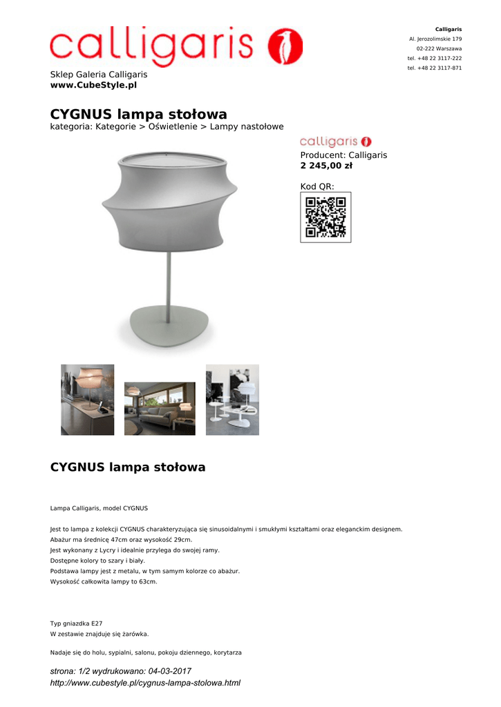 Calligaris Al. Jerozolimskie 179 02-222 Warszawa tel. +48 22 3117-222 tel. +48 22 3117-871 Sklep Galeria Calligaris www.CubeStyle.pl CYGNUS lampa stołowa kategoria: Kategorie > Oświetlenie > Lampy nastołowe Producent: Calligaris 2 245,00 zł Kod QR: CYGNUS lampa stołowa Lampa Calligaris, model CYGNUS Jest to lampa z kolekcji CYGNUS charakteryzująca się sinusoidalnymi i smukłymi kształtami oraz eleganckim designem. Abażur ma średnicę 47cm oraz wysokość 29cm. Jest wykonany z Lycry i idealnie przylega do swojej ramy. Dostępne kolory to szary i biały. Podstawa lampy jest z metalu, w tym samym kolorze co abażur. Wysokość całkowita lampy to 63cm. Typ gniazdka E27 W zestawie znajduje się żarówka. Nadaje się do holu, sypialni, salonu, pokoju dziennego, korytarza strona: 1/2 wydrukowano: 04-03-2017 http://www.cubestyle.pl/cygnus-lampa-stolowa.html Wymiary i waga: 47 cm 63 cm Czas dostawy: 6-8 tygodni Dostępne wersje: Structure strona: 2/2 wydrukowano: 04-03-2017 http://www.cubestyle.pl/cygnus-lampa-stolowa.html 47 cm 8.6 kg