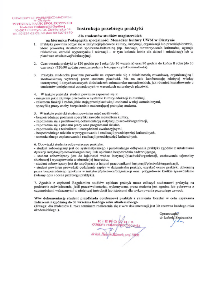 U N IW E R S Y T E T W A R M IŃ SK O -M AZU R SK I w Olsztynie WYDZiAŁ NAUK SPOŁECZNYCH io -5 sT o isiy n ! u?żótnPerski i4 Instrukcja przebiegu praktyki tel. 89 524 62 69, tel./fax 89 527 51 70 dla studentów studiów magisterskich na kierunku Pedagogika specjalność: Menadżer kultury UWM w Olsztynie 1. Praktyka powinna odbyć się w instytucji/placówce kultury, instytucji, organizacji lub przedsiębiorstwie, które prowadzą działalność społeczno-kulturalną (np. fundacje, stowarzyszenia kulturalne, agencje reklamowe, ośrodki wypoczynku i rekreacji — w tym kolonie letnie dla dzieci i młodzieży) lub w placówce oświatowej/edukacyjnej. 2. Czas trwania praktyki to 120 godzin po I roku (do 30 września) oraz 90 godzin do końca II roku (do 30 czerwca) (120/90 godzin oznacza godziny lekcyjne czyli 45-minutówki). 3. Praktyka studencka powinna pozwolić na zapoznanie się z działalnością zawodową, organizacyjną i środowiskową wybranej przez studenta placówki. Ma na celu konfrontację zdobytej wiedzy teoretycznej i dotychczasowych doświadczeń animatorsko-menadżerskich, jak również kształtowanie u studentów umiejętności zawodowych w warunkach naturalnych placówki. 4. W trakcie praktyki student powinien zapoznać się z: - miejscem jakie zajmuje placówka w systemie kultury/edukacji kulturalnej, - zakresem funkcji i zadań jakie stoją przed placówką i osobami w niej zatrudnionymi, - specyfiką pracy osoby bezpośrednio nadzorującej praktykę studenta. 5. W trakcie praktyki student powinien mieć możliwość: - bezpośredniego poznania specyfiki zawodu menadżera kultury, - zapoznania się z podstawową dokumentacją instytucji/placówki/organizacji, - zapoznania się z planami pracy oraz programami działań, - zapoznania się z technikami i narzędziami ewaluacyjnymi, - bezpośredniego udziału w przygotowaniu i realizacji przedsięwzięć kulturalnych, - samodzielnego zaplanowania i realizacji przedsięwzięć kulturalnych. 6. Obowiązki studenta odbywającego praktykę: - student zobowiązany jest do systematycznego i punktualnego odbywania praktyki zgodnie z ustaleniami dyrekcji instytucji/placówki/organizacji lub opiekuna bezpośrednio nadzorującego, - student zobowiązany jest do lojalności wobec instytucji/placówki/organizacji, zachowania tajemnicy służbowej i występowania w obronie jej interesów, - student zobowiązany jest do współpracy z innymi pracownikami instytucji/placówki/organizacji, - student powinien prowadzić codziennie zapisy w dzienniczku praktyk, uzyskać ocenę praktyki dokonaną przez bezpośredniego opiekuna w instytucji/placówce/organizacji oraz przygotować krótkie sprawozdanie (własny opis i ocena przebiegu praktyki). 7. Zgodnie z zapisami Regulaminu studiów opiekun praktyk może zaliczyć studentowi praktykę na podstawie zaświadczenia, jeśli praca/wolontariat, wykonywana przez studenta jest zgodna lub pokrewna z czynnościami wskazanymi w niniejszej instrukcji lub istotnymi dla wykonywania przyszłego zawodu W/w dokumentację student przedkłada opiekunowi praktyk z ramienia Uczelni w celu uzyskania zaliczenia najpóźniej do 30 września każdego roku akademickiego. (Uwaga: dla studentów II roku terminem rozliczenia się z w/w dokumentacji jest 30 czerwca każdego roku akademickiego!). Opracowana: dr Izabelą Szątrawska K I E R fO KATEDRY PEDAGC NI K T^G ^N EJ