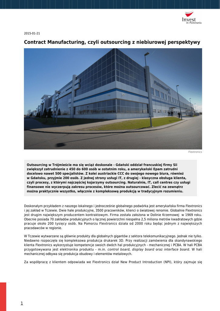 2015-01-21 Contract Manufacturing, czyli outsourcing z niebiurowej perspektywy Flextronics Outsourcing w Trójmieście ma się wciąż doskonale - Gdański oddział francuskiej firmy Sii zwiększył zatrudnienie z 450 do 600 osób w ostatnim roku, a amerykański Epam zatrudni docelowo nawet 500 specjalistów. Z kolei austriackie CCC do swojego nowego biura, również w Gdańsku, przyjmie 200 osób. Z jednej strony usługi IT, z drugiej - klasyczna obsługa klienta, czyli procesy, z którymi najczęściej kojarzymy outsourcing. Naturalnie, IT, call centres czy usługi finansowe nie wyczerpują zakresu procesów, które można outsourcować. Zlecić na zewnątrz można praktycznie wszystko, włącznie z kompleksową produkcją w tradycyjnym rozumieniu. Doskonałym przykładem z naszego lokalnego i jednocześnie globalnego podwórka jest amerykańska firma Flextronics i jej zakład w Tczewie. Dwie hale produkcyjne, 3500 pracowników, klienci o światowej renomie. Globalnie Flextronics jest drugim największym producentem kontraktowym. Firma została założona w Dolinie Krzemowej w 1969 roku. Obecnie posiada 70 zakładów produkcyjnych o łącznej powierzchni niespełna 2,5 miliona metrów kwadratowych gdzie pracuje około 200 tysięcy osób. Na Pomorzu Flextronics działa od 2000 roku będąc jednym z największych pracodawców w regionie. W Tczewie wytwarzane są głównie produkty dla globalnych gigantów z sektora telekomunikacyjnego. Jednak nie tylko. Niedawno rozpoczęła się kompleksowa produkcja drukarek 3D. Przy realizacji zamówienia dla skandynawskiego klienta Flextronics wykorzystuje kompetencje swoich dwóch hal produkcyjnych - mechanicznej i PCBA. W hali PCBA przygotowywana jest elektronika produktu - m.in. control board, display board oraz interface board. W hali mechanicznej odbywa się produkcja obudowy i elementów metalowych. Za współpracę z klientem odpowiada we Flextronics dział New Product Introduction (NPI), który zajmuje się 1 wdrażaniem nowych produktów do masowej produkcji. Wydzielony w strukturach firmy departament NPI jest kompleksowo funkcjonującą jednostką, posiadającą własny magazyn, linię produkcyjną czy testy. Także zespół NPI tworzą specjaliści z różnych dziedzin – inżynierowie, operatorzy, logistycy, inspektorzy jakości, którzy zapewniają klientom całościową realizację prototypowych zamówień. Dział NPI zajmował się również projektem drukarki 3D. W pierwszym etapie współpracy inżynierowie wspierali rozwój designu, wpływali na ewaluację produktu oraz implementację oszczędnościowych i funkcjonalnych ulepszeń. To właśnie we Flextronics powstał prototyp drukarki 3D i sam produkt został przygotowany do masowej produkcji, która jest teraz realizowana w tczewskiej fabryce. Obecnie Flextronics przygotowuje się do wdrożenia usługi direct fulfilment dla tego produktu. - Projekt industralizacji drukarki 3D doskonale wpisuje się w strategię naszego oddziału, który kładzie nacisk na rozwój vertical integration. Możliwość prodkucji elektroniki oraz elementów metalowych w tej samej fabryce zapewnia naszym klientom oszczędności finansowe i czasowe, a także bezpieczeństwo – mówi Stanisław Motylski, Program Management and Business Development Director z Flextronics International Poland Sp. z o.o. Drukarka 3D składa się z ponad 100 komponentów metalowych, 500 komponentów kupowanych i waży 139 kg. Sprzedawana jest na terenie Europy, przede wszystkim klientom, którzy potrzebują wysokiej jakości wydruku. To co wyróżnia drukarkę produkowaną we Flextronics to brak konieczności stosowania dodatkowych materiałów pomocniczych i fikstur, a także możliwość drukowania kilku różnych komponentów w trakcie tego samego procesu. Korzyści z outsourcingu produkcji są oczywiste. Po pierwsze redukowane są koszty - zamawiający nie musi inwestować w hale produkcyjne ani technologie, a producent kontraktowy może zaproponować niższe ceny z racji ekonomii skali (obsługa wielu klientów). Co więcej, czołowi kontraktorzy zapewniają swoim klientom najwyższą jakość produktów, łącznie z pracami prototypowymi. Tak jak w przypadku outsourcingu usług biznesowych i informatycznych niezwykle zajmującą i ważną (z perspektywy rozwoju gospodarczego regionów) jest kwestia kierunków lokowania nowych centrów, tak na koniec rozważań o outsourcingu produkcji można się zastanowić, jakie czynniki decydują o lokalizacji zakładów producentów kontraktowych. - Tczew jest bardzo dobrą lokalizacją dla polskiego oddziału Flextronics ze względu na kilka czynników. Jednym z najważniejszych jest dostęp do pracowników o różnych kwalifikacjach. Jako firma zatrudniająca 3 500 osób i zapewniająca klientom kompleksowe usługi, od projektowania i ewaluacji produktów, poprzez produkcję, aż po transport do klientów końcowych, potrzebujemy zarówno wykształconych inżynierów, specjalistów ds. jakości, zakupów czy logistyki, jak i wielu pracowników produkcyjnych – operatorów produkcji, monterów, spawaczy, lutowaczy. Kolejną ważną korzyścią naszej lokalizacji jest bliskość lotniska oraz portów. Bardzo cieszy nas rozwój infrastruktury drogowej oraz terminali kontenerowych w Gdańsku i Gdyni – mówi Andrzej Połojko, Dyrektor Generalny w Flextronics International Poland Sp. z o.o. Niewątpliwie, outsourcing produkcji jest procesem opłacalnym. Tym bardziej opłacalnym, im korzystniejsza jest lokalizacja zakładów produkcyjnych kontraktora. Autor Mikołaj Trunin [email protected] 2