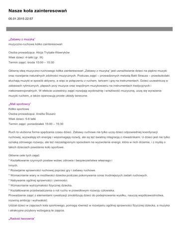 Nasze koła zainteresowań 05.01.2015 22:57 „Zabawy z muzyką” muzyczno-ruchowe kółko zainteresowań Osoba prowadząca: Alicja Trybała-Wawryków Wiek dzieci: 4-latki (gr. III) Termin zajęć: środa 15:00 – 15:30 Główną ideą muzyczno-ruchowego kółka zainteresowań „Zabawy z muzyką” jest uwrażliwianie dzieci na piękno muzyki oraz rozwijanie naturalnych zdolności muzycznych. Podczas zajęć – prowadzonych metodą Batii Strauss – przedszkolaki słuchają muzyki w sposób aktywny, a więc w połączeniu z ruchem, tańcem i grą na instrumentach. Dzieci uczestniczą w zabawach rytmicznych, pląsach przy muzyce oraz wspólnym muzykowaniu na instrumentach tradycyjnych i niekonwencjonalnych. W efekcie uczestnicy zajęć rozwijają wyobraźnię i wrażliwość muzyczną, uczą się wyrażania muzyki ruchem, a także opanowują proste układy taneczne. „Mali sportowcy” Kółko sportowe Osoba prowadząca: Anetta Ślusarz Wiek dzieci: 5-6 latki Termin zajęć: poniedziałek 15:00 – 15:30 Ruch to ulubiona forma spędzania czasu dzieci. Zabawy ruchowe nie tylko uczą dzieci odpowiedniej koordynacji ruchowej, wyzwalają ich energię i wspomagają rozwój, ale są też świetną integracją z rówieśnikami. U dzieci jest nie tylko oznaką zdrowego rozwoju, ale też niezastąpionym sposobem na wyzwolenie energii, która w nich drzemie, i z myślą o takich dzieciach powstanie koło sportowe. Główne cele tych zajęć: * Kształtowanie czynnych postaw wobec zdrowia i bezpieczeństwa własnego i innych. * Rozwijanie sprawności ruchowej poprzez gry i zabawy ruchowe. * Wzmacnianie wiary w możliwości dziecka podczas pokonywania coraz trudniejszych zadań ruchowych. * Nabywanie ogólnej sprawności i zwinności. * Wzmacnianie wytrzymałości fizycznej dziecka. * Kształtowanie przeświadczenia o roli ruchu w prawidłowym rozwoju człowieka. Prowadzenie zajęć z elementami rywalizacji zmobilizują dzieci do podejmowania wysiłku, nauczą współzawodnictwa, rozwiną ambicję i wytrwałość. Udział dzieci w zajęciach koła sportowego, pomogą również w rozwijaniu ogólnej sprawności fizycznej dziecka, a muzyka i atrakcyjne przybory wzbogacą te zajęcia. „Radość tworzenia” Kółko plastyczne Osoba prowadząca: Jolanta Januszek Wiek dzieci: 5-6 lat Termin zajęć: wtorek 15:00 – 15:30 Twórczość plastyczna jest jedną z ważniejszych form działalności dziecka w wieku przedszkolnym. Zajęcia kółka plastycznego wprowadzą dzieci w świat barw i kształtów, rozwijając umiejętność posługiwania się środkami plastyki w swobodnej i inspirowanej przez nauczyciela działalności twórczej. Cele kółka plastycznego: • Rozbudzanie i rozwijanie wrażliwości estetycznej dziecka oraz jego indywidualnych zdolności twórczych; • Pobudzanie kreatywności dziecka, odkrywanie przyjemności tworzenia, cieszenie się uzyskanym efektem; • Rozwijanie zdolności wyobrażania, wymyślania i produkowania czegoś nowego, oryginalnego; • Zapoznanie z różnymi technikami i obserwowanie uzyskanych efektów; • Posługiwanie się niekonwencjonalnymi materiałami, jako środkiem wyrazu. „Poznajemy zmysły przez zabawę” Kółko zainteresowań Osoba prowadząca: Karolina Krupa Wiek dzieci: 5-6 lat Termin zajęć: poniedziałek 15:00 – 15:30 UWAGA! Czas trwania zajęć jest orientacyjny i niekiedy może ulec nieznacznemu przedłużeniu. Kółko zainteresowań pn. „Poznajemy zmysły przez zabawę” ma przede wszystkim za zadanie sprostać ciekawości dziecka i wytłumaczyć mu to, co dzieje się dookoła niego. Uświadamia mu, że to właśnie dzięki zmysłom, które posiada, jest możliwe odbieranie i poznawanie otaczającego świata. Zajęcia te pozwolą na przybliżenie i zapoznanie dzieci z podstawowymi wiadomościami dotyczącymi zmysłów, którymi posługuje się człowiek. Zajęcia przybierają formę zabawy ze zmysłami. Dzieci eksperymentują, przez co doświadczają rzeczywistości różnymi zmysłami. Proponowane kółko składa się z zabaw związanych tematycznie z każdym zmysłem. Pod koniec każdego cyklu zajęć, dzieci przypominają sobie wszystkie informacje o danym zmyśle. Ważne jest, że podczas podsumowań, dzieci samodzielnie już wyciągają jak najwięcej wniosków. „Zabawy teatralne” Kółko teatralne Osoba prowadząca: Edyta Frątczak Wiek dzieci: 5-6 lat Termin zajęć: czwartek 15:00 – 15:30 Głównym celem kółka teatralnego jest zapoznanie dziecka ze sztuką teatralną, poznawanie środków wyrazu artystycznego, stosowanych w teatrze, kształcenie umiejętności dramatycznych podczas zabaw twórczych. Wprowadzenie gry aktorskiej w inscenizacjach i widowiskach teatralnych zakończonych występem przed publicznością. Cele i główne zadania: • Poznawanie różnych form teatralnych • Odkrywanie własnych możliwości i uzdolnień artystycznych • Rozwijanie zainteresowań teatrem i sztuką aktorską • Stymulowanie rozwoju i inspirowanie twórczych działań wychowanków • Nabywanie doświadczeń zarówno w sposób werbalny jak i nie werbalny • Uwrażliwianie na piękno słowa mówionego • Rozwijanie aktywności twórczej w zakresie słowa mówionego • Kształcenie i wzbogacanie własnej pomysłowości, inwencji twórczej oraz wyobraźni w różnych formach aktywności • Bogacenie czynnego słownictwa dzieci i uściślenie pojęć związanych z działalnością teatralną • Rozwijanie umiejętności przedstawiania poznanych utworów za pomocą gestów, mimiki i ruchu • Pobudzanie zainteresowań czytelniczych, jako źródła wiedzy i przeżyć • Rozwijanie umiejętności operowania głosem pod względem intonacji. „Sprawne rączki” Kółko zainteresowań rozwijające sprawność manualną Osoba prowadząca: Barbara Rakowska Wiek dzieci: 5-6 lat Termin zajęć: wtorek 15:00 – 15:30 Zajęcia kółka usprawniającego małą motorykę ,,Sprawne rączki” odbywają się w grupie dzieci pięcioletn