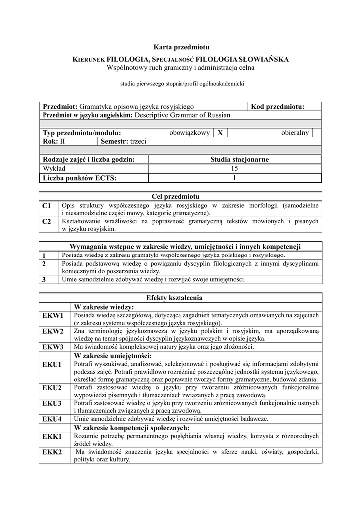 Karta przedmiotu KIERUNEK FILOLOGIA, SPECJALNOŚĆ FILOLOGIA SŁOWIAŃSKA Wspólnotowy ruch graniczny i administracja celna studia pierwszego stopnia/profil ogólnoakademicki Przedmiot: Gramatyka opisowa języka rosyjskiego Przedmiot w języku angielskim: Descriptive Grammar of Russian obowiązkowy Typ przedmiotu/modułu: Rok: II Semestr: trzeci Rodzaje zajęć i liczba godzin: Wykład Liczba punktów ECTS: Kod przedmiotu: X obieralny Studia stacjonarne 15 1 Cel przedmiotu C1 C2 Opis struktury współczesnego języka rosyjskiego w zakresie morfologii (samodzielne i niesamodzielne części mowy, kategorie gramatyczne). Kształtowanie wrażliwości na poprawność gramatyczną tekstów mówionych i pisanych w języku rosyjskim. Wymagania wstępne w zakresie wiedzy, umiejętności i innych kompetencji 1 2 3 Posiada wiedzę z zakresu gramatyki współczesnego języka polskiego i rosyjskiego. Posiada podstawową wiedzę o powiązaniu dyscyplin filologicznych z innymi dyscyplinami koniecznymi do poszerzenia wiedzy. Umie samodzielnie zdobywać wiedzę i rozwijać swoje umiejętności. Efekty kształcenia W zakresie wiedzy: EKW1 EKW2 EKW3 Posiada wiedzę szczegółową, dotyczącą zagadnień tematycznych omawianych na zajęciach (z zakresu systemu współczesnego języka rosyjskiego). Zna terminologię językoznawczą w języku polskim i rosyjskim, ma uporządkowaną wiedzę na temat spójności dyscyplin językoznawczych w opisie języka. Ma świadomość kompleksowej natury języka oraz jego złożoności. W zakresie umiejętności: EKU1 EKU2 EKU3 EKU4 Potrafi wyszukiwać, analizować, selekcjonować i posługiwać się informacjami zdobytymi podczas zajęć. Potrafi prawidłowo rozróżniać poszczególne jednostki systemu językowego, określać formę gramatyczną oraz poprawnie tworzyć formy gramatyczne, budować zdania. Potrafi zastosować wiedzę o języku przy tworzeniu zróżnicowanych funkcjonalnie wypowiedzi pisemnych i tłumaczeniach związanych z pracą zawodową. Potrafi zastosować wiedzę o języku przy tworzeniu zróżnicowanych funkcjonalnie ustnych i tłumaczeniach związanych z pracą zawodową. Umie samodzielnie zdobywać wiedzę i rozwijać umiejętności badawcze. W zakresie kompetencji społecznych: EKK1 EKK2 Rozumie potrzebę permanentnego pogłębiania własnej wiedzy, korzysta z różnorodnych źródeł wiedzy. Ma świadomość znaczenia języka specjalności w sferze nauki, oświaty, gospodarki, polityki oraz kultury. EKK3 Potrafi wykorzystać nabytą wiedzę w zakresie językoznawstwa w różnorodnych działaniach o charakterze zawodowym oraz w pracy tłumacza. Posługując się językiem rosyjskim dba o poprawność gramatyczną. Treści programowe przedmiotu Forma zajęć - wykłady Treści programowe W1 W2 W3 W4 W5 W6 W7 W8 W9 W10 W11 W12 W13 W14 W15 Czasownik – charakterystyka semantyczna i gramatyczna części mowy. Odmienne i nieodmienne formy czasownika. Czasownik – kategoria aspektu (czasowniki dokonane i niedokonane, pary aspektowe i sposoby ich tworzenia – perfektywacja i imperfektywacja). Czasownik – czasowniki jedno- i dwuaspektowe. Kategoria strony, czasowniki przechodnie, strona czynna i bierna, czasowniki zwrotne. Kategoria osoby. Czasowniki bezosobowe. Kategoria czasu. Kategoria trybu. Imiesłowy przymiotnikowe czynne – tworzenie, znaczenie form. Imiesłowy przymiotnikowe bierne – tworzenie, znaczenie form. Imiesłowy przysłówkowe – tworzenie, znaczenie form. Przysłówek – klasyfikacja, funkcja składniowa. Wyrazy kategorii stanu. Niesamodzielne części mowy: przyimek, spójnik. Niesamodzielne części mowy: partykuła. Wykrzyknik i onomatopeja. Liczba godzin 1 1 1 1 1 1 1 1 1 1 1 1 1 1 1 15 Suma godzin: Metody i środki dydaktyczne 1 2 3 4 Dyskusja dydaktyczna. Wykład informacyjny. Wykład konwersatoryjny. Praca z podręcznikiem, prezentacje. Sposoby oceniania Ocenianie kształtujące F1 F2 Obecność i aktywny udział w zajęciach. Przygotowanie do zajęć. Śródsemestralne kolokwia pisemne i ustne. P1 P2 Ocena semestralna jest wypadkową ocen cząstkowych. Ustne zaliczenie na ocenę. Ocenianie podsumowujące Obciążenie pracą studenta Średnia liczba godzin na realizowanie Forma aktywności aktywności Godziny kontaktowe z wykładowcą, realizowane w formie zajęć dydaktycznych – łączna liczba godzin w semestrze 15 Godziny kontaktowe z wykładowcą realizowane w formie konsultacji – łączna liczba godzin w semestrze 2 Przygotowanie się do zajęć – łączna liczba godzin w semestrze Zapoznanie z podstawową i uzupełniającą literaturą przedmiotu Przygotowanie do zaliczenia 3 5 5 30 1 Suma godzin: Sumaryczna liczba punktów ECTS dla przedmiotu/modułu Literatura podstawowa i uzupełniająca EKW1 K_W04 Sposoby oceniania Metody i środki dydaktyczne Treści programowe Cele przedmiotu Stopień w jakim efekty kształcenia związane są z przedmiotem Efekt kształcenia Odniesienie danego efektu do efektów specjalnościowych Macierz efektów kształcenia Stopień w jakim efekty kształcenia związane są z przedmiotem 4 Czesław Lachur, Współczesny język rosyjski. System gramatyczny (z ćwiczeniami), Opole 1998. Gramatyka opisowa współczesnego języka rosyjskiego, red. Albert Bartoszewicz, Jan Wawrzyńczyk, cz. 1,Stefan Grzybowski, Mścisław Olechnowicz, Jan Wawrzyńczyk, Fonetyka, Fonologia, Pismo; cz. 2, Wanda Zmarzer, Leksyka. Słowotwórstwo; cz. 3, Jan Wawrzyńczyk, Wanda Zmarzer, Morfologia, Warszawa 1986-1987. П.А. Лекант, Е.И. Диброва, Л.Л. Касаткин, Е.В. Клобуков, Современный русский язык, ред. П.А. Лекант, Москва 2002. Odniesienie danego efektu kształcenia do efektów zdefiniowanych dla całego programu (PEK) 1 2 +++ C1,C2 W 1-15 1,2,3,4 F1,F2,P1,P2 EKW2 K_W02 +++ C1,C2 W 1-15 1,2,3,4 F1,F2,P1,P2 EKW3 K_W09 ++ C1,C2 W 1-15 1,2,3,4 F1,F2,P1,P2 EKU1 K_U01 +++ C1,C2 W 1-15 1,2,3,4 F1,F2,P1,P2 EKU2 K_U08 ++ C1,C2 W 1-15 1,2,3,