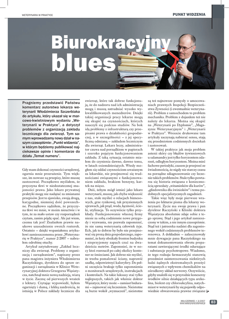 PUNKT WIDZENIA WETERYNARIA W PRAKTYCE Biurokracyjny blues Pragniemy przedstawić Państwu komentarz autorstwa lekarza weterynarii Włodzimierza Szczerbiaka do artykułu, który ukazał się w marcowo-kwietniowym wydaniu „Weterynarii w Praktyce”, a dotyczył problemów z organizacją zakładu leczniczego dla zwierząt. Tym samym wprowadzamy nowy dział w naszym czasopiśmie: „Punkt widzenia”, w którym będziemy publikować najciekawsze opinie i komentarze do działu „Temat numeru”. Gdy mam dokonać czynności urzędowej, ogarnia mnie przerażenie. Tym większe, im nowsze są przepisy, które muszę zastosować. Początkowo myślałem, że przyczyna tkwi w niedostatecznej znajomości prawa. Jako lekarz prywatnej praktyki mogę nie nadążać za zmianami przepisów. Jest to zjawisko, swoją drogą, karygodne, niemniej dość powszechne. Początkowo sądziłem, że przyczyna tkwi we mnie, w moim nieuctwie i w tym, że za mało ustaw czy rozporządzeń czytam, zanim pójdę spać. Ale już wiem, czemu tak jest! Znalazłem prawie naukowe uzasadnienie swoich rozterek. Ostatnio – dzięki wspaniałemu artykułowi zamieszczonemu przez „Weterynarię w Praktyce”, numer 2/2007 – nabrałem odrobinę otuchy. Artykuł zatytułowany „Zakład leczniczy dla zwierząt. Problemy z organizacją i zarządzaniem”, napisany przez pana magistra inżyniera Włodzimierza Raczyńskiego, dyrektora do spraw organizacji i zarządzania w Klinice Weterynaryjnej doktora Grzegorza Wąsiatycza, natchnął mnie nową nadzieją, wiarą w życie. Zacznę od pierwszych wrażeń z lektury. Czytając wypowiedź, byłem ogarnięty i dumą, i lekką zazdrością, że istnieją w Polsce zakłady lecznicze dla zwierząt, które tak dobrze funkcjonują, że do nadzoru nad ich administracją mogą i muszą zatrudniać wysoko wykwalifikowanych menedżerów. Dzięki takiej organizacji pracy lekarze mogą się skupić na czynnościach, których nauczyli się podczas studiów. Na bok idą problemy z infrastrukturą czy przepisami prawa o działalności gospodarczej, a w szczególności – z jej specyficzną odmianą – zakładem leczniczym dla zwierząt. Lekarz leczy, administrator czuwa nad porządkiem w papierach i szeroko pojętym funkcjonowaniem zakładu. Z taką sytuacją ostatnio miałem do czynienia dawno, dawno temu, w latach osiemdziesiątych. Wtedy mogłem się oddać czynnościom uważanym za lekarskie, nie przejmować się trudnościami związanymi z funkcjonowaniem zakładu, brakiem benzyny, kartek na mięso. Dziś, żebym mógł istnieć jako lekarz weterynarii, muszę, jak chyba większość z nas, stale myśleć o relacjach biznesowych, grze rynkowej, tak przyziemnych sprawach, jak prąd, woda, łączność, ścieki, utylizacja. To oczywiście tylko przykłady. Funkcjonowanie własnej firmy niesie za sobą codziennie nowe przygody i wyzwania, nie pozwala zapomnieć, że nie samą weterynarią człowiek żyje. Ech, jak to dobrze by było nie przejmować się prozą dnia gospodarczego, zapomnieć, że koty obsikały fronton budynku i nieprzyjemny zapach czuć na dwadzieścia metrów. Zapomnieć, że w nocy ktoś rozrzucił po całej okolicy kontener ze śmieciami. Jak dobrze nie myśleć, że trzeba pomalować ściany, naprawić szafkę, odpowietrzyć kaloryfery. Do pełni szczęścia brakuje tylko zapomnienia o monitorach urzędowych, instrukcjach i kontrolach. Na takie luksusy stać tylko najlepszych, takich jak właśnie doktor Wąsiatycz, który może – zamiast bzdurami – zajmować się leczeniem. Nieistotne są burze wokół „wyznaczeń”, nieistotne są też najnowsze pomysły o umocowaniach prawnych Inspekcji Bezpieczeństwa Żywności (i ewentualnie weterynarii). Problem z samochodem to problem mechanika. Problem z dojazdem też nie należy do lekarza. Można się skupić na „Weterynarii po Dyplomie”, „Magazynie Weterynaryjnym” i „Weterynarii w Praktyce”. Wreszcie drukowane tam artykuły zaczynają nabierać sensu, stają się przedmiotem codziennych dociekań i zastosowań. W takiej praktyce jak moja problem astenii skóry czy błędów żywieniowych u salamandry jest tylko horyzontem zdarzeń, odległym horyzontem. Można mieć fachowe periodyki, czasem je przejrzeć ze świadomością, że nigdy nie starczy czasu na porządne zdiagnozowanie czy leczenie takich problemów. Stale tylko powtarza się historia związana z koniecznością sprzedaży „witaminków dla kurów”, „glizdownika dla świnioków” i temu podobnych specjalistycznych zagadnień. Takie więc były moje pierwsze wrażenia po lekturze pisma dla lekarzy weterynarii. Życie ma swoje prawa i pan dyrektor Raczyński z Kliniki doktora Wąsiatycza absolutnie zdaje sobie z tego sprawę. Stąd i jego artykuł zamieszczony w takim, a nie innym czasopiśmie. Stąd też i jutrzenka nadziei dla zagonionego wokół codziennych problemów terenowca. A dokładnie – zafascynowały mnie dywagacje pana Raczyńskiego na temat dokumentowania obrotu preparatami zawierającymi środki odurzające i substancje psychotropowe. Wiadomo, że tego rodzaju farmaceutyki stanowią przedmiot zainteresowania niektórych ludzi żądnych ekstremalnych przeżyć związanych z wpływem chemikaliów na ośrodkowy układ nerwowy. Oczywiście, gdyby znaleźli się w przyrodzie koneserzy środków silnie działających typu arekolina, biolent czy chlorsukcylina, natychmiast w weterynarii by się pojawiły odpowiednie obwarowania prawne związane MAJ-CZERWIEC • 3/2007 www.weterynaria.elamed.pl 83 PUNKT WIDZENIA z ich obrotem. Całe szczęście, że miłośnicy oglądania śluzówek żołądka właśnie wystających z ust nie są aktualnie w modzie. Przepisy, jakimi otaczane są niektóre z weterynaryjnych produktów leczniczych, rzadko są związane z farmakodynamiką, farmakokinetyką tych środków. Najczęściej mamy do czynienia z zabezpieczeniami przed nieuprawnionym użyciem. Dla lekarza preparaty farmakologiczne stanowią przyja