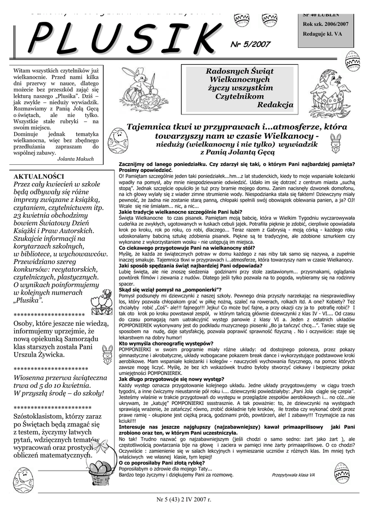 Szkolny nieregularnik dla wszystkich PLUSIK Witam wszystkich czytelników już wielkanocnie. Przed nami kilka dni przerwy w nauce, dlatego możecie bez przeszkód zająć się lekturą naszego „Plusika”. Dziś – jak zwykle – nieduży wywiadzik. Rozmawiamy z Panią Jolą Gęcą o świętach, ale nie tylko. Wszystkie stałe rubryki – na swoim miejscu. Dominuje jednak tematyka wielkanocna, więc bez zbędnego przedłużania zapraszam do wspólnej zabawy. SP 40 LUBLIN Rok szk. 2006/2007 Redaguje kl. VA Nr 5/2007 Radosnych Świąt Wielkanocnych życzy wszystkim Czytelnikom Redakcja Tajemnica tkwi w przyprawach i...atmosferze, która towarzyszy nam w czasie Wielkanocy nieduży (wielkanocny i nie tylko) wywiadzik z Panią Jolantą Gęcą Jolanta Makuch AKTUALNOŚCI Przez cały kwiecień w szkole będą odbywały się różne imprezy związane z książką, czytaniem, czytelnictwem itp. 23 kwietnia obchodzimy bowiem Światowy Dzień Książki i Praw Autorskich. Szukajcie informacji na korytarzach szkolnych, w bibliotece, u wychowawców. Przewidziano szereg konkursów: recytatorskich, czytelniczych, plastycznych. O wynikach poinformujemy w kolejnych numerach „Plusika”. ********************* Osoby, które jeszcze nie wiedzą, informujemy uprzejmie, że nową opiekunką Samorządu klas starszych została Pani Urszula Żywicka. ********************** Wiosenna przerwa świąteczna trwa od 5 do 10 kwietnia. W przyszłą środę – do szkoły! *********************** Szóstoklasistom, którzy zaraz po Świętach będą zmagać się z testem, życzymy łatwych pytań, wdzięcznych tematów wypracowań oraz prostych obliczeń matematycznych. Zacznijmy od lanego poniedziałku. Czy zdarzył się taki, o którym Pani najbardziej pamięta? Prosimy opowiedzieć. O! Pamiętam szczególnie jeden taki poniedziałek...hm...z lat studenckich, kiedy to moje wspaniałe koleŜanki wpadły na pomysł, aby mnie niespodziewanie odwiedzić. Udało im się dotrzeć z centrum miasta „suchą stopą”. Jednak szczęście opuściło je tuŜ przy bramie mojego domu. Zanim nacisnęły dzwonek domofonu, na ich głowy wylały się z wiader zimne strumienie wody. Niespodzianka stała się faktem! Dziewczyny miały pewność, Ŝe Ŝadna nie zostanie starą panną, chłopaki spełnili swój obowiązek oblewania panien, a ja? OJ! Wcale się nie śmiałam... nic, a nic... Jakie tradycje wielkanocne szczególnie Pani lubi? Święta Wielkanocne to czas pisanek. Pamiętam moją babcię, która w Wielkim Tygodniu wyczarowywała cudeńka ze zwykłych, ugotowanych w łuskach cebuli jajek. Potrafiła pięknie je zdobić, cierpliwie opowiadała krok po kroku, rok po roku, co robi, dlaczego... Teraz razem z Gabrysią - moją córką - kaŜdego roku udoskonalamy babciną sztukę zdobienia pisanek. Piękne są te tradycyjne, ale zdobione sznurkiem czy wykonane z wykorzystaniem wosku - nie ustępują im miejsca. Co ciekawego przygotowuje Pani na wielkanocny stół? Myślę, Ŝe kaŜda ze świątecznych potraw w domu kaŜdego z nas niby tak samo się nazywa, a zupełnie inaczej smakuje. Tajemnica tkwi w przyprawach i...atmosferze, która towarzyszy nam w czasie Wielkanocy. Jaki sposób spędzania świąt najbardziej Pani odpowiada? Lubię święta, ale nie znoszę siedzenia godzinami przy stole zastawionym... przysmakami, oglądania powtórek filmów i ziewania z nudów. Dlatego jeśli tylko pozwala na to pogoda, wybieramy się na rodzinny spacer. Skąd się wziął pomysł na „pomponierki”? Pomysł podsunęły mi dziewczynki z naszej szkoły. Pewnego dnia przyszły narzekając na niesprawiedliwy los, który pozwala chłopakom grać w piłkę noŜną, szaleć na rowerach, rolkach itd. A one? Kobiety? TeŜ chciałyby robić „Coś”- ale!!! fajnego!!! Jejku! Co moŜe być fajne, a przy okazji czy ja to potrafię robić? I tak oto krok po kroku powstawał zespół, w którym tańczą głównie dziewczynki z klas IV - VI.... Od czasu do czasu pomagają nam uatrakcyjnić występ panowie z klasy VI a. Jeden z ostatnich układów POMPONIEREK wykonywany jest do podkładu muzycznego piosenki „Bo ja tańczyć chcę...”. Taniec staje się sposobem na nudę, daje satysfakcję, pozwala poprawić sprawność fizyczną . No i oczywiście: staje się lekarstwem na dobry humor! Kto wymyśla choreografię występów? POMPONIERKI w swoim programie miały róŜne układy: od dostojnego poloneza, przez pokazy gimnastyczne i akrobatyczne, układy wzbogacane pokazem break dance i wykorzystujące podstawowe kroki aerobikowe. Mam wspaniałe koleŜanki i kolegów - nauczycieli wychowania fizycznego, na pomoc których zawsze mogę liczyć. Myślę, Ŝe bez ich wskazówek trudno byłoby stworzyć ciekawy i bezpieczny pokaz umiejętności POMPONIEREK. Jak długo przygotowuje się nowy występ? KaŜdy występ oznacza przygotowanie kolejnego układu. Jedne układy przygotowujemy w ciągu trzech tygodni, a inne ćwiczymy nieustannie pół roku i.... dziewczynki powiedziałyby: „Pani Jola ciągle się czepia”. Jesteśmy właśnie w trakcie przygotowań do występu w przeglądzie zespołów aerobikowych i... no cóŜ...nie ukrywam, Ŝe „katuję” POMPONIERKI sssstrasznie. A tak powaŜnie: to, Ŝe dziewczynki na występach sprawiają wraŜenie, Ŝe zatańczyć równo, zrobić dokładnie tyle kroków, ile trzeba czy wykonać obrót przez prawe ramię - okupione jest cięŜką pracą, godzinami prób, powtórzeń, ale! I zabawy!!! Trzymajcie za nas kciuki!!! Interesuje nas jeszcze najgłupszy (najzabawniejszy) kawał primaaprilisowy jaki Pani zrobiono oraz ten, w którym Pani uczestniczyła. No tak! Trudno nazwać go najzabawniejszym (jeśli chodzi o samo sedno: Ŝart jako Ŝart ), ale częstotliwością powtarzania bije na głowę i zaciera w pamięci inne Ŝarty primaaprilisowe. O co chodzi? Oczywiście : zamienienie się w salach lekcyjnych i wymieszanie uczniów z róŜnych klas. Im mniej tych właściwych we własnej klasie, tym lepiej! O co p