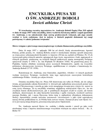 ENCYKLIKA PIUSA XII O W. ANDRZEJU BOBOLI Invicti athletae Christi W trzechsetn rocznic m cze stwa w. Andrzeja Boboli Papie Pius XII ogłosił w dniu 16 maja 1957 roku encyklik , która wysławia heroiczn miło i zapał apostolski w. Andrzeja, a na zako czenie daje szereg praktycznych wskaza , jak jego zasady wciela w ycie codzienne. Jest to jedyny w historii papieski dokument tej rangi po wi cony w cało ci jednemu wi temu! Słowo wst pne z pierwszego maszynopisowego wydania tłumaczenia polskiego encykliki. Dnia 16 maja 1957 r. upłyn ło 300 lat od chwili, kiedy niezmordowany Apostoł Polesia, polski jezuita, w. Andrzej Bobola został w niesłychanie okrutny sposób um czony za wiar przez schizmatyckich Kozaków w Janowie (30 km na zachód od Pi ska). Po 33-ch yciorysach pióra ró nych autorów opisuj cych Jego ycie, m cze stwo i kult, napisanych w ró nych j zykach, gruntown , na cisłych danych naukowych opart monografi wi tego opracował zmarły w 1955 r. ks. Jan Poplatek TJ (Kraków 1936). Na gruntownej pracy ks. Poplatka, bardzo chlubnie ocenionej przez uczonych Bolandystów, oparły si wszystkie pó niejsze obcoj zyczne yciorysy wi tego, opublikowane w zwi zku z kanonizacj w. Andrzeja Boboli (17 IV 1938). Kanonizacja w. Andrzeja, oraz francuskie, angielskie, włoskie i w innych j zykach wydane yciorysy wi tego, rozsławiły imi tego najwy szym zaszczytem ko cielnym ozdobionego Polaka - Jezuity po całym wiecie. Ostatnia encyklika Ojca w. Piusa XII skierowana nie tylko do Polski, ale do całego wiata, przypomniała całemu Ko ciołowi w słowach jak najbardziej uroczystych posta tego bohatera Chrystusowego i stawiła go jako wzór nieugi tego trwania przy wierze w. nawet za cen ycia własnego. Za t encyklik winni my najgł bsz wdzi czno Ojcu w., bo nie zwykłym listem okoliczno ciowym, jak w podobnych okazjach zwykł to czyni , ale listem okólnym, skierowanym do całej hierarchii ko cielnej i ogółu wiernych, rozsławił zarówno naszego Rodaka, jak i nasz Ojczyzn , która tutaj w najbardziej oficjalnym dokumencie Stolicy Apostolskiej została nazwana antemurale christianitatis a jako tytuł najwi kszej naszej chwały podkre lono to, e Polska była zawsze wierna. Zaznaczył przy tym Ojciec w., i to jest nasz misj dziejowa, przeznaczon nam przez Opatrzno . w. Andrzeja nazwał Ojciec w. ozdob i chlub narodu i stawił go jako wzór niezłomnej wiary i m stwa nieustraszonego wszystkim wiernym na całym wiecie. - Ks. A. Bober TJ Encyklika Do Czcigodnych Braci Patriarchów, Prymasów, Arcybiskupów, Biskupów i innych Ordynariuszy Miejsca yj cych w pokoju i jedno ci ze Stolic Apostolsk - w trzechsetn rocznic chwalebnego m cze stwa w. Andrzeja Boboli. Pius XII Czcigodnym Braciom - z pozdrowieniem i Apostolskim błogosławie stwem. Jest naszym gor cym pragnieniem, eby wszyscy po całym wiecie uczestnicy chlubnego miana katolików, a zwłaszcza ci synowie ukochanej przez nas polskiej ziemi, dla których niezwyci ony bohater Chrystusowy Andrzej Bobola jest chlub i wspaniałym wzorem chrze cija skiego m stwa, w trzechsetn rocznic jego zgonu pobo nym sercem i umysłem rozwa yli jego m cze stwo i jego wi to . Nie chcemy wi c pomin tej pami tnej chwili, która złotymi zgłoskami zapisana jest w rocznikach Ko cioła, eby nie wspomnie o jego yciu i cnocie i eby tak Wam, Czcigodni Bracia, jak wiernym waszej pasterskiej pieczy zawierzonym, przez to ogólne pismo nie wskaza w nim przykładu, który by ka dy wedle swojego stanu i zawodu mógł obra za przedmiot na ladowania. W ród innych chlubnych przymiotów przede wszystkim błyszczy w Andrzeju Boboli cnota wiary, której moc, zasilana łask Bo , z biegiem lat tak w jego duszy zakorzeniła si i rozrosła, e nadała yciu jego osobliw cech i dodała mu odwagi do m nego podj cia m cze stwa. W yciu jego całkiem osobliwie wieci ta prawda, któr Apostoł narodów uj ł w słowa: "A mój sprawiedliwy z wiary y b dzie"1. Cokolwiek bowiem czy to do wierzenia, czy do pełnienia uczynkiem podaje katolicki Ko ciół, on cał sił brał sobie do serca i jak najochotniej starał si wykona . Dlatego od samego pocz tku usiłował poskromi i do ładu doprowadzi te nieporz dne skłonno ci, które po smutnym upadku pierwszego rodzica zwykły m ci nasz natur i do złego j poci ga , a obok tego pracował z niesłabn cym nigdy zapałem nad tym, eby dusz swoj przyozdobi we wszystkie chrze cija skie cnoty. I ycie w. Andrzeja Urodził si w roku 1591 w Sandomierskiej ziemi z rodziców wybitnych szlachetno ci rodu, ale znamienitszych jeszcze cnot i stało ci katolickiej wiary. Obdarzony bystrym i skłonnym do dobrego umysłem, odebrawszy ju w domu od najwcze niejszego dzieci stwa zacne i chrze cija skie wychowanie, oddany został do szkół Towarzystwa Jezusowego, gdzie wnet zabłysn ł niewinno ci i serdeczn pobo no ci . Lata przygotowania Maj c w sercu dla blasków i pró no ci wiatowych tylko pogard , zapragn ł gor co "lepszych darów"2 i niezadługo, jako dziewi tnastoletni młodzieniec, wst pił jak najochotniej do nowicjatu Towarzystwa w Wilnie, by móc bezpieczniej post powa drog doskonało ci ewangelicznej. Maj c w pami ci to tak wa ne upomnienie Chrystusowe: "Je li kto chce i za mn , niech si zaprze samego siebie, niech co dnia bierze krzy swój, i niech mnie na laduje"3, zabrał si najgorliwiej, do nabycia chrze cija skiej pokory przez wzgard samego siebie. A poniewa z natury miał pewn skłonno do wyniosło ci i niecierpliwo ci oraz odrobin uporu, wydał samemu sobie nieubłagan walk . Przez t wa1k wzi ł niejako krzy Chrystusowy na ramiona i szedł z nim na Kalwari , aby u jej szczytu osi gn zarazem przy łasce Bo ej t doskonało upragnionej i gor cymi modlitwami wyjednywanej pokory, przez któr dochodzi si do wszystkich blasków wi tobliwo ci chrze cija skiej. Nosił bowiem w sercu to przem dre zdanie w. Bernarda, e "obudowa duchowna nie mo e d wiga si inaczej, jak na mocnym fundamencie pokory"4. Ponadto płon ł najgor tsz miło ci Boga i bli nich, tote 