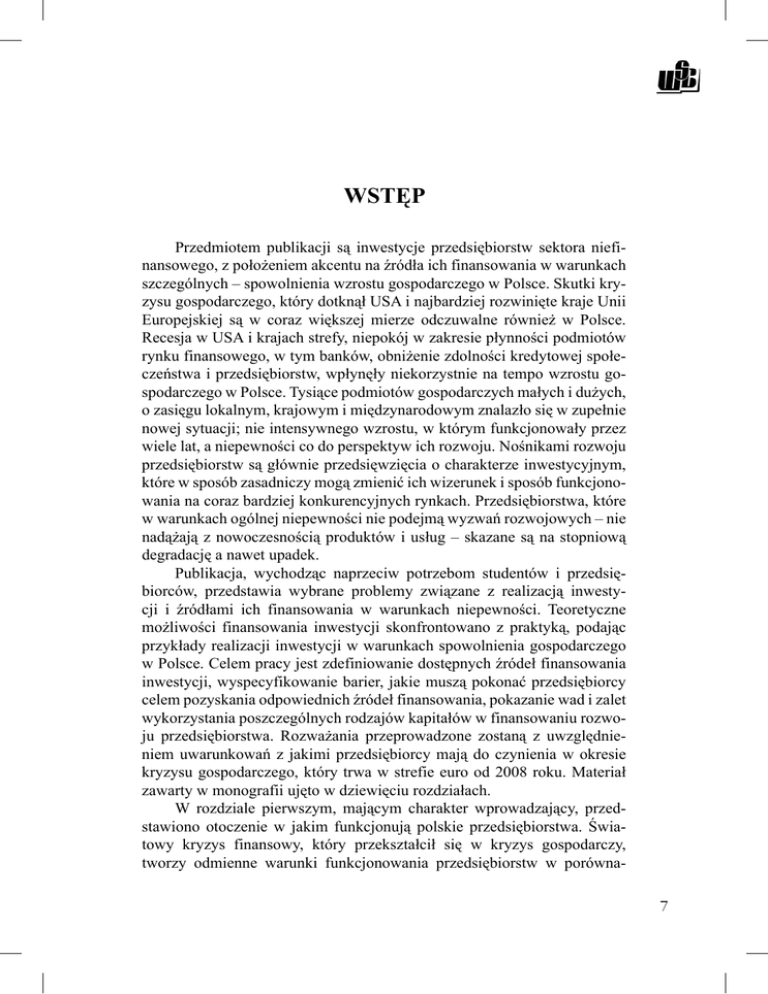 WSTĘP Przedmiotem publikacji są inwestycje przedsiębiorstw sektora niefinansowego, z położeniem akcentu na źródła ich finansowania w warunkach szczególnych – spowolnienia wzrostu gospodarczego w Polsce. Skutki kryzysu gospodarczego, który dotknął USA i najbardziej rozwinięte kraje Unii Europejskiej są w coraz większej mierze odczuwalne również w Polsce. Recesja w USA i krajach strefy, niepokój w zakresie płynności podmiotów rynku finansowego, w tym banków, obniżenie zdolności kredytowej społeczeństwa i przedsiębiorstw, wpłynęły niekorzystnie na tempo wzrostu gospodarczego w Polsce. Tysiące podmiotów gospodarczych małych i dużych, o zasięgu lokalnym, krajowym i międzynarodowym znalazło się w zupełnie nowej sytuacji; nie intensywnego wzrostu, w którym funkcjonowały przez wiele lat, a niepewności co do perspektyw ich rozwoju. Nośnikami rozwoju przedsiębiorstw są głównie przedsięwzięcia o charakterze inwestycyjnym, które w sposób zasadniczy mogą zmienić ich wizerunek i sposób funkcjonowania na coraz bardziej konkurencyjnych rynkach. Przedsiębiorstwa, które w warunkach ogólnej niepewności nie podejmą wyzwań rozwojowych – nie nadążają z nowoczesnością produktów i usług – skazane są na stopniową degradację a nawet upadek. Publikacja, wychodząc naprzeciw potrzebom studentów i przedsiębiorców, przedstawia wybrane problemy związane z realizacją inwestycji i źródłami ich finansowania w warunkach niepewności. Teoretyczne możliwości finansowania inwestycji skonfrontowano z praktyką, podając przykłady realizacji inwestycji w warunkach spowolnienia gospodarczego w Polsce. Celem pracy jest zdefiniowanie dostępnych źródeł finansowania inwestycji, wyspecyfikowanie barier, jakie muszą pokonać przedsiębiorcy celem pozyskania odpowiednich źródeł finansowania, pokazanie wad i zalet wykorzystania poszczególnych rodzajów kapitałów w finansowaniu rozwoju przedsiębiorstwa. Rozważania przeprowadzone zostaną z uwzględnieniem uwarunkowań z jakimi przedsiębiorcy mają do czynienia w okresie kryzysu gospodarczego, który trwa w strefie euro od 2008 roku. Materiał zawarty w monografii ujęto w dziewięciu rozdziałach. W rozdziale pierwszym, mającym charakter wprowadzający, przedstawiono otoczenie w jakim funkcjonują polskie przedsiębiorstwa. Światowy kryzys finansowy, który przekształcił się w kryzys gospodarczy, tworzy odmienne warunki funkcjonowania przedsiębiorstw w porówna7 Wstęp niu do istniejących przed 2013 r. Niestabilne otoczenie jest główną przyczyną spowolnienia rozwoju polskiej gospodarki. Na danych liczbowych przedstawiono skutki europejskiego kryzysu dla gospodarki polskiej oraz przyczyny spowolnienia wzrostu gospodarczego. Wzrost awersji do ryzyka i spadek wzajemnego zaufania pomiędzy uczestnikami na rynku długu, przyczynił się do zaostrzenia polityki kredytowej przez polskie banki, a nawet okresowego ograniczenia podaży kredytu dla wielu podmiotów, w tym gospodarczych, nie tylko w zakresie działalności operacyjnej ale również inwestycyjnej. Polityka kredytowa banków w znaczący sposób wpływa na funkcjonowanie i rozwój przedsiębiorstw. W rozdziale drugim przedstawiono wybrane problemy dotyczące inwestowania mające na celu dostarczenie fundamentalnej wiedzy z zakresu istoty procesu inwestowania, etapów realizacji projektu inwestycyjnego oraz wyboru rodzaju inwestycji w warunkach kryzysu gospodarczego. Podstawowa teza brzmi: Inwestowanie pozwala na rozwój przedsiębiorstwa, stanowi niezbędny warunek jego przetrwania, niezależnie od sytuacji makroekonomicznej. W formie syntetycznej omówiono problem ryzyka związanego z inwestowaniem, a także alternatywną formę rozwoju przedsiębiorstw jaką stanowią alianse oraz fuzje i przejęcia. Rozdział trzeci stanowi kontynuację myśli zawartej w rozdziale poprzednim. Zasadnicza teza brzmi: Rachunek efektywności inwestycji stanowi podstawę podjęcia racjonalnej decyzji o inwestowaniu, zarówno w okresie stabilności gospodarczej jak również w czasach kryzysu gospodarczego. Czytelnik zostaje zapoznany nie tylko z przesłankami oceny projektów inwestycyjnych ale również z wieloma metodami oceny opłacalności inwestycji. Przykłady ujęte w tabelach, przytoczone wzory, dostarczają przedsiębiorcom znaczny zakres wiedzy nie tylko teoretycznej, ale również praktycznej w zakresie metod wyliczenia opłacalności inwestycji, głównie rzeczowych. Rozdział czwarty poświęcony jest bankowi, który jak pokazuje praktyka gospodarcza jest kompetentnym organizatorem kapitału na finansowanie inwestycji przedsiębiorstw. W sposób czytelny przedstawiono formy kredytów z jakich mogą skorzystać przedsiębiorstwa na finansowanie rozwoju oraz warunki ich przyznania. Bank to nie tylko kredytodawca; jego rola w finansowaniu jest znacznie szersza. Jest agentem emisji dłużnych papierów wartościowych, depozytariuszem i agentem płatniczym. Treść rozdziału piątego jest kontynuacją rozważań prowadzonych w poprzednim rozdziale. Główną tezę można sformułować następująco: Chociaż w Polsce dominuje finansowanie inwestycji z wykorzystaniem kredytów bankowych, to jednak niebankowe podmioty finansowe coraz śmielej działają na tym rynku. Do pozabankowych instrumentów finansowania 8 Wstęp inwestycji należy leasing, natomiast dla małych i średnich przedsiębiorstw venture capital. W zrozumiały sposób przedstawiono formy leasingu z jakich mogą skorzystać przedsiębiorstwa, bez względu na wielkość i charakter prowadzonej działalności. Ponadto w rozdziale omówiono, w przystępnej formie, problem venture capital – instrument jeszcze mało spopularyzowany wśród przedsiębiorstw, zwłaszcza małych. Rozdziały następne mają już charakter praktyczny. Na przykładach przedsiębiorstw z różnych branż, przedstawiono metody finansowania inwestycji. W rozdziale szóstym omówiono rolę Giełdy Pa