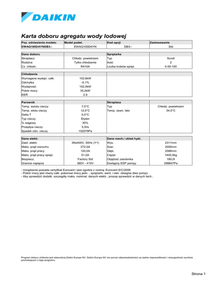 Karta doboru agregatu wody lodowej Poz. odniesienia modelu EWAQ100DAYNDB3-- Model podst. Dane doboru Skraplacz Rodzina Cz. chłodn. Kod opcji EWAQ100DAYN Zastosowanie DB3-- Std SpręŜarka Chłodz. powietrzem Tylko chłodzenie R410A Typ Ilość Liczba kroków spręŜ. Scroll 2 0-50-100 Chłodzenie Wymagana wydajn. całk. Odchyłka Wydajność Pobór mocy EER 102,6kW -0,1% 102,5kW 35,2kW 2,9 Parownik Temp. wylotu cieczy Temp. wlotu cieczy Delta T Typ cieczy % wagowy Przepływ cieczy Spadek ciśn. cieczy Skraplacz 7,0°C 12,0°C 5,0°C Etylen 30% 5,5l/s 102079Pa Dane elektr. Zasil. elektr. Maks. prąd rozruchu Maks. prąd pracy Maks. prąd pracy spręŜ. Bezpiecz. Granice napięcia Typ Temp. zewn. lato Chłodz. powietrzem 34,0°C Dane mech./ układ hydr. 3Nx400V, 50Hz (Y1) 272,0A 120,0A 51,0A Factory Std 380V - 415V Wys. Szer. Głęb. CięŜar Objętość zasobnika Dostępny ESP pompy 2311mm 2000mm 2566mm 1400,0kg 190,0l 298847Pa - Urządzenie posiada certyfikat Eurovent i jest zgodne z normą: Eurovent 6/C/2006 - Pobór mocy jest równy całk. poborowi mocy jedn. , spręŜarki, went. i ster. obiegów (bez pomp). - Aby sprawdzić dodatk. szczegóły maks. nominal. danych elektr., proszę sprawdzić w danych tech.. Program doboru chillerów jest własnością Daikin Europe NV. Daikin Europe NV nie ponosi odpowiedzialności za Ŝadne nieprawidłowści i wiarygodność wyników pochodzących z tego programu. Strona 1 Częśc. obc. (Chł.) Krok wydajności LWE Zewn. Wydajn. chłodn. @100% @75% @50% @25% ESEER 7,0°C 7,0°C 7,0°C 7,0°C 35,0°C 30,0°C 25,0°C 20,0°C 105,0kW 79,0kW 53,0kW 26,0kW Chłodn. moc wejśc. 36,2kW 21,9kW 12,3kW 6,2kW EER Klasa Eurovent 2,9 3,6 4,3 4,2 4,0 B ESEER (Europejski sezonowy EER) jest oblicz. na podstawie war. temp. Eurovent i obl. obc. częśc. Wart. ESEER jest poświadczona przez Eurovent. Pobór mocy dla cał. jedn. ESEER = 0.03 x EER@100% + 0.33 x EER@75% + 0.41 x EER@50% + 0.23 x EER@25% Dźwięk Częstotliwość Moc akustyczna Odległość od jedn. Ciśnienie akustyczne 63Hz 62dB 1m 67,3dBA 125Hz 66dB 5m 58,9dBA 250Hz 71dB 10m 54,0dBA 500Hz 79dB 1000Hz 82dB 2000Hz 80dB 4000Hz 74dB 8000Hz 64dB Ogólny 86,0dBA Moc akustyczna jest zgodna z ISO3744. Pomiar wykonano w warunkach nominalnych. Ciśnienie akustyczne jest podane dla celów wskaźnikowych. Obliczenie obowiązuje jedynie dla warunków otwartego pola: Lp=Lw-10Log(S) Wybrane opcje OPZL OPHP OPBT OP03 OP10 OP12 ZL Pompa o wys. sprê¿u Zb. buforowy Podwójny zawór bezpieczeñ. Taœma grzejna parown. Zawór odcinaj. na ssaniu Program doboru chillerów jest własnością Daikin Europe NV. Daikin Europe NV nie ponosi odpowiedzialności za Ŝadne nieprawidłowści i wiarygodność wyników pochodzących z tego programu. Strona 2 1.1. Zakres pracy-chłodzenie Temp. zew n. 50,0°C 45,0°C -5,0°C/43,0°C 20,0°C/43,0°C 40,0°C -10,0°C/38,0°C 35,0°C -10,0°C .. 20,0°C/ 20,0°C .. 43,0°C 30,0°C 25,0°C 20,0°C 15,0°C 10,0°C 20,0°C/5,0°C 5,0°C 0,0°C -10,0°C/0,0°C 10,0°C/0,0°C -5,0°C LWE -10,0°C -20,0°C -15,0°C -10,0°C -5,0°C 0,0°C 5,0°C 10,0°C 15,0°C 20,0°C 25,0°C 30,0°C 1.2. Spadek ciśn. cieczy Spadek ciśn.(Pa) 115000,0 95347,1 75694,1 56041,2 36388,2 16735,3 Przepływ cieczy (l/s) 0 2 4 6 8 10 Program doboru chillerów jest własnością Daikin Europe NV. Daikin Europe NV nie ponosi odpowiedzialności za Ŝadne nieprawidłowści i wiarygodność wyników pochodzących z tego programu. Strona 3