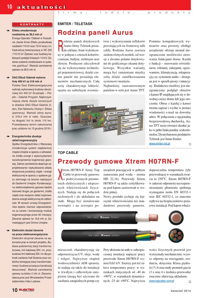 10 f KONTRAKTY Elfeko zmodernizuje rozdzielniÍ za 38,5 mln z≥ Energa-Operator Oddzia≥ w Koszalinie zleci≥a firmie Elfeko przebudowÍ rozdzielni 110 kV oraz 15 kV wraz z infrastrukturπ towarzyszπcπ w SE 220 /110/15 kV Øydowo oraz budowπ kablowych podejúÊ liniowych 110 kV. Zadanie zostanie zrealizowane w systemie Ñpod kluczî. WartoúÊ zamÛwienia opiewa na 38,5 mln z≥. SAG Elbud GdaÒsk wykona liniÍ 400 kV za 318 mln z≥ Polskie Sieci Elektroenergetyczne wybra≥y wykonawcÍ budowy dwutorowej linii 400 kV Grudziπdz ñ Pelplin ñ GdaÒsk PrzyjaüÒ. Najkorzystniejszπ ofertÍ z≥oøy≥o konsorcjum w sk≥adzie SAG Elbud GdaÒsk (lider), Etel Networks Olsztyn i Elfeko (partnerzy). WartoúÊ oferty wynosi 318,4 mln z≥ netto. Szacowana d≥ugoúÊ linii to oko≥o 116 km. Przewidywany termin zakoÒczenia prac ustalono na 15 grudnia 2018 r. Energotechnika zbuduje uk≥ad kogeneracyjny SpÛ≥ka Energotechnika z Warszawy zmodernizuje system ciep≥owniczy miasta UniejÛw w oparciu o odnawialne ürÛd≥a energii z wykorzystaniem wysokosprawnej kogeneracji gazowej. Zakres zamÛwienia obejmuje zaprojektowanie i wybudowanie uk≥adu skojarzonej produkcji ciep≥a i energii elektrycznej w oparciu o spalanie gazu ziemnego na terenie naleøπcym do Geotermii UniejÛw. Kondensacyjna elektrociep≥ownia gazowa bÍdzie stanowiÊ drugie, po geotermii, ürÛd≥o ciep≥a oraz wesprze uk≥ad rozprowadzenia energii elektrycznej do odbiorcÛw. W ramach umowy Energotechnika bÍdzie rÛwnieø odpowiedzialna za serwis i konserwacjÍ modu≥u kogeneracyjnego przez 60 miesiÍcy. Zlecenie opiewa na 19,8 mln z≥. Zamawiajπcym jest Gmina UniejÛw. Elektrotim dosta≥ zlecenie na prace elektroenergetyczne Elektrotim otrzyma≥ zlecenie na wykonanie prac w ramach projektu ÑBudowa podziemnej stacji transformatorowej, linii kablowej SN i nn, przebudowa linii kablowej SN i nn dla potrzeb zasilania Hali Stulecia oraz rozbiÛrka istniejπcej stacji transformatorowej i budowa przy≥πcza kanalizacji deszczowejî. WartoúÊ zamÛwienia opiewa na blisko 2 mln z≥. Zleceniodawcπ prac jest Wroc≥awskie PrzedsiÍbiorstwo Hala Ludowa. 10 i r m y , l u d z i e , p r o d u k t y EMITER / TELETASK Rodzina paneli Aurus R odzina paneli dotykowych Aurus firmy Teletask posiada szklany, front wykoÒczony w jednym z czterech kolorÛw: czarnym, bia≥ym, srebrnym oraz z≥otym. Producent zdecydowa≥ siÍ na wykorzystanie technologii pojemnoúciowej, dziÍki czemu panele nie posiadajπ elementÛw mechanicznych. Ca≥π seriÍ charakteryzuje lekkoúÊ, oparta na subtelnym wzornic- twie i wykorzystaniu refleksÛw powstajπcych na frontowej tafli szk≥a. Rodzina Aurus zawiera siedem rÛønych modeli, od wersji z dwoma polami dotykowymi do graficznego ekranu dotykowego. Wszystkie warianty mogπ byÊ zamieniane miÍdzy sobπ dziÍki zunifikowanemu systemowi montaøu. Najbardziej zaawansowanym panelem w serii jest Aurus TFT. Pomimo kompaktowych wymiarÛw oraz prostoty obs≥ugi urzπdzenie oferuje niemal nieograniczone moøliwoúci sterowania funkcjami domu. Kaøda z funkcji ñ sterowanie oúwietleniem, roletami, øaluzjami, ogrzewaniem, klimatyzacjπ, rekuperacjπ czy systemem audio ñ dostÍpna jest w sposÛb prosty i intuicyjny. Dodatkowo moøliwy jest nieograniczony podglπd obrazÛw z kamer IP znajdujπcych siÍ w dowolnej czÍúci domu lub jego otoczeniu. Obraz z kaødej z kamer moøna zapisaÊ i wys≥aÊ w postaci wiadomoúci e-mail na dowolny adres. W po≥πczeniu z opcjonalnπ bezprzewodowπ s≥uchawkπ, Aurus TFT moøe rÛwnieø dzia≥aÊ jako w pe≥ni funkcjonalny wideodomofon. Dystrybutorem produktÛw Teletask jest firma Emiter. www.emiter.net.pl TOP CABLE Przewody gumowe Xtrem H07RN-F trem H07RN-F firmy Top Cable to przewody gumowe o podwyøszonych parametrach elektrycznych i ulepszonych w≥aúciwoúciach fizycznych. Nadajπ siÍ do po≥πczeÒ ruchomych i do uk≥adania na sta≥e. Mogπ byÊ instalowane wewnπtrz i na zewnπtrz po- X urzπdzeÒ pracujπcych w pe≥nym zanurzeniu pod wodπ ñ norma HD 22.16). Przewody Xtrem H07RN-F sπ takøe certyfikowane pod kπtem zastosowaÒ w wodzie pitnej. Nowy produkt cechuje siÍ lepszymi w≥aúciwoúciami niø standardowe przewody gumowe. dopuszczalna temperatura øy≥y przewodzπcej w warunkach zwarcia to 250OC. Xtrem H07RN-F w zakresie odpornoúci na rozprzestrzenianie p≥omienia spe≥niajπ wymagania norm EN 60332-1 oraz IEC 60332-1, co znacznie wp≥ywa na bezpieczeÒstwo poøarowe instalacji. Pod kπtem w≥aúci- mieszczeÒ, charakteryzujπ siÍ odpornoúciπ na UV, oleje, wodÍ i wilgoÊ. Najwyøszy stopieÒ wodoszczelnoúci AD8 sprawia, øe nadajπ siÍ takøe do instalacji w trwa≥ym i ca≥kowitym zatopieniu (mogπ byÊ uøywane do zasilania zatapialnych pomp czy Przy u≥oøeniu na sta≥e w zabezpieczonej instalacji napiÍcie pracy przewodu Xtrem H07RN-F wynosi 0,6/1 kV. Szerszy jest teø zakres temperatury pracy: w warunkach statycznych od -40 do +90OC, w warunkach dynamicznych -25 do +90OC. Najwyøsza woúci fizycznych przewÛd jest wytrzyma≥y mechanicznie, wysoce odporny na rozciπganie, rozdarcia, skrÍcenia. Klasa giÍtkoúci 5 i 6 oraz ma≥y promieÒ giÍcia (3 x oraz 4 x úrednica przewodu) znacznie u≥atwiajπ uk≥adanie. www.topcable.com/pl kwiecieÒ 2014
