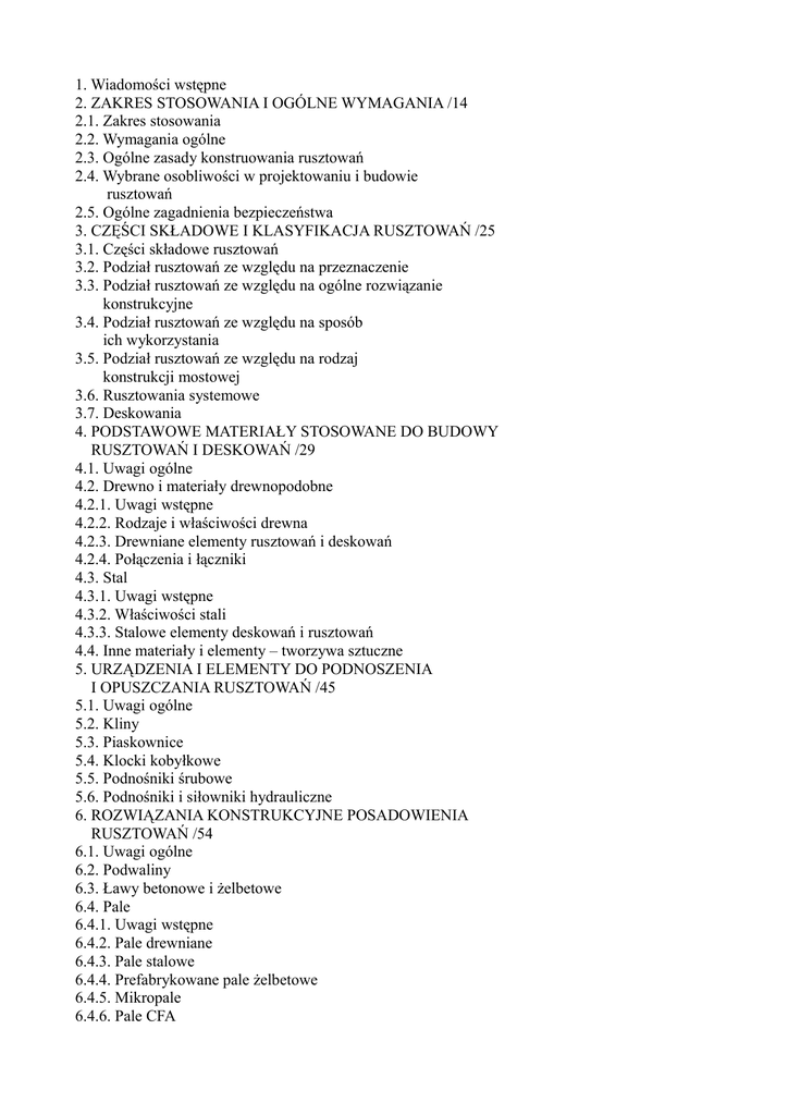 1. Wiadomości wstępne 2. ZAKRES STOSOWANIA I OGÓLNE WYMAGANIA /14 2.1. Zakres stosowania 2.2. Wymagania ogólne 2.3. Ogólne zasady konstruowania rusztowań 2.4. Wybrane osobliwości w projektowaniu i budowie rusztowań 2.5. Ogólne zagadnienia bezpieczeństwa 3. CZĘŚCI SKŁADOWE I KLASYFIKACJA RUSZTOWAŃ /25 3.1. Części składowe rusztowań 3.2. Podział rusztowań ze względu na przeznaczenie 3.3. Podział rusztowań ze względu na ogólne rozwiązanie konstrukcyjne 3.4. Podział rusztowań ze względu na sposób ich wykorzystania 3.5. Podział rusztowań ze względu na rodzaj konstrukcji mostowej 3.6. Rusztowania systemowe 3.7. Deskowania 4. PODSTAWOWE MATERIAŁY STOSOWANE DO BUDOWY RUSZTOWAŃ I DESKOWAŃ /29 4.1. Uwagi ogólne 4.2. Drewno i materiały drewnopodobne 4.2.1. Uwagi wstępne 4.2.2. Rodzaje i właściwości drewna 4.2.3. Drewniane elementy rusztowań i deskowań 4.2.4. Połączenia i łączniki 4.3. Stal 4.3.1. Uwagi wstępne 4.3.2. Właściwości stali 4.3.3. Stalowe elementy deskowań i rusztowań 4.4. Inne materiały i elementy – tworzywa sztuczne 5. URZĄDZENIA I ELEMENTY DO PODNOSZENIA I OPUSZCZANIA RUSZTOWAŃ /45 5.1. Uwagi ogólne 5.2. Kliny 5.3. Piaskownice 5.4. Klocki kobyłkowe 5.5. Podnośniki śrubowe 5.6. Podnośniki i siłowniki hydrauliczne 6. ROZWIĄZANIA KONSTRUKCYJNE POSADOWIENIA RUSZTOWAŃ /54 6.1. Uwagi ogólne 6.2. Podwaliny 6.3. Ławy betonowe i żelbetowe 6.4. Pale 6.4.1. Uwagi wstępne 6.4.2. Pale drewniane 6.4.3. Pale stalowe 6.4.4. Prefabrykowane pale żelbetowe 6.4.5. Mikropale 6.4.6. Pale CFA 6.4.7. Wysokociśnieniowa iniekcja strumieniowa „jet grouting” 6.5. Studnie 7. ROZWIĄZANIA SYSTEMOWE RUSZTOWAŃ /74 7.1. Wprowadzenie 7.1.1. Uwagi wstępne 7.1.2. Dźwigary rusztowaniowe 7.1.3. Podpory 7.2. Przegląd wybranych typów rusztowań wieżowych 7.2.1. Uwagi wstępne 7.2.2. Rusztowania firmy DOKA 7.2.3. Rusztowania firmy NOE 7.2.4. Rusztowania firmy PERI 7.2.5. Rusztowania firmy Thyssen Hünnebeck 8. RUSZTOWANIA I DESKOWANIA BETONOWYCH MOSTÓW BELKOWYCH /88 8.1. Uwagi ogólne 8.2. Wpływ technologii budowy na rozwiązania konstrukcyjne rusztowań 8.3. Rozwiązania konstrukcyjne rusztowań belkowych mostów żelbetowych 8.4. Rozwiązania konstrukcyjne rusztowań belkowych mostów sprężonych 8.4.1. Uwagi wstępne 8.4.2. Rozwiązania konstrukcyjne 8.5. Rusztowania mostów wykonywanych z elementów prefabrykowanych 8.6. Podniesienie wykonawcze 9. RUSZTOWANIA I DESKOWANIA BETONOWYCH MOSTÓW SKRZYNKOWYCH /118 9.1. Wpływ technologii budowy na rozwiązania konstrukcyjne rusztowań i deskowań 9.2. Rusztowania i deskowania betonowych mostów skrzynkowych wykonywanych tradycyjnie 9.3. Rusztowania i deskowania mostów wykonanych metodami rusztowań przesuwnych 9.4. Rusztowania i deskowania mostów wykonywanych metodą nasuwania podłużnego 9.5. Rusztowania i deskowania mostów wykonywanych metodami wspornikowymi 10. RUSZTOWANIA I DESKOWANIA BETONOWYCH MOSTÓW ŁUKOWYCH /157 10.1. Uwagi ogólne i typy rusztowań 10.2. Rusztowanie górne 10.2.1. Wiązary i deskowanie 10.2.2. Wieńce 10.2.3. Podwaliny 10.2.4. Stężenia 10.3. Kształtowanie i obliczanie krążyn 10.3.1. Kształtowanie krążyn 10.3.2. Obliczanie krążyn 10.4. Rusztowanie dolne 10.5. Rusztowania specjalne mostów łukowych 11. RUSZTOWANIA MOSTÓW STALOWYCH /196 11.1. Sposoby montażu mostów stalowych 11.2. Rusztowania pełne 11.3. Rusztowania niepełne 11.4. Rusztowania przy budowie mostów stalowych metodą nasuwania 11.4.1. Rozwiązania konstrukcyjne 11.4.2. Zasady obliczania oporu przesuwu 11.4.3. Zasady obliczania podpór montażowych 11.5. Rusztowania przy budowie mostów stalowych metodą wspornikową 11.6. Montaż mostów stalowych przy użyciu sprzętu pływającego 12. FORMY DO WYKONYWANIA PREFABRYKATÓW /225 12.1. Uwagi ogólne 12.2. Charakterystyka form stosowanych w prefabrykacji belkowej 12.3. Charakterystyka form stosowanych w prefabrykacji segmentowej 13. URZĄDZENIA DO BUDOWY MOSTÓW PODWIESZONYCH /232 13.1. Uwagi ogólne 13.2. Pylony 13.3. Pomosty betonowe 13.4. Pomosty stalowe i zespolone 14. RUSZTOWANIA DO REMONTU MOSTÓW I KOSTRUKCJE ODCIĄŻAJĄCE /238 14.1. Uwagi wstępne 14.2. Rusztowania stojakowe 14.3. Rusztowania ramowe 14.3.1. Uwagi ogólne 14.3.2. Przegląd typowych rusztowań ramowych 14.4. Rusztowania stojakowo-kryzowe 14.4.1. Uwagi wstępne 14.4.2. Przegląd typowych rusztowań stojakowo-kryzowych 14.5. Rusztowania rurowo-złączkowe 14.6. Rusztowania wieżowe 14.6.1. Uwagi wstępne 14.6.2. Przegląd wybranych systemów 14.7. Rusztowania przetaczane 14.8. Rusztowania wspornikowe 14.9. Konstrukcje odciążające 14.9.1. Konstrukcje przęseł 14.9.2. Podpory 15. RUSZTOWANIA I DESKOWANIA PODPÓR /254 15.1. Uwagi wstępne 15.2. Rusztowania i deskowania fundamentów podpór 15.3. Rusztowania i deskowania korpusów podpór i pylonów 16. RUSZTOWANIA I DESKOWANIA PRZEPUSTÓW ORAZ TUNELI PŁYTKICH /264 16.1. Przepusty 16.2. Tunele płytkie 17. ZASADY OBLICZANIA RUSZTOWAŃ /279 17.1. Uwagi ogólne 17.2. Bezpieczeństwo rusztowań 17.3. Obciążenia rusztowań 17.4. Rola sił poziomych 17.4.1. Uwzględnienie niedokładności geometrycznych 17.4.2. Usztywnienia na przemieszczenia w płaszczyźnie rusztowania 17.4.3. Obliczanie stężeń wiatrowych i usztywniających 17.4.4. Obliczanie stężeń pionowych 17.4.5. Przypadki szczególne 18. ZASADY KONSTRUOWANIA I OBLICZANIA DESKOWAŃ /302 18.1. Uwagi ogólne 18.2. Obciążenia działające na deskowanie 18.3. Obliczanie deskowania 18.3.1. Schematy obliczeniowe 18.3.2. Sprawdzenie ugięć 18.3.3. Wymiarowanie 18.3.4. Przykład liczbowy Literatura
