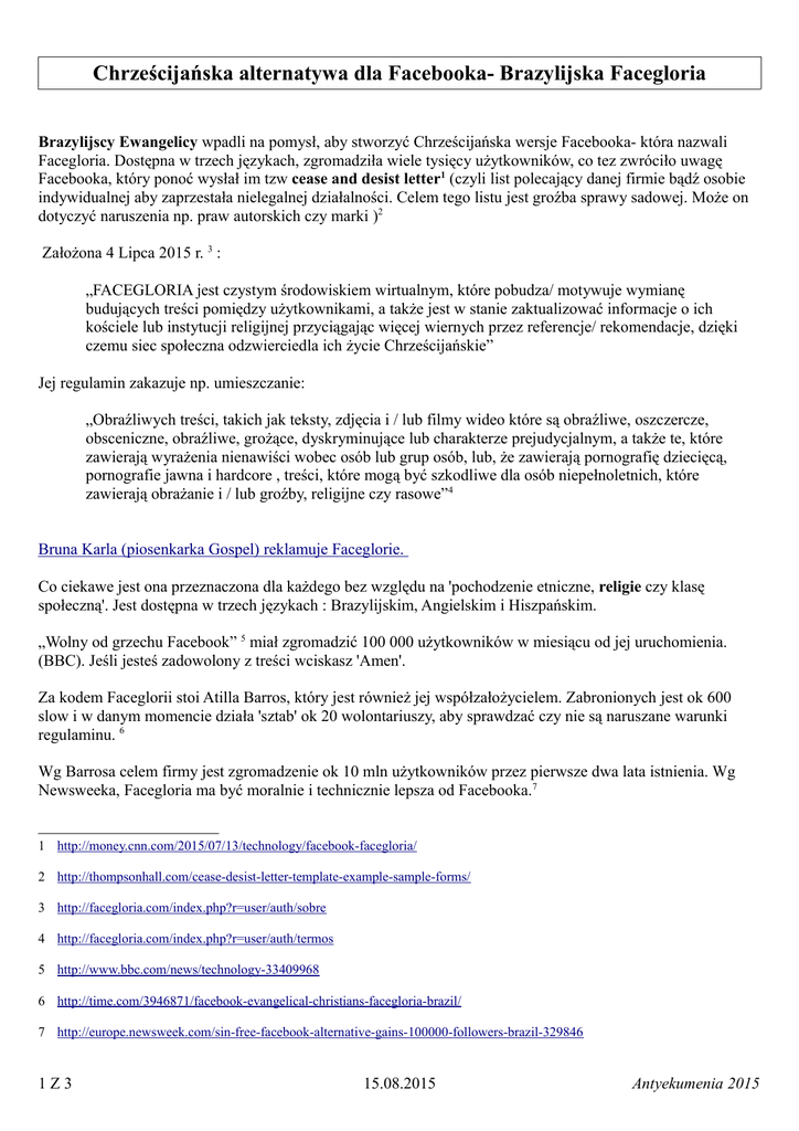 Chrześcijańska alternatywa dla Facebooka- Brazylijska Facegloria Brazylijscy Ewangelicy wpadli na pomysł, aby stworzyć Chrześcijańska wersje Facebooka- która nazwali Facegloria. Dostępna w trzech językach, zgromadziła wiele tysięcy użytkowników, co tez zwróciło uwagę Facebooka, który ponoć wysłał im tzw cease and desist letter1 (czyli list polecający danej firmie bądź osobie indywidualnej aby zaprzestała nielegalnej działalności. Celem tego listu jest groźba sprawy sadowej. Może on dotyczyć naruszenia np. praw autorskich czy marki )2 Założona 4 Lipca 2015 r. 3 : „FACEGLORIA jest czystym środowiskiem wirtualnym, które pobudza/ motywuje wymianę budujących treści pomiędzy użytkownikami, a także jest w stanie zaktualizować informacje o ich kościele lub instytucji religijnej przyciągając więcej wiernych przez referencje/ rekomendacje, dzięki czemu siec społeczna odzwierciedla ich życie Chrześcijańskie” Jej regulamin zakazuje np. umieszczanie: „Obraźliwych treści, takich jak teksty, zdjęcia i / lub filmy wideo które są obraźliwe, oszczercze, obsceniczne, obraźliwe, grożące, dyskryminujące lub charakterze prejudycjalnym, a także te, które zawierają wyrażenia nienawiści wobec osób lub grup osób, lub, że zawierają pornografię dziecięcą, pornografie jawna i hardcore , treści, które mogą być szkodliwe dla osób niepełnoletnich, które zawierają obrażanie i / lub groźby, religijne czy rasowe”4 Bruna Karla (piosenkarka Gospel) reklamuje Faceglorie. Co ciekawe jest ona przeznaczona dla każdego bez względu na 'pochodzenie etniczne, religie czy klasę społeczną'. Jest dostępna w trzech językach : Brazylijskim, Angielskim i Hiszpańskim. „Wolny od grzechu Facebook” 5 miał zgromadzić 100 000 użytkowników w miesiącu od jej uruchomienia. (BBC). Jeśli jesteś zadowolony z treści wciskasz 'Amen'. Za kodem Faceglorii stoi Atilla Barros, który jest również jej współzałożycielem. Zabronionych jest ok 600 slow i w danym momencie działa 'sztab' ok 20 wolontariuszy, aby sprawdzać czy nie są naruszane warunki regulaminu. 6 Wg Barrosa celem firmy jest zgromadzenie ok 10 mln użytkowników przez pierwsze dwa lata istnienia. Wg Newsweeka, Facegloria ma być moralnie i technicznie lepsza od Facebooka.7 1 http://money.cnn.com/2015/07/13/technology/facebook-facegloria/ 2 http://thompsonhall.com/cease-desist-letter-template-example-sample-forms/ 3 http://facegloria.com/index.php?r=user/auth/sobre 4 http://facegloria.com/index.php?r=user/auth/termos 5 http://www.bbc.com/news/technology-33409968 6 http://time.com/3946871/facebook-evangelical-christians-facegloria-brazil/ 7 http://europe.newsweek.com/sin-free-facebook-alternative-gains-100000-followers-brazil-329846 1Z3 15.08.2015 Antyekumenia 2015 Telegraph podaje nazwiska założycieli: „Thiago Severo, Terry Davis, Daiane Santos i Atilla Barros ”8 Wg oszacowań, do roku 2040 – ewangelicy będą stanowić WIEKSZOSC populacji Brazylii, więc Facegloria chce mieć w tym udział. Można tu zadać parę pytań. Zdajemy sobie sprawę, ze umożliwienie założenia konta na Faceglorii osobom z rożnych religii, daje okazje aby ich ewangelizować. Czy jednak niektóre z tych obwarowań nie spowodują poprawności politycznej oraz ekumenii? Czy jeśli napiszesz komuś prawdę na temat pewnych rzeczy, to czy nie będzie to postrzegane przez 'policje myślową' jako atak, pomówienie itd. No bo, jeśli napisze, katolicyzm nie jest od Boga i podam przykłady z Biblii, nie każdemu może się to spodobać, prawda? Ba, co jeśli obnażysz co dany pastor naucza- czy można to podciągnąć pod 'nienawiść'? Co rozumiemy przez oszczerstwo? Jeśli pastor mówi np.: byłem w sanktuarium Maryjnym a ktoś o tym napisze- czy jest to 'pomówienie/ oszczerstwo'? Prasa na zachodzie nie jest zadowolona, ze chcą cenzorować ich brud. W odróżnieniu od Facebooka czy YouTube, gdzie pedzie i lezbijki zamieszczają swoje obrzydliwe obrazki i filmiki, Facegloria będzie zakazywać propagowania nauki Sodomy. A to godzi w zło globalizmu. I bardzo dobrze... Bruna Karla to 'twarz Faceglorii', która jest znana wokalistka. Globo.com podaje, ze reklamuje ja również inna piosenkarka Gospel, Aline Barros 9 obok Soraya Moraes czy apostoła Valdemiro Santiago(Igreja Mundial do Poder de Deus). Czy Facegloria to naprawdę wielka alternatywa czy tylko wybieranie mniejszego zła? Na przykład w Polsce jest Forum Protestanci10 i nie zabierze ci długo, aby dostrzec, ze tzw moderatorzy to ekumenicy. Oni, podając się za np. Zielonoświątkowców i innych próbują perswadować ci, ze twoje stanowisko jest 'złe' a ich 'dobre'. Jeśli napiszesz 'za mocno' to cie wywala bez zapowiedzi. Dla ciekawostki można podać, ze Facebook również cenzuruje, tylko wg własnych kryteriów. Kryminaliści z Państwa Islamskiego maja na nim konto, ale zakazują np. zdjęć kobiet karmiących piersią dzieci.11 Niepolitycznie poprawne artykuły bądź opinie mogą zostać usunięte. Przecieki dokumentów ujawniły współprace między NSA(Amerykańska Narodowa Agencja Bezpieczeństwa) a „Microsoft, Yahoo, Google, Facebook, PalTalk, AOL, Skype, YouTube, Apple ” w postaci projektu PRISM12. 13 Założyciel Facebooka, Mark Zuckerberg zapiera się wiedzy na ten temat.14 Jeśli jest to prawda, to internet jest wielkim narzędziem szpiegowania- myśli, przekonań i danych osobowych! Co sadzisz na ten temat? Czy jako Polak byłbyś skory założyć konto na Facegloria? Jeśli nie przyjąłeś jeszcze Jezusa, jako Pana i Zbawiciela, dzisiaj masz doskonalą okazje. Pokłon głowę gdzie siedzisz, poproś, aby Jezus 8 http://www.telegraph.co.uk/news/worldnews/southamerica/brazil/11718235/Brazilian-Evangelicals-set-up-a-sin-free-version-ofFacebook.html 9 http://g1.globo.com/tecnologia/noticia/2015/06/facegloria-o-facebook-evangelico-veta-beijo-gay-e-libera-foto-de-biquini.html 10 http://forum.protestanci.info/ 11 https:/