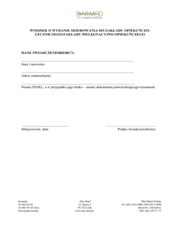 WNIOSEK O WYDANIE SKIEROWANIA DO ZAKŁADU OPIEKUŃCZOLECZNICZEGO/ZAKŁADU PIELĘGNACYJNO-OPIEKUŃCZEGO DANE ŚWIADCZENIOBIORCY: ............................................................................................................................ Imię i nazwisko ............................................................................................................................ Adres zamieszkania ............................................................................................................................. Numer PESEL, a w przypadku jego braku – numer dokumentu potwierdzającego tożsamość ................................................... Miejscowość, data Kontakt: 42 682-92-62 42 682-92-65 (fax) [email protected] ………………………………….. Podpis świadczeniobiorcy „Dar-Med” ul. Mylna 2 93-372 Łódź www.dar-med.pl PKO Bank Polska 92 1020 3352 0000 1902 0213 4898 REGON: 310320532 NIP: 668-159-17-77 SKIEROWANIE DO ZAKŁADU OPIEKUŃCZO-LECZNICZEGO/ ZAKŁADU PIELĘGNACYJNO-OPIEKUŃCZEGO* Niniejszym kieruję: ....................................................................................................................................................... Imię i nazwisko świadczeniobiorcy ....................................................................................................................................................... Adres zamieszkania świadczeniobiorcy ....................................................................................................................................................... Adres do korespondencji (jeżeli jest inny niż adres zamieszkania) ....................................................................................................................................................... Nr telefonu do kontaktu ....................................................................................................................................................... Numer PESEL świadczeniobiorcy, a w przypadku jego braku – numer dokumentu potwierdzającego tożsamość świadczeniobiorcy ....................................................................................................................................................... Rozpoznanie w języku polskim według ICD-10 (choroba zasadnicza i choroby współistniejące) ....................................................................................................................................................... Dotychczasowe leczenie Potrzeba kontynuacji dotychczasowego leczenia (tak/nie*) Liczba punktów w skali Barthel, którą uzyskał świadczeniobiorca: ........................................... Przypadek nagły, wynikający ze zdarzeń losowych i uzasadniony stanem zdrowia (tak/nie)* …………………………………………………………………………………………………………………………………………….. Lekarz podstawowej opieki zdrowotnej świadczeniobiorcy (imię, nazwisko, nr telefonu do kontaktu) ....................................................................................................................................................... Pielęgniarka podstawowej opieki zdrowotnej świadczeniobiorcy (imię, nazwisko, nr telefonu do kontaktu) – do zakładu opiekuńczo-leczniczego/zakładu pielęgnacyjno-opiekuńczego*. .......................................................... Miejscowość, data .................................................................. Podpis lekarza ubezpieczenia zdrowotnego oraz pieczęć podmiotu leczniczego, w przypadku gdy lekarz ubezpieczenia zdrowotnego wykonuje zawód w tym podmiocie * Niepotrzebne skreślić. Kontakt: 42 682-92-62 42 682-92-65 (fax) [email protected] „Dar-Med” ul. Mylna 2 93-372 Łódź www.dar-med.pl PKO Bank Polska 92 1020 3352 0000 1902 0213 4898 REGON: 310320532 NIP: 668-159-17-77