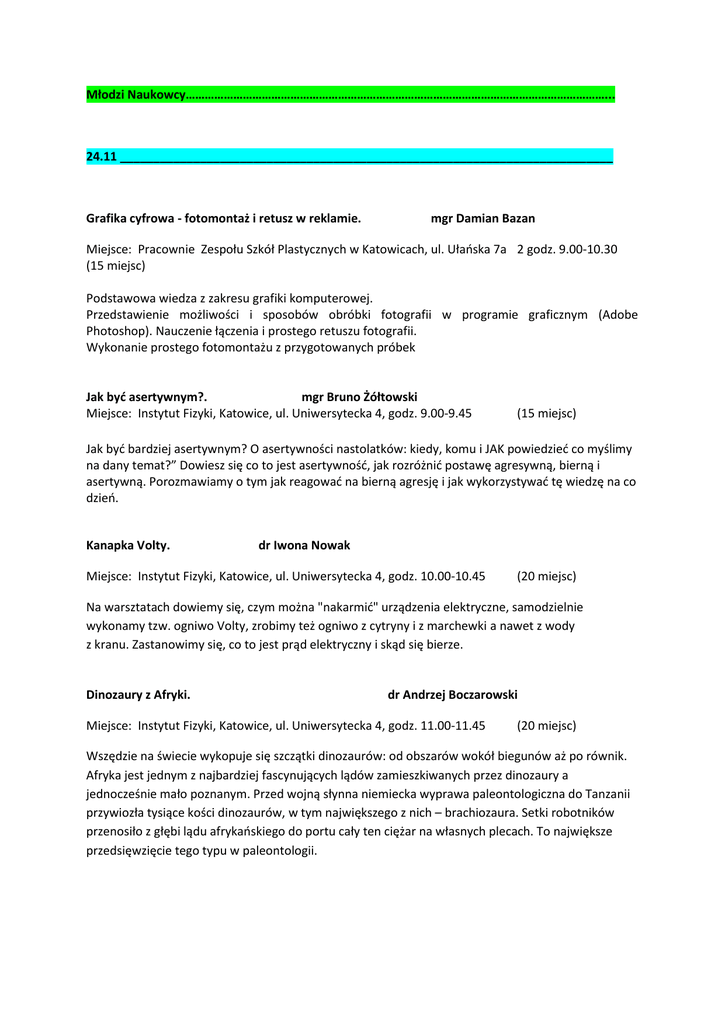 Młodzi Naukowcy……………………………………………………………………………………………………………………... 24.11 __________________________________________________________________________ Grafika cyfrowa - fotomontaż i retusz w reklamie. mgr Damian Bazan Miejsce: Pracownie Zespołu Szkół Plastycznych w Katowicach, ul. Ułaoska 7a 2 godz. 9.00-10.30 (15 miejsc) Podstawowa wiedza z zakresu grafiki komputerowej. Przedstawienie możliwości i sposobów obróbki fotografii w programie graficznym (Adobe Photoshop). Nauczenie łączenia i prostego retuszu fotografii. Wykonanie prostego fotomontażu z przygotowanych próbek Jak byd asertywnym?. mgr Bruno Żółtowski Miejsce: Instytut Fizyki, Katowice, ul. Uniwersytecka 4, godz. 9.00-9.45 (15 miejsc) Jak byd bardziej asertywnym? O asertywności nastolatków: kiedy, komu i JAK powiedzied co myślimy na dany temat?” Dowiesz się co to jest asertywnośd, jak rozróżnid postawę agresywną, bierną i asertywną. Porozmawiamy o tym jak reagowad na bierną agresję i jak wykorzystywad tę wiedzę na co dzieo. Kanapka Volty. dr Iwona Nowak Miejsce: Instytut Fizyki, Katowice, ul. Uniwersytecka 4, godz. 10.00-10.45 (20 miejsc) Na warsztatach dowiemy się, czym można "nakarmid" urządzenia elektryczne, samodzielnie wykonamy tzw. ogniwo Volty, zrobimy też ogniwo z cytryny i z marchewki a nawet z wody z kranu. Zastanowimy się, co to jest prąd elektryczny i skąd się bierze. Dinozaury z Afryki. dr Andrzej Boczarowski Miejsce: Instytut Fizyki, Katowice, ul. Uniwersytecka 4, godz. 11.00-11.45 (20 miejsc) Wszędzie na świecie wykopuje się szczątki dinozaurów: od obszarów wokół biegunów aż po równik. Afryka jest jednym z najbardziej fascynujących lądów zamieszkiwanych przez dinozaury a jednocześnie mało poznanym. Przed wojną słynna niemiecka wyprawa paleontologiczna do Tanzanii przywiozła tysiące kości dinozaurów, w tym największego z nich – brachiozaura. Setki robotników przenosiło z głębi lądu afrykaoskiego do portu cały ten ciężar na własnych plecach. To największe przedsięwzięcie tego typu w paleontologii. Martwa natura – collage. mgr Beata Hanslik-Janiszewska, mgr Izabella Kornas Miejsce: Pracownie Zespołu Szkół Plastycznych w Katowicach, ul. Ułaoska 7a, godz. 12.00-12.45 (20 miejsc) Swobodna interpretacja kompozycji w pracowni. Dzieci malują, naklejają papier, rysują etc., pracują farbami plakatowymi lub temperami, pastelami, kleją, tworzą na brystolach 100x70. Od pomysłu do scenariusza. mgr Elżbieta Omelan Miejsce: Instytut Fizyki, Katowice, ul. Uniwersytecka 4, godz. 13.00-13.45 (15 miejsc) Od pomysłu do scenariusza: scenariusz, scenopis, storyboard – piszemy i rysujemy swój film. Piszemy scenariusz i realizujemy własny film. Grafika cyfrowa - fotomontaż i retusz w reklamie. 8.12 __________________________________________________________________________ Robimy zabawki optyczne. dr Justyna Budzik Miejsce: Instytut Fizyki, Katowice, ul. Uniwersytecka 4, godz. 9.00-9.45 (15 miejsc) Uczniowie podzieleni na kilkuosobowe grupy tworzą – na podstawie wzorów – 3 typy zabawek optycznych, np. flipbook, taumatrop i zootrop, ucząc się tym samym na czym polega iluzja ruchu W krainie muzycznej wyobraźni- teledysk, czyli muzyka obrazu. dr Edyta Kaszyca Miejsce: Instytut Fizyki, Katowice, ul. Uniwersytecka 4, godz. 10.00-10.45 (15 miejsc) Język, cechy, twórcy i ich sposoby na tworzenie teledysków. Warsztaty tworzenia scenariuszy wideoklipów dla dzieci (widzących i niewidzących, niepełnosprawnych). Zajęcia mają na celu przybliżenie specyfiki teledysku (prezentacja multimedialne z fragmentami teledysków), pokazanie najciekawszych form "kreacji wyobraźni" inspirowanych muzyką i słowem (tekstem piosenki). Dzieci po zapoznaniu się z krótką historią i językiem "wideoklipowej opowieści" zostaną podzielone na koedukacyjne grupy, których zadaniem będzie stworzenie opisu (słownego w formie pisemnej - scenariusza lub rysunkowej - storyboard) do piosenki. Dlaczego mydło myje? dr Iwona Nowak Miejsce: Instytut Fizyki, Katowice, ul. Uniwersytecka 4, godz. 11.00-11.45 (20 miejsc) Dlaczego mydło myje? Poznamy budowę chemiczną cząsteczek mydła. Spróbujemy dowiedzied się jak mydło usuwa plamy. Z przygotowanych składników sami wykonamy ekologiczną pastę do zębów. Czy to już WALL-E? dr Jolanta Sobera Miejsce: Instytut Fizyki, Katowice, ul. Uniwersytecka 4, godz. 12.00-12.45 (20 miejsc) Czy pamiętacie robota mozolnie sprzątającego Ziemię? Spróbujmy go zbudowad. Na zajęciach zapoznamy się z działaniem czujników: ultradźwiękowego, dotyku i światła. Przyjrzymy się środowisku programistycznemu, dzięki któremu robot dostaje życie. Wspólnie napiszemy krótki program. Zastanowimy się gdzie można zobaczyd zastosowanie w/w czujników. 12.01.2013 _______________________________________________________________________ Chemia organiczna – skąd my to znamy? dr Barbara podeszwa, dr Stella Hensel-Bielówka Miejsce: Instytut Chemii, Katowice, ul. Szkolna 9, godz. 9.00-9.45 (12 miejsc) W laboratorium studenci UŚD będą przeprowadzad doświadczenia z zakresu chemii organicznej. W czasie zajęd wykorzystają substancje znane z codziennego życia, używając ich do ciekawych eksperymentów chemicznych. Chemia organiczna – skąd my to znamy? dr Barbara podeszwa, dr Stella Hensel-Bielówka Miejsce: Instytut Chemii, Katowice, ul. Szkolna 9, godz. 12.00-12.45 (12 miejsc) W laboratorium studenci UŚD będą przeprowadzad doświadczenia z zakresu chemii organicznej. W czasie zajęd wykorzystają substancje znane z codziennego życia, używając ich do ciekawych eksperymentów chemicznych. Co stawonogi mają w środku? – poznajemy budowę anatomiczną stawonogów. mgr Łukasz Chajec Miejsce: Wydział Biologii i Ochrony Środowiska, Katowice, ul. Bankowa 9, godz. 9.00-9.45 (12 miejsc) Poznanie budowy anatomicznej wybranych przedstaw