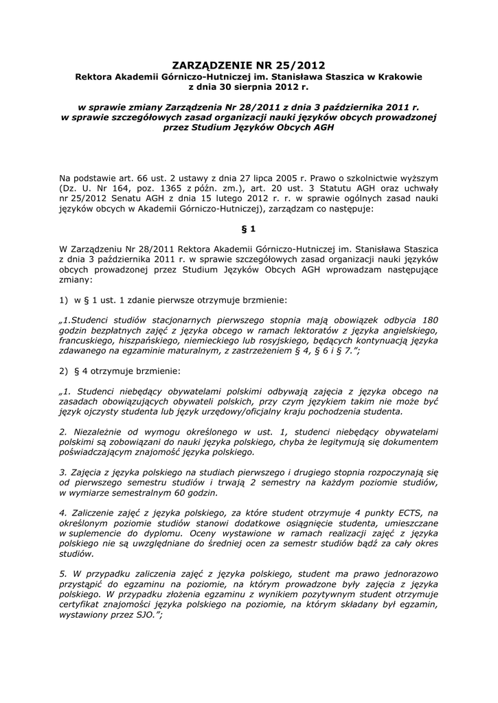 ZARZĄDZENIE NR 25/2012 Rektora Akademii Górniczo-Hutniczej im. Stanisława Staszica w Krakowie z dnia 30 sierpnia 2012 r. w sprawie zmiany Zarządzenia Nr 28/2011 z dnia 3 października 2011 r. w sprawie szczegółowych zasad organizacji nauki języków obcych prowadzonej przez Studium Języków Obcych AGH Na podstawie art. 66 ust. 2 ustawy z dnia 27 lipca 2005 r. Prawo o szkolnictwie wyższym (Dz. U. Nr 164, poz. 1365 z późn. zm.), art. 20 ust. 3 Statutu AGH oraz uchwały nr 25/2012 Senatu AGH z dnia 15 lutego 2012 r. r. w sprawie ogólnych zasad nauki języków obcych w Akademii Górniczo-Hutniczej), zarządzam co następuje: §1 W Zarządzeniu Nr 28/2011 Rektora Akademii Górniczo-Hutniczej im. Stanisława Staszica z dnia 3 października 2011 r. w sprawie szczegółowych zasad organizacji nauki języków obcych prowadzonej przez Studium Języków Obcych AGH wprowadzam następujące zmiany: 1) w § 1 ust. 1 zdanie pierwsze otrzymuje brzmienie: „1.Studenci studiów stacjonarnych pierwszego stopnia mają obowiązek odbycia 180 godzin bezpłatnych zajęć z języka obcego w ramach lektoratów z języka angielskiego, francuskiego, hiszpańskiego, niemieckiego lub rosyjskiego, będących kontynuacją języka zdawanego na egzaminie maturalnym, z zastrzeżeniem § 4, § 6 i § 7.”; 2) § 4 otrzymuje brzmienie: „1. Studenci niebędący obywatelami polskimi odbywają zajęcia z języka obcego na zasadach obowiązujących obywateli polskich, przy czym językiem takim nie może być język ojczysty studenta lub język urzędowy/oficjalny kraju pochodzenia studenta. 2. Niezależnie od wymogu określonego w ust. 1, studenci niebędący obywatelami polskimi są zobowiązani do nauki języka polskiego, chyba że legitymują się dokumentem poświadczającym znajomość języka polskiego. 3. Zajęcia z języka polskiego na studiach pierwszego i drugiego stopnia rozpoczynają się od pierwszego semestru studiów i trwają 2 semestry na każdym poziomie studiów, w wymiarze semestralnym 60 godzin. 4. Zaliczenie zajęć z języka polskiego, za które student otrzymuje 4 punkty ECTS, na określonym poziomie studiów stanowi dodatkowe osiągnięcie studenta, umieszczane w suplemencie do dyplomu. Oceny wystawione w ramach realizacji zajęć z języka polskiego nie są uwzględniane do średniej ocen za semestr studiów bądź za cały okres studiów. 5. W przypadku zaliczenia zajęć z języka polskiego, student ma prawo jednorazowo przystąpić do egzaminu na poziomie, na którym prowadzone były zajęcia z języka polskiego. W przypadku złożenia egzaminu z wynikiem pozytywnym student otrzymuje certyfikat znajomości języka polskiego na poziomie, na którym składany był egzamin, wystawiony przez SJO.”; 3) § 6 otrzymuje brzmienie: „1. Studenci posiadający certyfikaty znajomości języka wymienione w załączniku nr 2 do niniejszego zarządzenia na studiach pierwszego stopnia są zwolnieni z odbywania zajęć i egzaminu z języka obcego i uzyskują wpis oceny z egzaminu na podstawie przedłożonego certyfikatu. Ocena końcowa ustalana jest zgodnie z oceną umieszczoną na certyfikacie. Wpis oceny końcowej oraz uwzględnienie punktów ECTS następuje w tym semestrze studiów, w którym zgodnie z planem studiów obowiązującym na danym kierunku i poziomie studiów, kończą się zajęcia z języka obcego. 2. Studenci, o których mowa w ust. 1 mogą bezpłatnie kontynuować naukę języka obcego wymienionego w certyfikacie albo uczestniczyć w zajęciach z innego języka spośród określonych w § 1 ust. 1 na dowolnym poziomie w wymiarze do 180 godzin, w zależności od liczby godzin wcześniej wykorzystanych zajęć. O swojej decyzji student winien poinformować SJO poprzez zapisanie się na wybrany język w sekretariacie SJO na tydzień przed początkiem danego semestru. O przydziale na kurs językowy decyduje kolejność zgłoszeń z uwagi na możliwości kadrowe SJO.”; 4) w § 7 ust. 3 i 4 otrzymują brzmienie: „3. W przypadku wcześniejszego zaliczenia lektoratu, na zasadach określonych w ust. 1 i 2, wpis oceny końcowej oraz uwzględnienie punktów ECTS następuje w tym semestrze studiów, w którym zgodnie z planem studiów obowiązującym na danym kierunku i poziomie studiów, kończą się zajęcia z języka obcego. 4. Studenci, o których mowa w ust. 1 i ust. 2, w przypadku złożenia egzaminu z języka obcego z wynikiem pozytywnym mogą bezpłatnie kontynuować naukę języka obcego albo uczestniczyć w zajęciach z innego języka spośród określonych w § 1 ust. 1 na dowolnym poziomie w wymiarze godzin, który łącznie z zaliczonymi zajęciami nie przekroczy 180 godzin. O swojej decyzji student winien poinformować SJO poprzez zapisanie się na wybrany język w sekretariacie SJO na tydzień przed początkiem danego semestru. O przydziale na kurs językowy decyduje kolejność zgłoszeń z uwagi na możliwości kadrowe SJO.”; 5) po § 7 dodaje się § 7a o tytule „Dodatkowy kurs językowy” w następującym brzmieniu: „1. W przypadkach, o których mowa w § 6 ust. 2 i § 7 ust. 4, student otrzymuje punkty ECTS za zaliczenie bloku zajęć w ramach dodatkowego kursu językowego w następującej wysokości: a) blok 90 godzin – 4 ECTS, b) blok 60 godzin – 3 ECTS pod warunkiem spełnienia przez studenta wymagań dotyczących uzyskania zakładanych efektów kształcenia dla danego poziomu kursu. Punkty ECTS wpisywane są po ukończeniu pełnego, tj. dwusemestralnego, kursu. 2. Zaliczenie bloku zajęć w ramach dodatkowego kursu językowego na określonym poziomie stanowi dodatkowe osiągnięcie studenta, umieszczane w suplemencie do dyplomu. Oceny wystawione w ramach realizacji dodatkowego kursu językowego nie są uwzględniane do średniej ocen za semestr studiów bądź za cały okres studiów. 3. W przypadku zaliczenia dodatkowego kursu językowego, student ma prawo jednorazowo przystąpić do egzaminu na poziomie, na którym prowadzony był kurs. W przypadku 