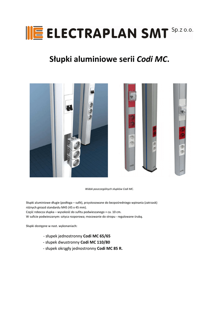Słupki aluminiowe serii Codi MC. Widok poszczególnych słupków Codi MC. Słupki aluminiowe długie (podłoga – sufit), przystosowane do bezpośredniego wpinania (zatrzask) różnych gniazd standardu M45 (45 x 45 mm). Część robocza słupka – wysokość do sufitu podwieszanego + ca. 10 cm. W suficie podwieszanym: sztyca rozporowa; mocowanie do stropu - regulowane śrubą. Słupki dostępne w nast. wykonaniach: - słupek jednostronny Codi MC 65/65 - słupek dwustronny Codi MC 110/80 - słupek okrągły jednostronny Codi MC 85 R. 1. Słupki Codi MC 65/65. Codi MC 65/65 Słupek aluminiowy anodowany; na życzenie lakier proszkowy na podany RAL. Słupek jednokomorowy (jednostronny). Przegroda z pcv do podziału komory słupka. Pokrywa C45 z aluminium (anodowana lub lakierowana, tak jak słupek). Boczne listewki dostępne w 6 kolorach: biały, niebieski, żółty, czerwony, zielony i antracyt. Stopka z tworzywa (ABS) lub z blachy stalowej. Mocowanie słupka do sufitu. Mocowanie skryte w przestrzeni sufitu podwieszanego. Śruba rozporowa umożliwia regulację (dopasowanie) mocowania słupka w zakresie: 40 – 110 mm. A następnie jego zablokowanie (nakrętka kontrująca). Standardowa wysokość słupka : 3200 mm. 2. Słupki CODI MC 110/80. CODI MC 110/80 Słupek aluminiowy anodowany; na życzenie lakier proszkowy na podany RAL. Dwie niezależne komory w słupku. Pokrywa C45 z aluminium (anodowana lub lakierowana, tak jak słupek). Boczne listewki dostępne w 6 kolorach: biały, niebieski, żółty, czerwony, zielony i antracyt. Stopka z tworzywa (ABS) lub z blachy stalowej. 3 standardowe długości (wysokości). Na żądanie słupki o maks. wysokości 6 mb. Mocowanie słupka. Mocowanie regulowane w przestrzeni sufitu podwieszanego. Do sufitu mocowanie rozporowe. Zakres regulacji: 50 -1000 mm. Następnie zablokowanie słupka. 3. Słupki Codi MC 85R. Codi MC 85R Słupek aluminiowy anodowany; Na życzenie lakier (RAL). Cylindryczny kształt słupka; komora dzielona na 2 części przegrodą z pcv typ CLV 60. Spłaszczona ścianka umożliwia bezpośredni montaż gniazd M45. Pokrywa aluminiowa C45 - umożliwia montaż gniazd M45. Korpus słupka o wys. 3,20 m. Przegroda CLV o dł. 2,70 m. Mocowanie do sufitu. Sztyca rozporowa skryta w suficie podwieszanym. Zakres regulacji: 50 – 1000 mm. Następnie blokada sztycy (nakrętka kontrująca). Standardowe (bazowe) wymiary słupków CODI MC. Typ słupka – oznaczenie Wysokość korpusu słupka (mm) Maks. wysokość do sufitu podwieszanego (mm) Maks. wysokość słupka do stropu (mm) CODI MC 65/65 CODI MC 110/80 - 285 CODI MC 110/80 - 335 CODI MC 110/80 - 385 CODI MC 85R 3200 2850 3350 3850 3200 3150 2800 3300 3800 3150 3350 3850 4350 4850 4200 Uwaga: maks. wysokość słupków j.w. – 6 mb. Profile (przekroje) wybranych słupków anodowanych CODI MC. Maskownice przejścia słupka przez sufit podwieszany (standard: ABS biały). Maskownice dwuczęściowe(z 2 części).