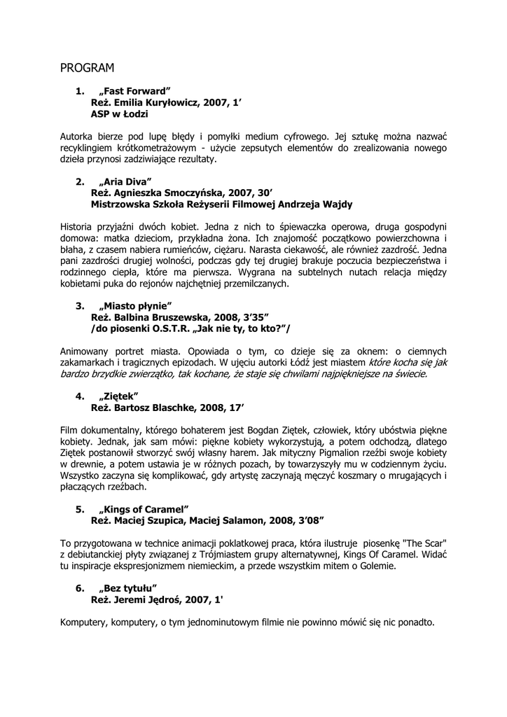 PROGRAM 1. „Fast Forward” ReŜ. Emilia Kuryłowicz, 2007, 1’ ASP w Łodzi Autorka bierze pod lupę błędy i pomyłki medium cyfrowego. Jej sztukę moŜna nazwać recyklingiem krótkometraŜowym - uŜycie zepsutych elementów do zrealizowania nowego dzieła przynosi zadziwiające rezultaty. 2. „Aria Diva” ReŜ. Agnieszka Smoczyńska, 2007, 30’ Mistrzowska Szkoła ReŜyserii Filmowej Andrzeja Wajdy Historia przyjaźni dwóch kobiet. Jedna z nich to śpiewaczka operowa, druga gospodyni domowa: matka dzieciom, przykładna Ŝona. Ich znajomość początkowo powierzchowna i błaha, z czasem nabiera rumieńców, cięŜaru. Narasta ciekawość, ale równieŜ zazdrość. Jedna pani zazdrości drugiej wolności, podczas gdy tej drugiej brakuje poczucia bezpieczeństwa i rodzinnego ciepła, które ma pierwsza. Wygrana na subtelnych nutach relacja między kobietami puka do rejonów najchętniej przemilczanych. 3. „Miasto płynie” ReŜ. Balbina Bruszewska, 2008, 3’35” /do piosenki O.S.T.R. „Jak nie ty, to kto?”/ Animowany portret miasta. Opowiada o tym, co dzieje się za oknem: o ciemnych zakamarkach i tragicznych epizodach. W ujęciu autorki Łódź jest miastem które kocha się jak bardzo brzydkie zwierzątko, tak kochane, Ŝe staje się chwilami najpiękniejsze na świecie. 4. „Ziętek” ReŜ. Bartosz Blaschke, 2008, 17’ Film dokumentalny, którego bohaterem jest Bogdan Ziętek, człowiek, który ubóstwia piękne kobiety. Jednak, jak sam mówi: piękne kobiety wykorzystują, a potem odchodzą, dlatego Ziętek postanowił stworzyć swój własny harem. Jak mityczny Pigmalion rzeźbi swoje kobiety w drewnie, a potem ustawia je w róŜnych pozach, by towarzyszyły mu w codziennym Ŝyciu. Wszystko zaczyna się komplikować, gdy artystę zaczynają męczyć koszmary o mrugających i płaczących rzeźbach. 5. „Kings of Caramel” ReŜ. Maciej Szupica, Maciej Salamon, 2008, 3’08” To przygotowana w technice animacji poklatkowej praca, która ilustruje piosenkę "The Scar" z debiutanckiej płyty związanej z Trójmiastem grupy alternatywnej, Kings Of Caramel. Widać tu inspiracje ekspresjonizmem niemieckim, a przede wszystkim mitem o Golemie. 6. „Bez tytułu” ReŜ. Jeremi Jędroś, 2007, 1' Komputery, komputery, o tym jednominutowym filmie nie powinno mówić się nic ponadto. CZĘŚĆ DRUGA 7. „Kanał” ReŜ. Paulina Bobrycz, 2008, 6'39'' PWSFTviT Pierwsze ujęcia tej animacji sprawiają, Ŝe kaŜdy kuli się w swoim fotelu, bowiem czuje, Ŝe zbliŜa się do niego ogromne wiertło dentystyczne. Mroczny pokój, przeraŜona pacjentka i… leczenie kanałowe. O zaskakujących konsekwencjach borowania. 8. „T.Rickster” ReŜ. Justyna Łuczaj-Salej, 2007, 27' PWSFTviT Trickster to w mitologii i literaturze osoba, która postępuje wbrew ustalonemu porządkowi, regułom, dba o powtarzanie się cyklu tworzenia i niszczenia. Główna bohaterka filmu snuje się po mieście, spotyka mniej lub bardziej dziwnych ludzi, wchodzi w głąb swojej podświadomości. Oniryczny, podszyty szczególnym suspensem, nastrój filmu przywodzi na myśl twórczość Davida Lyncha. 9. „eFTe radzi - Nie ryzykuj. Segreguj” ReŜ. Przemysław Adamski, Katarzyna Kijek, 2008, 1'52'' Reklama społeczna, która powstała w ramach ‘Nowych Horyzontów EFTE’. Składa się na nią kilka krótkich filmów animowanych poświęconych świadomej konsumpcji, recyklingowi odpadów i sprawiedliwemu handlowi. W zgrabnej animacji, która sięga do motywów klasycznych filmów science fiction, w zabawny i nie natrętnie dydaktyczny sposób została przedstawiona idea segregacji. 10. „Film o Kostuchu” ReŜ. Piotr Bosacki, 2008, 2’ 50’’ Na ekranie początkowo widzimy tylko kwadrat w kratkę, potem powoli z gwoździ i gumki jest budowany kostuch. Dziecięcy głos z offu informuje o idei kostucha. Komentarz momentami zahacza o filozofię, lecz częściej o absurdalny humor. 11. „Myjnia” ReŜ. Jan P. Matuszyński, 2007, 19'36'' UŚ WRiT To film o rzadko spotykanym w polskim kinie tempie i dynamizmie. Zrealizowany według najlepszych wzorców kina gatunków. Jest i suspens, i napięcie, i niepokój. Trzech męŜczyzn musi poradzić sobie z sytuacją, która jest trochę jak z tragedii antycznej, a trochę jak z filmów Tarantino. 12. „Metka” ReŜ. Piotr Szewczyk, Małgorzata Jabłońska, 2009, 2’22” /Do piosenki The Complainer & The Complainers “Metka”/ Króciutka animacja, która pokazuje, Ŝe wszystko moŜe być dziś tematem sztuki. Tekst z metki na ubraniach plus zabawnie potraktowany temat globalizacji to wszystko, czego potrzeba, by zrobić z niczego intrygujące coś.