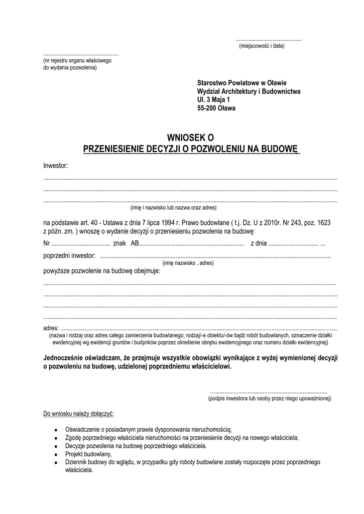 ........................................... (miejscowość i data) ................................................. (nr rejestru organu właściwego do wydania pozwolenia) Starostwo Powiatowe w Oławie Wydział Architektury i Budownictwa Ul. 3 Maja 1 55-200 Oława WNIOSEK O PRZENIESIENIE DECYZJI O POZWOLENIU NA BUDOWĘ Inwestor: ................................................................................................................................................................................................ ................................................................................................................................................................................................ ................................................................................................................................................................................................ (imię i nazwisko lub nazwa oraz adres) na podstawie art. 40 - Ustawa z dnia 7 lipca 1994 r. Prawo budowlane ( t.j. Dz. U z 2010r. Nr 243, poz. 1623 z późn. zm. ) wnoszę o wydanie decyzji o przeniesieniu pozwolenia na budowę: Nr ................................... znak AB............................................................... z dnia .............................. ... poprzedni inwestor: .......................................................................................................................................... powyższe pozwolenie na budowę obejmuje: (imię nazwisko , adres) ............................................................................................................................................................................................... ................................................................................................................................................................................................ ................................................................................................................................................................................................ …............................................................................................................................................................................................ adres: ..................................................................................................................................................................................... (nazwa i rodzaj oraz adres całego zamierzenia budowlanego, rodzaj/-e obiektu/-ów bądź robót budowlanych, oznaczenie działki ewidencyjnej wg ewidencji gruntów i budynków poprzez określenie obrębu ewidencyjnego oraz numeru działki ewidencyjnej) Jednocześnie oświadczam, że przejmuje wszystkie obowiązki wynikające z wyżej wymienionej decyzji o pozwoleniu na budowę, udzielonej poprzedniemu właścicielowi. …......................................................................... (podpis inwestora lub osoby przez niego upoważnionej) Do wniosku należy dołączyć: Oświadczenie o posiadanym prawie dysponowania nieruchomością; Zgodę poprzedniego właściciela nieruchomości na przeniesienie decyzji na nowego właściciela; Decyzje pozwolenia na budowę poprzedniego właściciela. Projekt budowlany, Dziennik budowy do wglądu, w przypadku gdy roboty budowlane zostały rozpoczęte przez poprzedniego właściciela.