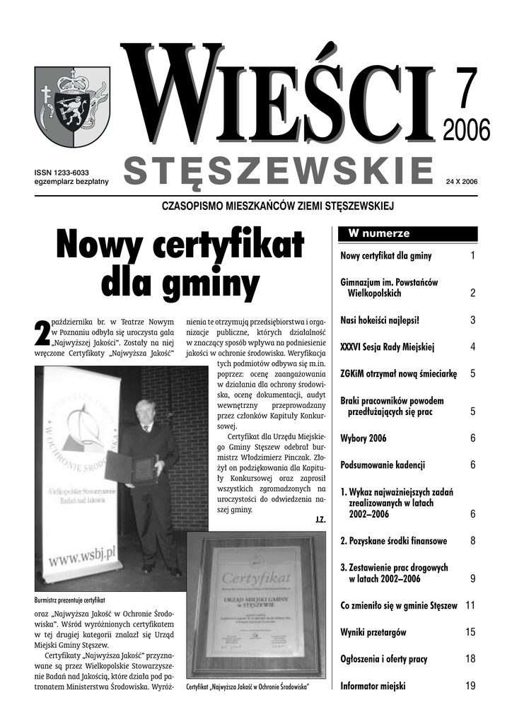 ISSN 1233-6033 egzemplarz bezp∏atny WIEÂCI 7 2006 ST¢SZEWSKIE 24 X 2006 CZASOPISMO MIESZKA¡CÓW ZIEMI ST¢SZEWSKIEJ Nowy certyfikat dla gminy 2 paêdziernika br. w Teatrze Nowym w Poznaniu odby∏a si´ uroczysta gala „Najwy˝szej JakoÊci”. Zosta∏y na niej wr´czone Certyfikaty „Najwy˝sza JakoÊç” nienia te otrzymujà przedsi´biorstwa i organizacje publiczne, których dzia∏alnoÊç w znaczàcy sposób wp∏ywa na podniesienie jakoÊci w ochronie Êrodowiska. Weryfikacja tych podmiotów odbywa si´ m.in. poprzez: ocen´ zaanga˝owania w dzia∏ania dla ochrony Êrodowiska, ocen´ dokumentacji, audyt wewn´trzny przeprowadzany przez cz∏onków Kapitu∏y Konkursowej. Certyfikat dla Urz´du Miejskiego Gminy St´szew odebra∏ burmistrz W∏odzimierz Pinczak. Z∏o˝y∏ on podzi´kowania dla Kapitu∏y Konkursowej oraz zaprosi∏ wszystkich zgromadzonych na uroczystoÊci do odwiedzenia naszej gminy. J.Z. Burmistrz prezentuje certyfikat oraz „Najwy˝sza JakoÊç w Ochronie Ârodowiska”. WÊród wyró˝nionych certyfikatem w tej drugiej kategorii znalaz∏ si´ Urzàd Miejski Gminy St´szew. Certyfikaty „Najwy˝sza JakoÊç” przyznawane sà przez Wielkopolskie Stowarzyszenie Badaƒ nad JakoÊcià, które dzia∏a pod patronatem Ministerstwa Ârodowiska. Wyró˝- W numerze Nowy certyfikat dla gminy 1 Gimnazjum im. Powstaƒców Wielkopolskich 2 Nasi hokeiÊci najlepsi! 3 XXXVI Sesja Rady Miejskiej 4 ZGKiM otrzyma∏ nowà Êmieciark´ 5 Braki pracowników powodem przed∏u˝ajàcych si´ prac 5 Wybory 2006 6 Podsumowanie kadencji 6 1. Wykaz najwa˝niejszych zadaƒ zrealizowanych w latach 2002–2006 6 2. Pozyskane Êrodki finansowe 8 3. Zestawienie prac drogowych w latach 2002–2006 9 Co zmieni∏o si´ w gminie St´szew 11 Certyfikat „Najwy˝sza JakoÊç w Ochronie Ârodowiska” Wyniki przetargów 15 Og∏oszenia i oferty pracy 18 Informator miejski 19 2 WIEÂCI 7/2006 ST¢SZEWSKIE Gimnazjum im. Powstaƒców Wielkopolskich 23 wrzeÊnia odby∏a si´ uroczystoÊç nadania Gimnazjum w St´szewie imienia „Powstaƒców Wielkopolskich” oraz przekazania sztandaru. Oba te wy- w st´szewskim koÊciele. Ksiàdz proboszcz dokona∏ na niej poÊwi´cenia sztandaru szko∏y. Nast´pnie, wszyscy zgromadzeni przeszli do Gimnazjum, gdzie, na sali gimna- Na uroczystoÊç przyby∏o wielu goÊci darzenia po∏àczone by∏y z obchodami 130 rocznicy powstania szko∏y. Z tej wyjàtkowej okazji do Gimnazjum przyby∏o wiele osób. Byli wÊród nich m.in.: w∏adze gminy St´szew, radni powiatowi, przedstawiciele kuratorium, dyrektorzy gminnych szkó∏, absolwenci Gimnazjum, byli i obecni nauczyciele szko∏y, uczniowie, ich rodzice i wielu innych. Obchody rozpocz´∏y si´ uroczystà mszà odprawionà tor Danuty Parczuk, przekaza∏ jej te˝ pamiàtkowy dyplom. Dokona∏ tak˝e oficjalnego przekazania uchwa∏y podj´tej przez Rad´ Miejskà Gminy St´szew, dotyczàcej Uczennice gimnazjum przedstawi∏y histori´ szko∏y stycznej rozpocz´∏a si´ dalsza cz´Êç obchodów. Uczniowie prowadzàcy uroczystoÊç przedstawili histori´ szko∏y (opowiedzieli, jak i kiedy powsta∏a, jak by∏a rozbudowywana, przedstawieni zostali kolejni dyrektorzy itp.). Po tej prezentacji, g∏os zabrali niektórzy z goÊci. Burmistrz W∏odzimierz Pinczak z∏o˝y∏ gratulacje na r´ce Pani dyrek- Dyrektor gimnazjum przyjmuje gratulacje od pozosta∏ych dyrektorów gminnych szkó∏ Przekazanie sztandaru nadania Gimnazjum imienia Powstaƒców Wielkopolskich. Gratulacje i kwiaty przekazali tak˝e: przewodniczàcy Rady Miejskiej Gminy – Miros∏aw Potrawiak, radni powiatowi: Mariola Konieczna, Tadeusz Knop oraz Krzysztof Robaszyƒski, przedstawicielka Kuratorium OÊwiaty, prezes st´szewskiego Ko∏a Kombatantów – Marceli Sza∏a itd. Odczytano tak˝e list gratu- 7/2006 WIEÂCI 3 ST¢SZEWSKIE Cz´Êç artystyczna przygotowana przez uczniów lacyjny od pos∏a Stanis∏awa Kalemby. Pani dyrektor przyj´∏a te˝ gratulacje od dyrektorów wszystkich pozosta∏ych szkó∏ z terenu gminy. Bardzo uroczystym momentem by∏o przekazanie sztandaru. W sk∏ad pocztu sztandarowego weszli absolwenci Gimnazjum, którzy przekazali sztandar swoim Pamiàtkowa tablica m∏odszym kolegom – aktualnym uczniom szko∏y. Nast´pnie rozpocz´∏a si´ cz´Êç artystyczna, podczas której m∏odzie˝ w wyjàtkowo przejmujàcy sposób przedstawi∏a histori´ oraz przebieg Powstania Wielkopolskiego. GoÊcie uroczystoÊci mieli tak˝e okazj´ obejrzeç wystawy okolicznoÊciowe m.in.: „Powstanie Wielkopolskie”, „Ks. Chybicki”, „Wokó∏ ma∏ej Ojczyzny”, „Wspomnienia z lat szkolnych” itp. W szkole ods∏oni´ta zosta∏a równie˝ tablica upami´tniajàca 130 rocznic´ powstania szko∏y oraz nadanie Gimnazjum imienia „Powstaƒców Wielkopolskich”. J.Z. Nasi hokeiÊci najlepsi! 27 sierpnia 2006 r. odby∏ si´ w Poczdamie Turniej Królewski w hokeju na trawie. Udzia∏ w nim wzi´∏o 16 dru˝yn z ca∏ej Europy. W barwach reprezentacji Polski wystàpi∏ zespó∏ sk∏adajàcy si´ w wi´kszoÊci z zawodników KS Lipno (kadra B Polski). Zwyci´zka dru˝yna Dru˝yny bioràce udzia∏ w Turnieju podzielone zosta∏y na dwie grupy A i B. W grupie A znalaz∏a si´ nasza ekipa, która po zaci´tej walce zdoby∏a I miejsce! Polscy zawodnicy wygrali ca∏y turniej w pi´knym stylu, (przegrywajàc w sumie tylko jeden z kilku rozegranych meczy – z gospodarzami Turnieju – Niemcami). Mecz fina∏owy z udzia∏em polskiej dru˝yny zakoƒczy∏ si´ wynikiem 1:1, dlatego te˝ o losach meczu rozstrzygn´∏a dogrywka. Do rzutów karnych przystàpi∏o po 3 zawodników z obu dru˝yn. W tej potyczce kluczowym zawodni- kiem okaza∏ si´ st´szewski bramkarz – Waldemar Dzierla. Obroni∏ on dwa z trzech rzutów karnych. Dzi´ki temu ostateczny wynik to 2:1 dla Polski. Dwa celne strza∏y dla naszej dru˝yny oddali: Przemys∏aw Derda i Maciek Molicki. W sk∏ad reprezentacji Polski, która wy