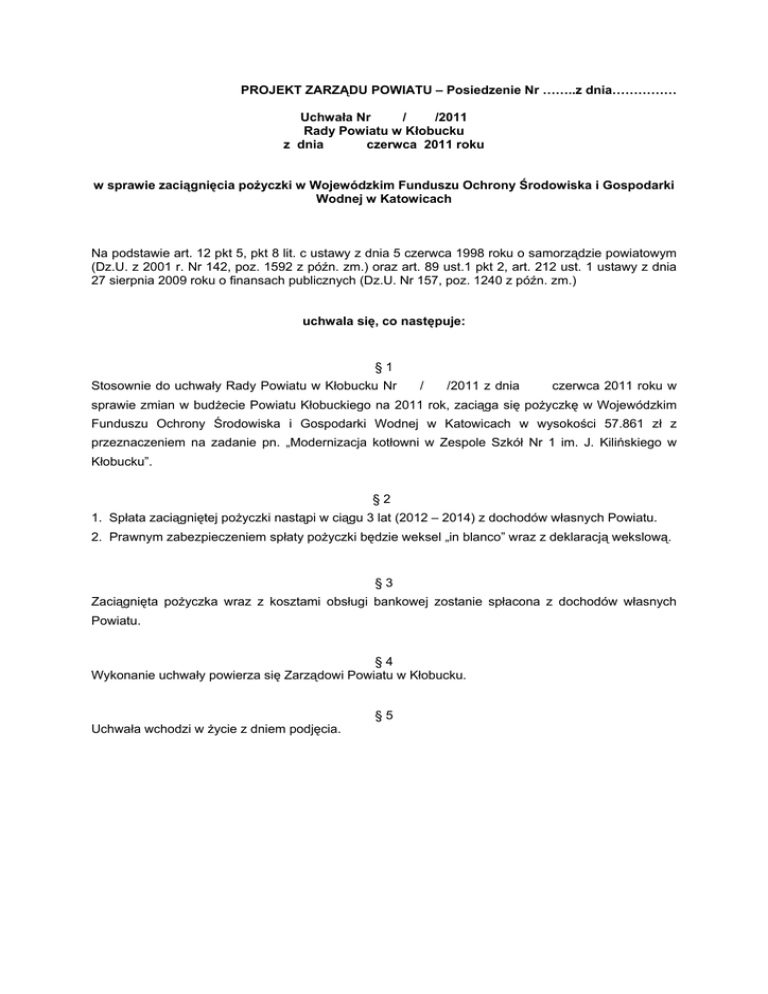PROJEKT ZARZĄDU POWIATU – Posiedzenie Nr ……..z dnia…………… Uchwała Nr / /2011 Rady Powiatu w Kłobucku z dnia czerwca 2011 roku w sprawie zaciągnięcia pożyczki w Wojewódzkim Funduszu Ochrony Środowiska i Gospodarki Wodnej w Katowicach Na podstawie art. 12 pkt 5, pkt 8 lit. c ustawy z dnia 5 czerwca 1998 roku o samorządzie powiatowym (Dz.U. z 2001 r. Nr 142, poz. 1592 z późn. zm.) oraz art. 89 ust.1 pkt 2, art. 212 ust. 1 ustawy z dnia 27 sierpnia 2009 roku o finansach publicznych (Dz.U. Nr 157, poz. 1240 z późn. zm.) uchwala się, co następuje: §1 Stosownie do uchwały Rady Powiatu w Kłobucku Nr / /2011 z dnia czerwca 2011 roku w sprawie zmian w budżecie Powiatu Kłobuckiego na 2011 rok, zaciąga się pożyczkę w Wojewódzkim Funduszu Ochrony Środowiska i Gospodarki Wodnej w Katowicach w wysokości 57.861 zł z przeznaczeniem na zadanie pn. „Modernizacja kotłowni w Zespole Szkół Nr 1 im. J. Kilińskiego w Kłobucku”. §2 1. Spłata zaciągniętej pożyczki nastąpi w ciągu 3 lat (2012 – 2014) z dochodów własnych Powiatu. 2. Prawnym zabezpieczeniem spłaty pożyczki będzie weksel „in blanco” wraz z deklaracją wekslową. §3 Zaciągnięta pożyczka wraz z kosztami obsługi bankowej zostanie spłacona z dochodów własnych Powiatu. §4 Wykonanie uchwały powierza się Zarządowi Powiatu w Kłobucku. §5 Uchwała wchodzi w życie z dniem podjęcia. UZASADNIENIE DO PROJEKTU UCHWAŁY W SPRAWIE ZACIĄGNIĘCIA POŻYCZKI W WOJEWÓDZKIM FUNDUSZU OCHRONY ŚRODOWISKA I GOSPODARKI WODNEJ W KATOWICACH W uchwale proponuje się zaciągnąć pożyczkę w Wojewódzkim Funduszu Ochrony Środowiska i Gospodarki Wodnej w Katowicach w kwocie 57.861 zł z przeznaczeniem na zadanie pn. „Modernizacja kotłowni w Zespole Szkół Nr 1 w Kłobucku” Spłata zaciągniętej pożyczki nastąpi w ciągu 3 lat (2012 – 2014). Prawnym zabezpieczeniem spłaty pożyczki będzie weksel „in blanco” wraz z deklaracją wekslową. Zaciągnięta pożyczka wraz z kosztami obsługi bankowej zostanie spłacona z dochodów własnych Powiatu.