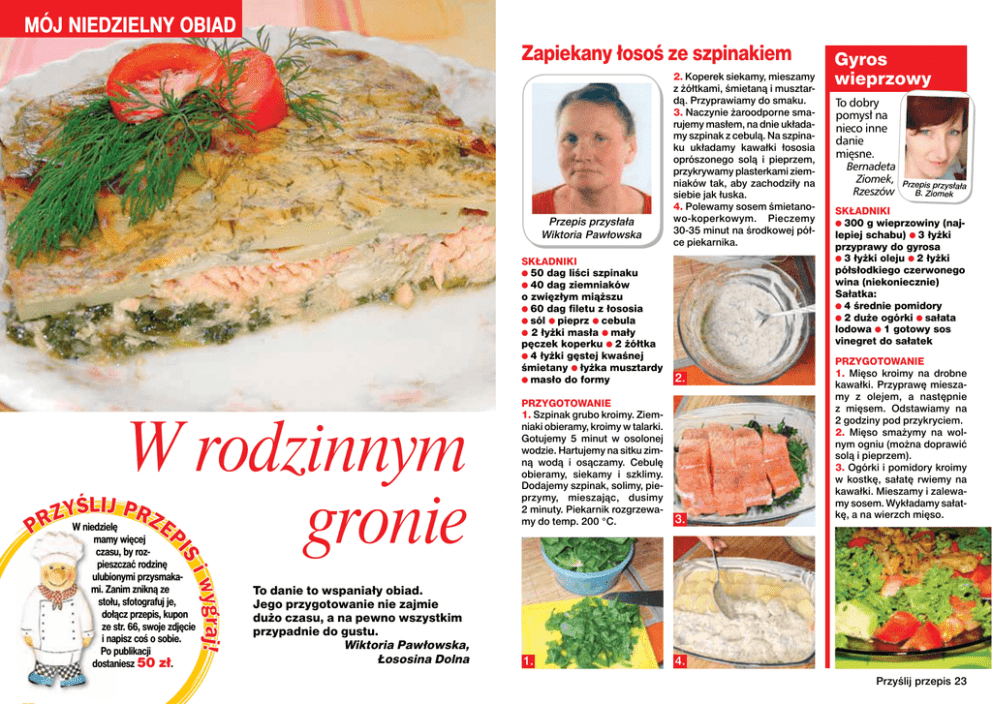 MÓJ NIEDZIELNY OBIAD Zapiekany łosoś ze szpinakiem Przepis przysłała Wiktoria Pawłowska W rodzinnym gronie W niedzielę mamy więcej czasu, by rozpieszczać rodzinę ulubionymi przysmakami. Zanim znikną ze stołu, sfotografuj je, dołącz przepis, kupon ze str. 66, swoje zdjęcie i napisz coś o sobie. Po publikacji dostaniesz 50 zł. To danie to wspaniały obiad. Jego przygotowanie nie zajmie dużo czasu, a na pewno wszystkim przypadnie do gustu. Wiktoria Pawłowska, Łososina Dolna 2. Koperek siekamy, mieszamy z żółtkami, śmietaną i musztardą. Przyprawiamy do smaku. 3. Naczynie żaroodporne smarujemy masłem, na dnie układamy szpinak z cebulą. Na szpinaku układamy kawałki łososia oprószonego solą i pieprzem, przykrywamy plasterkami ziemniaków tak, aby zachodziły na siebie jak łuska. 4. Polewamy sosem śmietanowo-koperkowym. Pieczemy 30-35 minut na środkowej półce piekarnika. SKŁADNIKI ● 50 dag liści szpinaku ● 40 dag ziemniaków o zwięzłym miąższu ● 60 dag filetu z łososia ● sól ● pieprz ● cebula ● 2 łyżki masła ● mały pęczek koperku ● 2 żółtka ● 4 łyżki gęstej kwaśnej śmietany ● łyżka musztardy ● masło do formy 2. PRZYGOTOWANIE 1. Szpinak grubo kroimy. Ziemniaki obieramy, kroimy w talarki. Gotujemy 5 minut w osolonej wodzie. Hartujemy na sitku zimną wodą i osączamy. Cebulę obieramy, siekamy i szklimy. Dodajemy szpinak, solimy, pieprzymy, mieszając, dusimy 2 minuty. Piekarnik rozgrzewamy do temp. 200 °C. 3. 1. 4. Gyros wieprzowy To dobry pomysł na nieco inne danie mięsne. Bernadeta Ziomek, Rzeszów Przepis przysłała B. Ziomek SKŁADNIKI ● 300 g wieprzowiny (najlepiej schabu) ● 3 łyżki przyprawy do gyrosa ● 3 łyżki oleju ● 2 łyżki półsłodkiego czerwonego wina (niekoniecznie) Sałatka: ● 4 średnie pomidory ● 2 duże ogórki ● sałata lodowa ● 1 gotowy sos vinegret do sałatek PRZYGOTOWANIE 1. Mięso kroimy na drobne kawałki. Przyprawę mieszamy z olejem, a następnie z mięsem. Odstawiamy na 2 godziny pod przykryciem. 2. Mięso smażymy na wolnym ogniu (można doprawić solą i pieprzem). 3. Ogórki i pomidory kroimy w kostkę, sałatę rwiemy na kawałki. Mieszamy i zalewamy sosem. Wykładamy sałatkę, a na wierzch mięso. Przyślij przepis 23