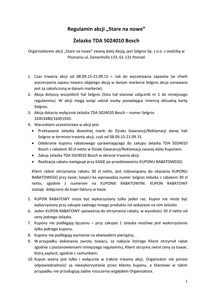 Regulamin akcji „Stare na nowe” Żelazko TDA 5024010 Bosch Organizatorem akcji „Stare na nowe” zwaną dalej Akcją, jest Selgros Sp. z o.o. z siedzibą w Poznaniu ul. Zamenhofa 133, 61-131 Poznań 1. Czas trwania akcji od 08.09.15-21.09.15 r. lub do wyczerpania zapasów (w chwili wyczerpania zapasu towaru objętego akcją w danym markecie Selgros akcja uznawana jest za zakończoną w danym markecie). 2. Akcja dotyczy wszystkich hal Selgros (lista hal stanowi załącznik nr 1 do niniejszego regulaminu). W akcji mogą wziąć udział osoby posiadające imienną aktualną kartę Selgros. 3. Akcja dotyczy wyłącznie żelazka TDA 5024010 Bosch – numer Selgros 32053480/16491920. 4. Warunkiem uczestnictwa w akcji jest: Przekazanie żelazka dowolnej marki do Działu Gwarancji/Reklamacji danej hali Selgros w terminie trwania akcji, czyli od 08.09.15-21.09.15. Odebranie kuponu rabatowego uprawniającego do zakupu żelazka TDA 5024010 Bosch z rabatem 30 zł netto w Dziale Gwarancji/Reklamacji zwanej dalej Kuponem. Zakup żelazka TDA 5024010 Bosch w okresie trwania akcji. Realizacja rabatu następuje przy KASIE po przedstawieniu KUPONU RABATOWEGO. Klient celem otrzymania rabatu 30 zł netto, jest zobowiązany do okazania KUPONU RABATOWEGO przy kasie; kasjer/-ka wprowadza numer Selgros żelazka z rabatem 30 zł netto, zgodnie z numerem na KUPONIE RABATOWYM. KUPON RABATOWY zostaje dołączony do kopii faktury w kasie. 5. KUPON RABATOWY może być wykorzystany tylko jeden raz. Kupon nie może być wykorzystany przy zakupie żadnego innego produktu niż wskazane na nim żelazko. 6. Jeden KUPON RABATOWY upoważnia do otrzymania rabatu, w wysokości 30 zł netto od ceny jednego żelazka. 7. Kupony nie podlegają łączeniu – przy zakupie 1 żelazka możliwe jest wykorzystanie tylko jednego kuponu. 8. Kupony nie podlegają wymianie na ekwiwalent pieniężny. 9. W przypadku dokonania zwrotu towaru, za nabycie którego Klient otrzymał rabat zgodnie z postanowieniami niniejszego regulaminu, Klient otrzyma zwrot ceny za towar, którą zapłacił, zgodnie z rachunkiem. 10. Kupon ważny jest tylko i wyłącznie w trakcie trwania akcji. Organizator nie ponosi odpowiedzialności za niewykorzystanie przez klienta kuponu, a klientowi w takim przypadku nie przysługują żadne roszczenia względem Organizatora. 1 11. Udział w akcji jest równoznaczny z akceptacją postanowień niniejszego regulaminu. 12. Organizator zastrzega sobie prawo do zmiany postanowień regulaminu akcji „Stare na nowe” oraz prawo do ograniczenia czasu jej trwania. 13. Wszelkie spory mogące wyniknąć w związku z organizacją oraz przeprowadzeniem akcji będą rozstrzygane przez Komisję, w składzie: Dyrektor Hali, Kierownik Działu DOK ,Kierownik Hali-odpowiednego marketu Selgros Cash & Carry, powołaną przez Organizatora. Reklamacje w związku z organizacją oraz przeprowadzeniem akcji mogą być zgłaszane najpóźniej w terminie do 14 dni od dnia zakończenia akcji. Zgłoszenie reklamacyjne należy wysłać listem poleconym za potwierdzeniem odbioru na adres Organizatora z dopiskiem: Reklamacja – Akcja „Stare na nowe”. Forma pisemna reklamacji zastrzeżona jest pod rygorem nieważności. Reklamacje będą rozpatrywane w terminie do 14 dni od daty otrzymania. Decyzje Komisji w przedmiocie reklamacji podejmowane będą w formie pisemnej. Są one ostateczne i wiążące. Osoba składająca reklamację zostanie powiadomiona o decyzji listem poleconym, wysłanym pod adresem podanym w reklamacji w terminie do 5 dni od daty rozpatrzenia reklamacji. Rozstrzygnięcie Komisji jest ostateczne. 14. Regulamin akcji jest dostępny w Dziale Obsługi Klienta. 15. Regulamin akcji jest jedynym dokumentem określającym zasady przeprowadzenia akcji. 16. Wszelkie spory wynikłe z tytułu wykonania zobowiązań związanych z akcją będą rozstrzygane przez Sąd właściwy według siedziby Organizatora. 17. W kwestiach nieuregulowanych niniejszym regulaminem stosuje się przepisy Kodeksu Cywilnego. Załącznik: 1. Wykaz hal Selgros objętych akcją „Stare na nowe”. 2 Załącznik 1 do regulaminu akcji „Stare na nowe” – wykaz hal objętych promocją Market w Poznaniu. Nr 110 ul. Zamenhofa 133 61-131 Poznań Market w Warszawie. Nr 111 ul. Przylesie 3 03-153 Warszawa Market we Wrocławiu. Nr 112 ul. Wrocławska 4c 55-095 Mirków k. Wrocławia Market w Szczecinie. Nr 113 ul. Walecznych 64 70-774 Szczecin Market w Łodzi. Nr 114 ul. Rokicińska 190/214 92-412 Łódź Market w Warszawie II. Nr 116 ul. Połczyńska 103 01-303 Warszawa Market w Katowicach. Nr 117 ul. Lwowska 32 40-389 Katowice Market w Gliwicach. Nr 118 ul. Toszecka 11 44-102 Gliwice Market w Radomiu. Nr 120 ul. Czarnieckiego 112 /116 26-617 Radom Market w Krakowie. Nr 122 ul. Nowohucka 52 31 580 Kraków Market w Gdańsku. Nr 123 ul. Wodnika 79 80-299 GDAŃSK Market w Bytomiu nr 124 ul. Chorzowska 88 41-910 Bytom 3 Market w Białymstoku nr 125 ul. Produkcyjna 99 15-680 Białystok Market w Łodzi nr 126 ul. 3 maja 4 93-408 Łódź Market w Wrocław nr 127 ul. Krakowska 71 -105 50-426 Wrocław Market w Lublinie nr 128 ul. Jana Pawła II 59 20-535 Lublin 4