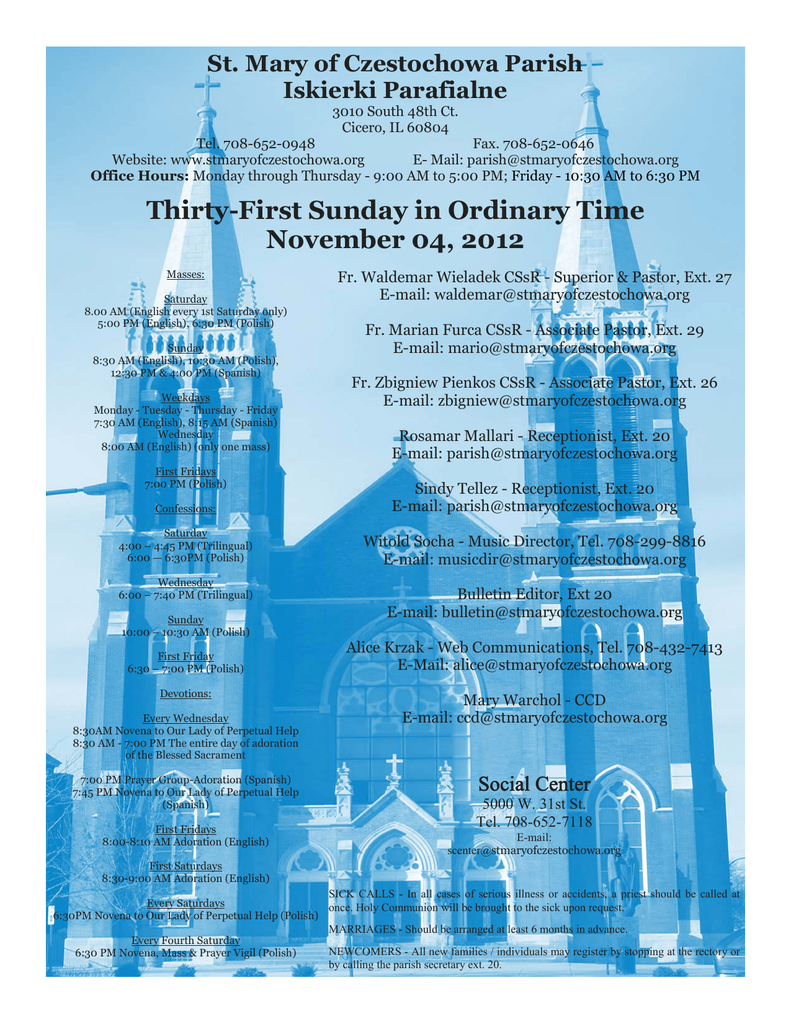 St. Mary of Czestochowa Parish Iskierki Parafialne 3010 South 48th Ct. Cicero, IL 60804 Tel. 708-652-0948 Fax. 708-652-0646 Website: www.stmaryofczestochowa.org E- Mail: [email protected] Office Hours: Monday through Thursday - 9:00 AM to 5:00 PM; Friday - 10:30 AM to 6:30 PM Thirty-First Sunday in Ordinary Time November 04, 2012 Masses: Saturday 8.00 AM (English every 1st Saturday only) 5:00 PM (English), 6:30 PM (Polish) Sunday 8:30 AM (English), 10:30 AM (Polish), 12:30 PM & 4:00 PM (Spanish) Weekdays Monday - Tuesday - Thursday - Friday 7:30 AM (English), 8:15 AM (Spanish) Wednesday 8:00 AM (English) (only one mass) First Fridays 7:00 PM (Polish) Fr. Waldemar Wieladek CSsR - Superior & Pastor, Ext. 27 E-mail: [email protected] Fr. Marian Furca CSsR - Associate Pastor, Ext. 29 E-mail: [email protected] Fr. Zbigniew Pienkos CSsR - Associate Pastor, Ext. 26 E-mail: [email protected] Rosamar Mallari - Receptionist, Ext. 20 E-mail: [email protected] Confessions: Sindy Tellez - Receptionist, Ext. 20 E-mail: [email protected] Saturday 4:00 – 4:45 PM (Trilingual) 6:00 — 6:30PM (Polish) Witold Socha - Music Director, Tel. 708-299-8816 E-mail: [email protected] Wednesday 6:00 – 7:40 PM (Trilingual) Sunday 10:00 – 10:30 AM (Polish) First Friday 6:30 – 7:00 PM (Polish) Devotions: Every Wednesday 8:30AM Novena to Our Lady of Perpetual Help 8:30 AM - 7:00 PM The entire day of adoration of the Blessed Sacrament 7:00 PM Prayer Group-Adoration (Spanish) 7:45 PM Novena to Our Lady of Perpetual Help (Spanish) First Fridays 8:00-8:10 AM Adoration (English) Bulletin Editor, Ext 20 E-mail: [email protected] Alice Krzak - Web Communications, Tel. 708-432-7413 E-Mail: [email protected] Mary Warchol - CCD E-mail: [email protected] Social Center 5000 W. 31st St. Tel. 708-652-7118 E-mail: [email protected] First Saturdays 8:30-9:00 AM Adoration (English) SICK CALLS - In all cases of serious illness or accidents, a priest should be called at Every Saturdays once. Holy Communion will be brought to the sick upon request. 6:30PM Novena to Our Lady of Perpetual Help (Polish) MARRIAGES - Should be arranged at least 6 months in advance. Every Fourth Saturday NEWCOMERS - All new families / individuals may register by stopping at the rectory or 6:30 PM Novena, Mass & Prayer Vigil (Polish) by calling the parish secretary ext. 20. Sunday Iskierki Parafialne November 10, Saturday, Saint Leo the Great, Pope and Doctor of the Church 5:00 Parishioners 6:30 W intencjach próśb i podziękowań do M. B. Nieustającej Pomocy November 04, Thirty-First Sunday in Ordinary Time 8:30 †Millie Kabat (Joseph Struhar) †Sophie E. Schulz (Marcy Pugno) Living and Deceased Members Rosary Confraternity 10:00 Wypominki 10:30 O Boże bł. w pracy i potrzebne łaski dla pracowników firmy Pro-Temp Za żyjących i zamarłych członków z Bractwa Różańcowego O Boże bł. i zdrowie dla Janiny Kulak z okazji urodzin (wnuczki Viktoria i Nikol) †Ewa Rapacz-Zarzycka †Sławomir Sajda †Halina, Jerzy Jarzębowicz †Anna De Perez †For the Deceased Members of the Pilipiak Leskiewicz, Madej Families (Adela Pilipiak) 12:30 Por las bendiciones para Miguel y Juana Salas en su 60 años de casados Por la salud y bendición de Jailene Rodriguez en su XV cumpleaños †Maria Esperanza Reyna (Familia Reyna) 4:00 Macario Vega (Familia Venegas) Dando gracias a la Virgen de Guadalupe por la salud de Juan Manuel Jiménez November 05, Monday, Weekday in Ordinary Time 7:30 †Anna Jachura (brat z rodziną) 8:15 †Holy Souls in the Book of Remembrance November 06, Tuesday, Weekday in Ordinary Time 7:30 †Anna Jachura (brat z rodziną) 8:00 Dantis November 07, Wednesday, Weekday in Ordinary Time 8:00 †Anna Jachura (brat z rodziną) 8:30 Eucharistic Adoration until 7PM 7PM El Circulo de Oración 7:45 Novena a Nuestra Señora del Perpetuo Socorro November 08, Thursday, Weekday in Ordinary Time 7:30 O Boże bł. w pracy i potrzebne łaski dla pracowników firmy Pro-Temp 8:15 †Anna Jachura (brat z rodziną) November 09, Friday , The Dedication of the Lateran Basilica 7:30 Dantis 8:15 †Anna Jachura (brat z rodziną) November 11, Thirty-Second Sunday in Ordinary Time 8:30 †John E. Kociolko (Son) 10:00 Wypominki 10:30 O Boże bł. w pracy i potrzebne łaski dla pracowników firmy Pro-Temp †Krzysztof Tylka (rodzina) †Ewa Rapacz-Zarzycka †Sławomir Sajda 12:30 †Maria Esperanza Reyna (Familia Reyna) †Bebe Daniel Fernandez Salas (Padres) †Esperanza Duarte (sus sobrinas Ontiveros) 4:00 Macario Vega Familia Vega) Lector Schedule Saturday, November 10 5:00 Marie Jarding, Raquel Beatrez Sunday, November 11 8:30 Ed Hennessy, Eric Batrez 10:30 Franek Banachowski, Kasia Kowalska 12:30 Marisol Ortiz, Juan Rodriguez Juana Salas 4:00 Victor Ibarra, Martha Brito Humberto Téllez Eucharistic Minister Saturday, November 10 5:00 Joanne Napoletano, Larry Napoletano Sunday, November 11 8:30 John Kulaga, Gregoria Czarnecki, Michelle Ciocin-Carlson 10:30 Polish Eucharistic Ministers 12:30 Francisco Uribe, Linda Ramirez Alejandro Báez, 4:00 Lucy Gamiño, Tiburcio Rodriguez Maria Rodriguez WEDDING BANNS There is a promise of marriage between II. Izabela Skobel & Rafal Golonka I. Aneta Listwan & Tadeusz Stoch St. Mary of Czestochowa Sunday Collection October 28, 2012 The next Religious Education (CCD) class will be held on Saturday morning, November 10, 2012. Classes meet from 8:00 AM to 10:00 AM. RESERVE THE DATE : WIGILIA DINNER The annual Wiligia dinner will be held on Sunday, December 2 at the Social center. More details will be publish on future bulletins. November 4, 2012 The United States Bishop’s Conference (USCCB) depends on informed Catholic voters to help collectively sway legislation to better respond to the genuine needs of the poor and the society’s most vulnerable. Am I ready, willing and prepared to vote my conscious (which is continually shaped and formed in the Catholic Church) in this year’s election? Many thanks to those of you wh