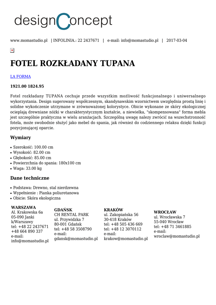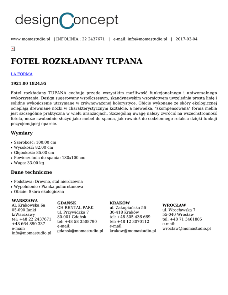 www.momastudio.pl | INFOLINIA.: 22 2437671 | e-mail: [email protected] | 2017-03-04 FOTEL ROZKŁADANY TUPANA LA FORMA 1921.00 1824.95 Fotel rozkładany TUPANA cechuje przede wszystkim możliwość funkcjonalnego i uniwersalnego wykorzystania. Design sugerowany współczesnym, skandynawskim wzornictwem uwzględnia prostą linię i solidne wykończenie utrzymane w zrównoważonej kolorystyce. Obicie wykonane ze skóry ekologicznej ocieplają drewniane nóżki w charakterystycznym kształcie, a niewielka, "skompensowana" forma mebla jest szczególnie praktyczna w wielu aranżacjach. Szczególną uwagę nalezy zwrócić na wszechstronność fotela, może swobodnie służyć jako mebel do spania, jak również do codziennego relaksu dzięki funkcji pozycjonującej oparcie. Wymiary ● ● ● ● ● Szerokość: 100.00 cm Wysokość: 82.00 cm Głębokość: 85.00 cm Powierzchnia do spania: 180x100 cm Waga: 33.00 kg Dane techniczne ● ● ● Podstawa: Drewno, stal nierdzewna Wypełnienie : Pianka poliuretanowa Obicie: Skóra ekologiczna WARSZAWA Al. Krakowska 6a 05-090 Janki k/Warszawy tel: +48 22 2437671 +48 664 890 337 e-mail: [email protected] GDAŃSK CH RENTAL PARK ul. Przywidzka 7 80-001 Gdańsk tel: +48 58 3508790 e-mail: [email protected] KRAKÓW ul. Zakopiańska 56 30-418 Kraków tel: +48 505 436 669 tel: +48 12 3070112 e-mail: [email protected] WROCŁAW ul. Wrocławska 7 55-040 Wrocław tel: +48 71 3461885 e-mail: [email protected]
