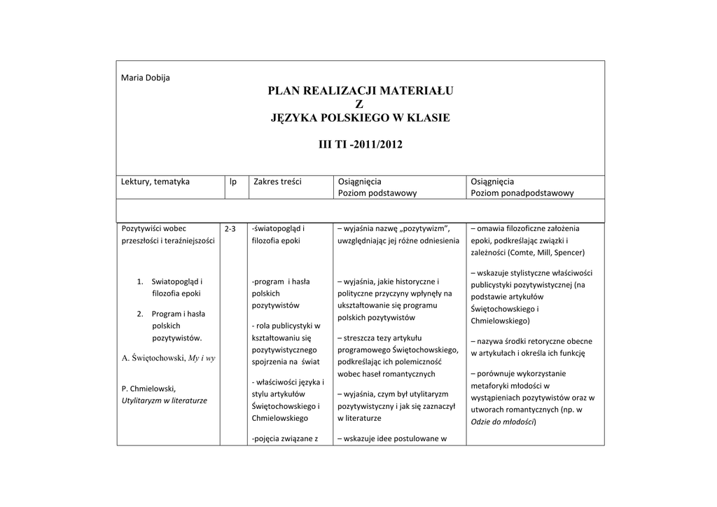 Maria Dobija PLAN REALIZACJI MATERIAŁU Z JĘZYKA POLSKIEGO W KLASIE III TI -2011/2012 Lektury, tematyka Pozytywiści wobec przeszłości i teraźniejszości 1. Swiatopogląd i filozofia epoki 2. Program i hasła polskich pozytywistów. A. Świętochowski, My i wy P. Chmielowski, Utylitaryzm w literaturze lp 2-3 Zakres treści Osiągnięcia Poziom podstawowy Osiągnięcia Poziom ponadpodstawowy -światopogląd i filozofia epoki – wyjaśnia nazwę „pozytywizm”, uwzględniając jej różne odniesienia – omawia filozoficzne założenia epoki, podkreślając związki i zależności (Comte, Mill, Spencer) -program i hasła polskich pozytywistów – wyjaśnia, jakie historyczne i polityczne przyczyny wpłynęły na ukształtowanie się programu polskich pozytywistów - rola publicystyki w kształtowaniu się pozytywistycznego spojrzenia na świat – streszcza tezy artykułu programowego Świętochowskiego, podkreślając ich polemiczność wobec haseł romantycznych - właściwości języka i stylu artykułów Świętochowskiego i Chmielowskiego – wyjaśnia, czym był utylitaryzm pozytywistyczny i jak się zaznaczył w literaturze -pojęcia związane z – wskazuje idee postulowane w – wskazuje stylistyczne właściwości publicystyki pozytywistycznej (na podstawie artykułów Świętochowskiego i Chmielowskiego) – nazywa środki retoryczne obecne w artykułach i określa ich funkcję – porównuje wykorzystanie metaforyki młodości w wystąpieniach pozytywistów oraz w utworach romantycznych (np. w Odzie do młodości) . Borejsza, Noc postyczniowa (fragm epoką ( np. scjentyzm, utylitaryzm , praca organiczna itd.) publicystyce pozytywistycznej – wymienia główne punkty programu polskich pozytywistów – wyjaśnia, na czym polegał język ezopowy publicystyki pozytywistycznej – wyjaśnia, w jaki sposób zostały – wyjaśnia, czym były praca organiczna i praca u podstaw – *czyta ze zrozumieniem fragment książki Borejszy, wykorzystuje zawarte w nim wiadomości w swoich komentarzach B. Prus jako dziennikarz – „Kroniki tygodniowe” -Cechy felietonu. Prus jako mądry nauczyciel, wychowawca, moralista, humorysta. 4 przełożone na polskie realia hasła ewolucjonizmu, organicyzmu, scjentyzmu, utylitaryzmu (uwzględnia kontekst historyczny i kulturowy) -poszerzenie na wybranych przykładach, np. Wieża paryska” Znajomości publicystyki Prusa Labirynty realizmu T: -Nowela jako ulubiony gatunek pozytywistów. Prus, Kamizelka (utwor czytany w całości) a także nowele poznane w gimnazjum (Prusa i innych pozytywistów) 5 -nowela jako ulubiony gatunek pozytywistów ( cechy gatunku, kompozycja i kreacja narratora ) -problematyka i przesłanie analizowanych nowel pozytywistycznych – na podstawie przeczytanych utworów omawia cechy noweli jako jednego z głównych gatunków pozytywistycznych – odwołując się do założeń filozoficznych, artystycznych i społecznych pozytywizmu, wyjaśnia, dlaczego był on „epoką prozy” – określa zasadę kompozycyjną i nastrój nowel – wykorzystuje informacje na temat noweli (np. komentarze Świętochowskiego i Orzeszkowej) do pogłębionego odczytania dzieła – charakteryzuje narratora nowel Prusa (określa funkcje narratora dziecięcego) – określa przesłanie każdego utworu – rekonstruuje obraz życia – interpretuje utwór jako nowelę z sokołem – w czytanych utworach odróżnia cechy typowe dla pozytywizmu oraz Styl naturalistyczny na podstawie powieści 6 „Germinal” E. Zoli /fragment z podręcznika/ 7-14 społecznego w czasie powstania styczniowego specyficzne, oryginalne – będące wykładnikami mistrzostwa Prusa- -omawia cechy naturalizmu - analizuje styl narratora, bohaterów, -Znajomość treści fragmentu-obrazy z życia górników francuskich - zna pojęcia: socjologia, realizm, -opisy aturalistyczne, styl i język Lalka B. Prusa 1.Lalka- o czym to książka / o miłości, społeczeństwie, rodzącym się kapitalizmie, „rozkładzie” społecznym, mieście 2.Wokulski jako model romantyka i pozytywisty lu 3.Studium samotności człowieka w „ Lalka” jako przykład powieści dojrzałego realizmu -artyzm powieści ( kreacja narratorów, język i styl kompozycja oraz inne walory powieści świadczące o jej oryginalności np. indywidualizacja – wyjaśnia, dlaczego powieść (obok noweli i krótkich form prozatorskich) stała się głównym gatunkiem pozytywizmu – na podstawie Lalki omawia cechy powieści dojrzałego realizmu o o o charakteryzuje świat przedstawiony utworu omawia budowę akcji i fabuły przedstawia szeroki i bogaty obraz życia społecznego (panoramiczność) zwraca uwagę na bogactwo szczegółów – analizuje język i styl każdego z narratorów (np. wskazuje monolog wewnętrzny, mowę pozornie zależną; określa funkcje tych środków) – określa artystyczną funkcję zastosowanych w powieści retrospekcji – w pogłębiony sposób interpretuje tytuł powieści, odnosząc go m.in. do społeczeństwie . a)opinie ludzi zyczliwych i kochających b) Wokulski o sobie c) opinie niechętne bądź wynikające z zawiści 4.Realistyczny obraz Warszawy. 5-6 Obraz społeczeństwa zawarty w Lalce .( obraz Polaków, Niemców, Żydów 7.”Lalka powieść niezwykła w swojej strukturze. języka bohaterów, sposób narracji, bogactwo realiów obyczajowych, humor, tragizm ,patos, stylizacja środowiskowa itd.) -panorama społeczeństwa IIpoł. XIX wieku i jego ocena - „ Lalka” powieścią obyczajową i psychologiczną - portret głównego bohatera -narracja, styl i język -topografia Warszawy - interpretacja tytułu wskazuje rolę każdego z narratorów o charakteryzuje bohaterów, ich motywacje, osobowości, język itp. – analizuje sposoby indywidualizacji postaci – wskazuje cechy typowe w zindywidualizowanych postaciach o – przedstawia krytyczny i pesymistyczny obraz polskiego społeczeństwa zawarty w Lalce (wielkie rozczarowania epoki i kryzys programu pozytywistycz