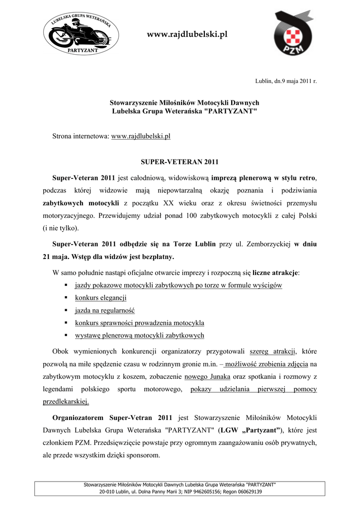 www.rajdlubelski.pl Lublin, dn.9 maja 2011 r. Stowarzyszenie Miłośników Motocykli Dawnych Lubelska Grupa Weterańska "PARTYZANT" Strona internetowa: www.rajdlubelski.pl SUPER-VETERAN 2011 Super-Veteran 2011 jest całodniową, widowiskową imprezą plenerową w stylu retro, podczas której widzowie mają niepowtarzalną okazję poznania i podziwiania zabytkowych motocykli z początku XX wieku oraz z okresu świetności przemysłu motoryzacyjnego. Przewidujemy udział ponad 100 zabytkowych motocykli z całej Polski (i nie tylko). Super-Veteran 2011 odbędzie się na Torze Lublin przy ul. Zemborzyckiej w dniu 21 maja. Wstęp dla widzów jest bezpłatny. W samo południe nastąpi oficjalne otwarcie imprezy i rozpoczną się liczne atrakcje: jazdy pokazowe motocykli zabytkowych po torze w formule wyścigów konkurs elegancji jazda na regularność konkurs sprawności prowadzenia motocykla wystawę plenerową motocykli zabytkowych Obok wymienionych konkurencji organizatorzy przygotowali szereg atrakcji, które pozwolą na miłe spędzenie czasu w rodzinnym gronie m.in. – możliwość zrobienia zdjęcia na zabytkowym motocyklu z koszem, zobaczenie nowego Junaka oraz spotkania i rozmowy z legendami polskiego sportu motorowego, pokazy udzielania pierwszej pomocy przedlekarskiej. Organiozatorem Super-Vetran 2011 jest Stowarzyszenie Miłośników Motocykli Dawnych Lubelska Grupa Weterańska "PARTYZANT" (LGW „Partyzant”), które jest członkiem PZM. Przedsięwzięcie powstaje przy ogromnym zaangażowaniu osób prywatnych, ale przede wszystkim dzięki sponsorom. Stowarzyszenie Miłośników Motocykli Dawnych Lubelska Grupa Weterańska "PARTYZANT" 20-010 Lublin, ul. Dolna Panny Marii 3; NIP 9462605156; Regon 060629139 www.rajdlubelski.pl Impreza ma charakter cykliczny i jest to już jej siódma edycja. Ubiegłoroczna edycja imprezy, w maju 2010 roku, przyciągnęła kilkutysięczną widownię, która mogła podziwiać ponad 100 zabytkowych motocykli. Zgromadzone pojazdy obejmowały 60 lat historii motocyklizmu, od 1925 roku reprezentowanego przez Triumpha model P, po motocykle WSK z ostatniego 1985 roku produkcji. Jesteśmy przekonani, że i w tym roku impreza spotka się z ogromnym zainteresowaniem publiczności. Przewidujemy udział ok. 1,5-2,5 tyś widzów. Wstęp dla widzów na imprezę jest bezpłatny. W trakcie całej imprezy, będziemy wspierać akcję zbierania pieniędzy dla Jakuba Bielaka, na operację przeszczepu płuc lubelskiego studenta chorego na mukowiscydoze. Zapraszamy Państwa do wsparcia medialnego Super-Veteran 2011. Szczegółowe informacje nt. imprezy oraz podsumowania dotychczasowych działań, dostępne są na stronie internetowej: www.rajdlubelski.pl. Szczegółowy plan imprezy znajduje się poniżej. Z góry dziękujemy i zapraszamy do kontaktu w celu ustalenia szczegółów: Piotr Orzeł - tel. kom.: 507 940 393 e-mail: [email protected] Piort Orzeł Prezes Stowarzyszenia MMD LGW Partyzant Stowarzyszenie Miłośników Motocykli Dawnych Lubelska Grupa Weterańska "PARTYZANT" 20-010 Lublin, ul. Dolna Panny Marii 3; NIP 9462605156; Regon 060629139 www.rajdlubelski.pl Szczegółowy program oficjalnej części imprezy Super-Veteran 2011 (21 maja 2011r.): 9.00-12.00 – treningi zapoznawcze na torze 11.00-17.00 – Plenerowa Wystawa Motocykli Zabytkowych 12.10 Oficjalne Otwarcie Imprezy Super-Veteran - Prezentacja gości, sponsorów 12.30 I bieg - Jazdy pokazowe motocykli zabytkowych klasy do 100 ccm 12.45 Konkurs Elegancji. Prezentacja motocyklistów w strojach z epoki pojazdu 13.00 II bieg - Jazdy pokazowe motocykli klasy do 100 - 200 ccm pre 1955 13.15 Konkurencje zlotowe 13.30 III bieg - Jazdy pokazowe motocykli klasy 100 -150 ccm post 1955 13.45 Konkurencje zlotowe 14.00 IV bieg - Jazdy pokazowe motocykli klasy 200 - 350 ccm pre 1955 14.15 Jazda na regularność 14.30 V bieg - Jazdy pokazowe motocykli klasy 150 - 250 ccm post 1955 14.45 Dekoracje zwycięzców biegów I-IV 15.00 VI bieg - Jazdy pokazowe motocykli klasy powyżej 350 ccm pre 1955 15.15 Pokaz udzielania Pierwszej Pomocy Przedlekarskiej 15.30 VII bieg - Jazdy pokazowe motocykli klasy powyżej 350 ccm post 1955 15.45 Konkurencje zlotowe 16.00 VIII bieg - Jazdy pokazowe klasy sidecar (motocykle z koszem) 16.15 Dekoracje zawodników z biegów V-VIII 16. 30 Jazdy pokazowe motocykli zabytkowych vs. motocykle współczesne 17.00 Zakończenie imprezy na torze Wstęp dla Widzów Wolny. Stowarzyszenie Miłośników Motocykli Dawnych Lubelska Grupa Weterańska "PARTYZANT" 20-010 Lublin, ul. Dolna Panny Marii 3; NIP 9462605156; Regon 060629139