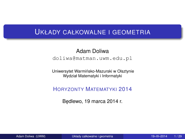 U KŁADY CAŁKOWALNE I GEOMETRIA Adam Doliwa [email protected] Uniwersytet Warmińsko-Mazurski w Olsztynie Wydział Matematyki i Informatyki H ORYZONTY M ATEMATYKI 2014 Bedlewo, ˛ 19 marca 2014 r. Adam Doliwa (UWM) Układy całkowalne i geometria 19–III–2014 1 / 29 Plan 1 Rozwiazalność, ˛ symetrie, prawa zachowania Rozwiazalność ˛ równań algebraicznych i różniczkowych Równanie Kortewega—de Vriesa (KdV) Przykłady z geometrii różniczkowej 2 Przykład kombinatoryczny – rosnace ˛ podciagi ˛ w permutacjach i równania Painlevé 3 Dyskretne układy całkowalne i geometria incydencyjna Adam Doliwa (UWM) Układy całkowalne i geometria 19–III–2014 2 / 29 Outline 1 Rozwiazalność, ˛ symetrie, prawa zachowania Rozwiazalność ˛ równań algebraicznych i różniczkowych Równanie Kortewega—de Vriesa (KdV) Przykłady z geometrii różniczkowej 2 Przykład kombinatoryczny – rosnace ˛ podciagi ˛ w permutacjach i równania Painlevé 3 Dyskretne układy całkowalne i geometria incydencyjna Adam Doliwa (UWM) Układy całkowalne i geometria 19–III–2014 3 / 29 Rozwiazalność ˛ równań algebraicznych Problem rozwiazalności ˛ przez pierwiastniki Kiedy miejsca zerowe wielomianu w(x) ∈ Q[x] moga˛ być wyznaczone przy pomocy operacji arytmetycznych i wyciagania ˛ pierwiastków. Évariste Galois (1811–1832) Odpowiedź Wtedy i tylko wtedy gdy odpowiednia grupa Galois jest rozwiazalna. ˛ Adam Doliwa (UWM) Układy całkowalne i geometria 19–III–2014 4 / 29 Rozwiazalność ˛ równań różniczkowych Problem rozwiazalności ˛ w kwadraturach Kiedy rozwiazanie ˛ równania różniczkowego zwyczajnego 0 (n) F (x, y , . . . , y ) = 0 może być otrzymane przy pomocy operacji algebraicznych, odwracania funkcji i liczenia całek nieoznaczonych. Marius Sophus Lie (1842–1899) Cz˛eściowa odpowiedź Jeśli posiada n-parametrowa˛ rozwiazaln ˛ a˛ grupe˛ symetrii (+ pewne warunki techniczne). Adam Doliwa (UWM) Układy całkowalne i geometria 19–III–2014 5 / 29 Równania mechaniki klasycznej Przestrzeń fazowa: M2n , ξ α , α = 1, . . . , 2n , {ξ α , ξ β } = Ωα,β (ξ) P ∂f ∂g Struktura Poissona: {f (ξ), g(ξ)} = α,β Ωαβ ∂ξ α ∂ξ β Ωαβ = −Ωβα , tożsamość Jacobiego Ewolucja: H energia (funkcja Hamiltona) X ∂H dξ α = {ξ α , H} = Ωαβ β dt ∂ξ β Przykład (Oscylator harmoniczny) (p, q) ∈ R2 , {p, q} = 1, dq = p, dt Adam Doliwa (UWM) Ω= 0 1 −1 0 dp = −q, dt Układy całkowalne i geometria , H(p, q) = 1 2 p2 + q 2 d 2q = −q dt 2 19–III–2014 6 / 29 Zupełna całkowalność i współrz˛edne działanie–kat ˛ Zupełna całkowalność: H oraz (n − 1) całek ruchu Qi w inwolucji {Qi , H} = 0, {Qi , Qj } = 0 Zmienne działanie–kat: ˛ ξ → (Iα , θα ), k = 1, . . . , n {I α , I β } = 0, {θα , θβ } = 0, {I α , θβ } = δ αβ dI α =0 dt dθα = φα (I) dt Adam Doliwa (UWM) Układy całkowalne i geometria 19–III–2014 7 / 29 Równanie Kortewega—de Vriesa (KdV) ∂v ∂2v , vxx = , ... ∂x ∂x 2 vt = −vxxx + 6vvx Z 1 0 {v (x), v (y )} = δ (x − y ), H[v ] = ( vx2 + v 3 )dx 2 vx = N. J. Zabusky, M. D. Kruskal (1965): zderzanie solitonów Adam Doliwa (UWM) Układy całkowalne i geometria 19–III–2014 8 / 29 Metoda spektralna C.S. Gardner, J. M. Greene, M. D. Kruskal, R. M. Miura (1967) −ψ 00 + v (x)ψ = k 2 ψ ( eikx + r (k )e−ikx , x → −∞ ψ→ , t(k )eikx , x → +∞ kj2 = −κ2j , |t(k )|2 + |r (k )|2 = 1 ( eκj x , x → −∞ ψj → −κ x j cj e , x → +∞ j = 1, . . . , N, v (x) ↔ {r (k ), κj , cj } transformacja spektralna v (x) → v (x, t) ↓ ↓ {r (k ), κj , cj } → {r (k , t), κj , cj (t)} 3 r (k , t) = r (k )e8ik t , Adam Doliwa (UWM) 3 cj (t) = cj e4κj t Układy całkowalne i geometria 19–III–2014 9 / 29 Zupełna całkowalność równania KdV V. E. Zakharov, L. D. Faddeev (1971) Zmienne działanie: 2k ln(1 − |r (k )|2 ), π I(k ) = κj Zmienne kat: ˛ θ(k ) = arg r (k ), θj = ln cj Funkcja (funkcjonał) Hamiltona: Z H[v ] = 8 ∞ N k 3 I(k )dk + 0 Adam Doliwa (UWM) Układy całkowalne i geometria 32 X 3 κj 5 j=1 19–III–2014 10 / 29 Geometria a układy całkowalne geometria grup i algebr Liego jako ujecie ˛ teorii symetrii równań różniczkowych geometria symplektyczna (poissonowska) jako matematyczna baza sformułowania pojecia ˛ całkowalności układów mechaniki klasycznej geometria algebraiczna jako źródło pewnych ważnych technik (teoria funkcji theta na powierzchniach Riemanna) otrzymywania rozwiaza ˛ ń równań całkowalnych geometria różniczkowa jako źródło ciekawych równań nieliniowych, czasami równań całkowalnych geometria nieprzemienna, grupy kwantowe i rozwiazywalne ˛ układy fizyki statystycznej i kwantowej teorii pola Adam Doliwa (UWM) Układy całkowalne i geometria 19–III–2014 11 / 29 Ewolucja krzywej i równanie mKdV s−parametr naturalny T N |κ|= 1 R Jeśli wektor predkości ˛ punktów krzywej dany jest wzorem 1 rt = κs N + κ2 T 2 to jej krzywizna κ zmienia sie˛ zgodnie ze zmodyfikowanym równaniem Kortewega—de Vriesa 3 κt = κsss + κ2 κs 2 Adam Doliwa (UWM) Układy całkowalne i geometria 19–III–2014 12 / 29 Inne przykłady geometryczne równania Einsteina teorii grawitacji (pewne klasy rozwiaza ˛ ń) samo-dualne pola Yanga–Millsa odwzorowania harmoniczne rozmaitości riemannowskich „ciekawe” klasy sparametryzowanych podrozmaitości przestrzeni rzutowych — prace geometrów drugiej połowy XIX wieku (L. Bianchi, G. Darboux, . . . ) „ciekawe” ≡ posiadaja˛ transformacje wewnatrz ˛ danej klasy spełniajace ˛ własność przemienności superpozycji Adam Doliwa (UWM) Układy całkowalne i geometria 19–III–2014 13 / 29 Powierzchnie pseudosferyczne Powierzchnie w E3 o stałej ujemnej krzywiźnie Gaussa Niech θ : R2 ⊃ O → R bedzie ˛ rozwiazaniem ˛ równania sinus-Gordona θuv = sin θ wtedy rozwiazanie ˛ θ(a) układu równań (transformacja Bäklund