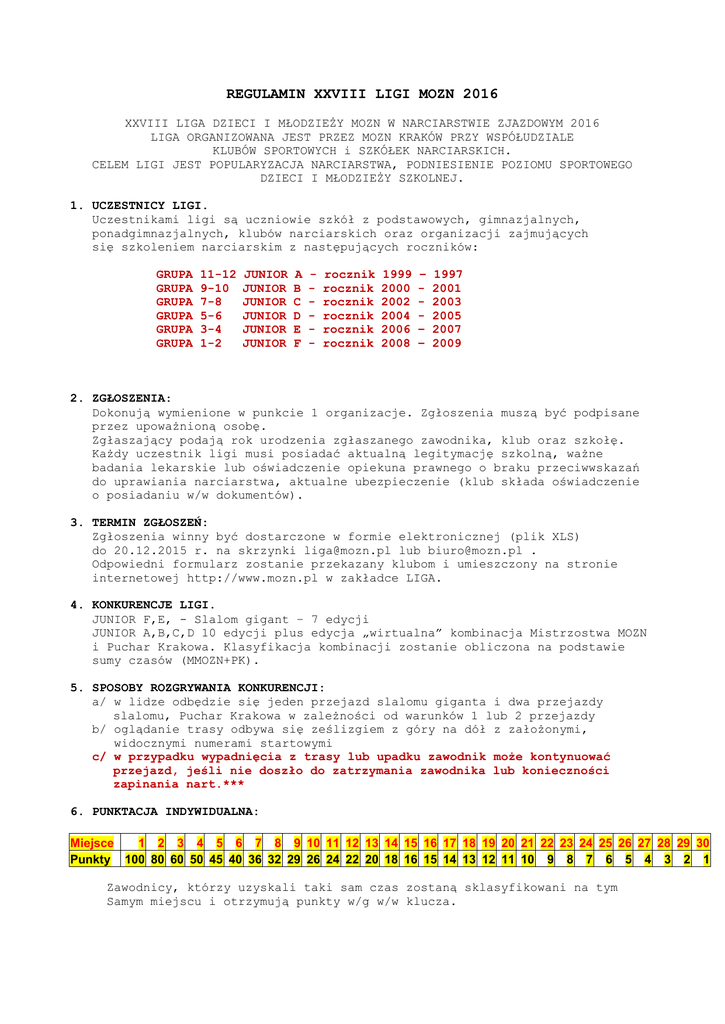 REGULAMIN XXVIII LIGI MOZN 2016 XXVIII LIGA DZIECI I MŁODZIEŻY MOZN W NARCIARSTWIE ZJAZDOWYM 2016 LIGA ORGANIZOWANA JEST PRZEZ MOZN KRAKÓW PRZY WSPÓŁUDZIALE KLUBÓW SPORTOWYCH i SZKÓŁEK NARCIARSKICH. CELEM LIGI JEST POPULARYZACJA NARCIARSTWA, PODNIESIENIE POZIOMU SPORTOWEGO DZIECI I MŁODZIEŻY SZKOLNEJ. 1. UCZESTNICY LIGI. Uczestnikami ligi są uczniowie szkół z podstawowych, gimnazjalnych, ponadgimnazjalnych, klubów narciarskich oraz organizacji zajmujących się szkoleniem narciarskim z następujących roczników: GRUPA GRUPA GRUPA GRUPA GRUPA GRUPA 11-12 9-10 7-8 5-6 3-4 1-2 JUNIOR JUNIOR JUNIOR JUNIOR JUNIOR JUNIOR A B C D E F - rocznik rocznik rocznik rocznik rocznik rocznik 1999 2000 2002 2004 2006 2008 – – – 1997 2001 2003 2005 2007 2009 2. ZGŁOSZENIA: Dokonują wymienione w punkcie 1 organizacje. Zgłoszenia muszą być podpisane przez upoważnioną osobę. Zgłaszający podają rok urodzenia zgłaszanego zawodnika, klub oraz szkołę. Każdy uczestnik ligi musi posiadać aktualną legitymację szkolną, ważne badania lekarskie lub oświadczenie opiekuna prawnego o braku przeciwwskazań do uprawiania narciarstwa, aktualne ubezpieczenie (klub składa oświadczenie o posiadaniu w/w dokumentów). 3. TERMIN ZGŁOSZEŃ: Zgłoszenia winny być dostarczone w formie elektronicznej (plik XLS) do 20.12.2015 r. na skrzynki [email protected] lub [email protected] . Odpowiedni formularz zostanie przekazany klubom i umieszczony na stronie internetowej http://www.mozn.pl w zakładce LIGA. 4. KONKURENCJE LIGI. JUNIOR F,E, - Slalom gigant – 7 edycji JUNIOR A,B,C,D 10 edycji plus edycja „wirtualna” kombinacja Mistrzostwa MOZN i Puchar Krakowa. Klasyfikacja kombinacji zostanie obliczona na podstawie sumy czasów (MMOZN+PK). 5. SPOSOBY ROZGRYWANIA KONKURENCJI: a/ w lidze odbędzie się jeden przejazd slalomu giganta i dwa przejazdy slalomu, Puchar Krakowa w zależności od warunków 1 lub 2 przejazdy b/ oglądanie trasy odbywa się ześlizgiem z góry na dół z założonymi, widocznymi numerami startowymi c/ w przypadku wypadnięcia z trasy lub upadku zawodnik może kontynuować przejazd, jeśli nie doszło do zatrzymania zawodnika lub konieczności zapinania nart.*** 6. PUNKTACJA INDYWIDUALNA: Miejsce 1 2 3 4 5 6 7 8 9 10 11 12 13 14 15 16 17 18 19 20 21 22 23 24 25 26 27 28 29 30 Punkty 100 80 60 50 45 40 36 32 29 26 24 22 20 18 16 15 14 13 12 11 10 9 8 7 6 5 4 3 2 1 Zawodnicy, którzy uzyskali taki sam czas zostaną sklasyfikowani na tym Samym miejscu i otrzymują punkty w/g w/w klucza. 7. PUNKTACJA ZESPOŁOWA KLUBÓW: Do klasyfikacji liczone będą punkty uzyskane przez wszystkich startujących zawodników danego klubu uzyskane w indywidualnej klasyfikacji końcowej. 8. PUNKTACJA ZESPOŁOWA SZKÓŁ: Do klasyfikacji liczone będą punkty uzyskane przez wszystkich startujących zawodników danej szkoły uzyskane w indywidualnej klasyfikacji końcowej. 9. KLASYFIKACJA INDYWIDUALNA – JUNIOR E,F Liczone będzie maksymalnie 5 najlepszych wyników z wszystkich rozegranych edycji, w przypadku mniejszej ilości zawodów (5/7, 4/6, 4/5 , 3/4 , 2/3 ). W końcowej klasyfikacji przy równej liczbie uzyskanych punktów przez dwóch lub więcej zawodników zostaną sklasyfikowani na tym samym miejscu. 10.KLASYFIKACJA INDYWIDUALNA – Junior A,B,C,D Liczone będzie maksymalnie 7 najlepszych wyników wszystkich rozegranych edycji w tym kombinacja Mistrzostwa MOZN i Puchar Krakowa. W przypadku mniejszej ilości zawodów (7/9, 6/8, 5/7, 4/6, 4/5, 3/4, 2/3 ). W końcowej klasyfikacji przy równej liczbie uzyskanych punktów przez dwóch lub więcej zawodników zostaną sklasyfikowani na tym samym miejscu. 11.NAGRODY KOŃCOWE: a/ Indywidualne: od I - III miejsca – nagrody rzeczowe od I – III miejsca medale lub odpowiedniki (puchary) – nagrody rzeczowe od I - X miejsca – dyplomy – nagrody rzeczowe Na koniec sezonu będzie dodatkowa klasyfikacja za SL i trzej najlepsi zawodnicy w każdej grupie otrzymają na "zakończeniu sezonu" okolicznościowe medale i dyplomy. Fundatorem i sponsorem tej klasyfikacji jest Instytut Narciarstwa w Mogilanach. b/ Zespołowo: puchary i dyplomy dla klubów za miejsca I – III, dyplomy za miejsca 4-10 oraz tzw. „mały puchar” za miejsca 1-3 w każdej grupie. c/ Dla szkół: puchary i dyplomy dla klubów I – III, dyplomy za miejsca 4-10 12. LOSOWANIE: (wszystkie losowania komputerowo) a/ Do pierwszej edycji zawodów - losowanie z uwzględnieniem rankingu z poprzedniego sezonu. b/ W następnych edycjach - w każdej grupie wiekowej I grupa -!!! pierwsza piętnastka z klasyfikacji generalnej!!! II grupa –!!! druga piętnastka z klasyfikacji generalnej!!! III grupa - pozostali według miejsc zajmowanych w klasyfikacji c/ Zgłoszenia można dokonać tylko przed zawodami w terminie określonym komunikatem MOZN . d/ Losowanie odbywać się będzie w wyznaczonym w komunikacie MOZN terminie i miejscu. 13.SPRAWY ORGANIZACYJNE: Sprzęt sportowy – bezpieczny * Do startu dopuszczeni będą wyłącznie zawodnicy w kaskach * Zapowiedź zawodów zostanie rozesłana na min.7 dni przed datą planowanych zawodów. * Odwołania i protesty przyjmuje organizator zawodów w terminie 15 minut. w/g NRS za kaucją wynoszącą 500, -zł. * W przypadku złych warunków atmosferycznych (śniegowych) organizator ma prawo odwołania zawodów w dniu poprzedzającym, a nawet w dniu zawodów mając na uwadze bezpieczeństwo zawodników decyzję podejmuje DT. * Zawody przeprowadzone będą zgodnie z regulaminem Ligi oraz NRS. * Zawodnicy zgłoszeni przez dwa kluby jednocześnie nie będą dopuszczeni do udziału w zawodach. 14.Prawo interpretacji i zmiany regulaminu przysługuje komitetowi organizacyjnemu. 15.OPŁATY ZA UDZIAŁ W ZAWODACH:** a/ Wprowadza się jednorazową opłatę za wpisanie zawodnika na listę i nadanie kodu w wysokości 30 zł płatne zbiorczo przez klub do 20.12.2015 na konto MOZN KBS 36-85910007-0020-0055-8266-0001 zgodnie z listą przesłaną do MOZN. Z