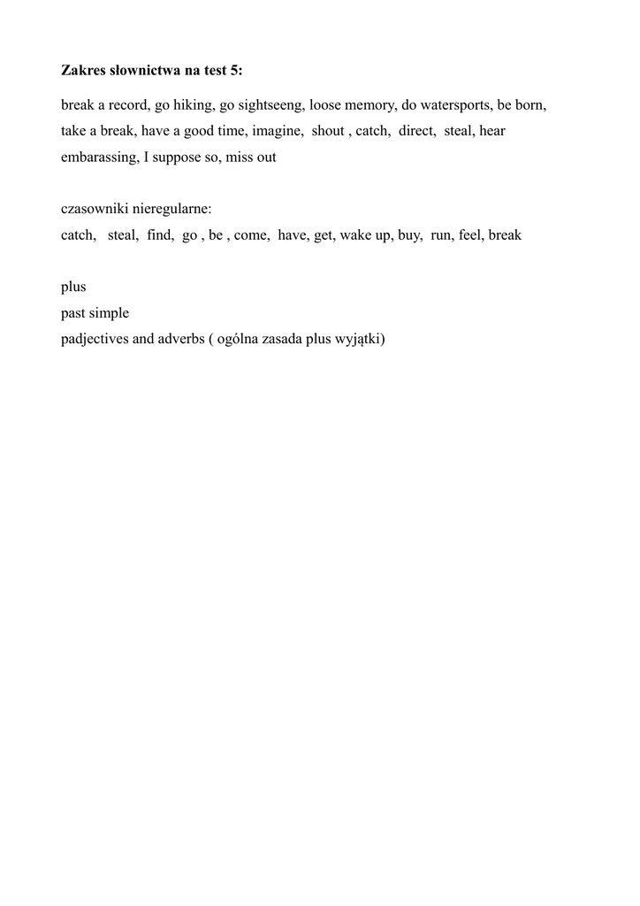 Zakres słownictwa na test 5: break a record, go hiking, go sightseeng, loose memory, do watersports, be born, take a break, have a good time, imagine, shout , catch, direct, steal, hear embarassing, I suppose so, miss out czasowniki nieregularne: catch, steal, find, go , be , come, have, get, wake up, buy, run, feel, break plus past simple padjectives and adverbs ( ogólna zasada plus wyjątki)
