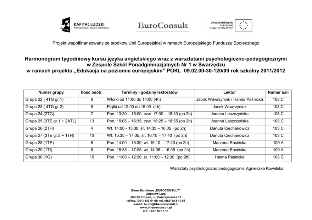 Projekt współfinansowany ze środków Unii Europejskiej w ramach Europejskiego Funduszu Społecznego Harmonogram tygodniowy kursu języka angielskiego wraz z warsztatami psychologiczno-pedagogicznymi w Zespole Szkół Ponadgimnazjalnych Nr 1 w Swarzędzu w ramach projektu „Edukacja na poziomie europejskim” POKL 09.02.00-30-120/09 rok szkolny 2011/2012 Numer grupy Ilość osób: Terminy i godziny lektoratów Lektor Numer sali Grupa 22 ( 4TG gr.1) 6 Wtorki od 11:00 do 14:00 (4h) Jacek Wawrzyniak / Hanna Paśnicka 103 C Grupa 23 ( 4TG gr.2) 9 Piątki od 12:00 do 15:00 (4h) Jacek Wawrzyniak 103 C Grupa 24 (2TG) 7 Pon. 13:30 – 15:00, czw. 17:00 – 18:30 (po 2h) Joanna Leszczyńska 103 C Grupa 25 (3TE gr.1 + 2ATL) 13 Pon. 15:05 – 16:35, czw. 15:25 – 16:55 (po 2h) Joanna Leszczyńska 103 C Grupa 26 (2TH) 4 Wt. 14:00 - 15:30, śr. 14:35 – 16:05 (po 2h) Danuta Ciechanowicz 103 C Grupa 27 (3TE gr.2 + 1TH) 10 Wt. 15:35 – 17:05, śr. 16:10 – 17:40 (po 2h) Danuta Ciechanowicz 103 C Grupa 28 (1TE) 8 Pon. 14:00 – 15:30, wt. 16:10 – 17:40 (po 2h) Marzena Rosińska 109 A Grupa 29 (1TI) 8 Pon. 15:35 – 17:05, wt. 14:35 – 16:05 (po 2h) Marzena Rosińska 109 A Grupa 30 (1G) 15 Pon. 11:00 – 12:30, śr. 11:00 – 12:30 (po 2h) Hanna Paśnicka 103 C Warsztaty psychologiczno pedagogiczne: Agnieszka Kowalska Biuro Handlowe „EUROCONSULT” Zdzisław Lara 60-813 Poznań, ul. Zwierzyniecka 10 tel/fax. (061) 843 51 69, tel. (061) 843 10 68 e-mail: [email protected] www.bheuroconsult.pl NIP 782-146-17-11