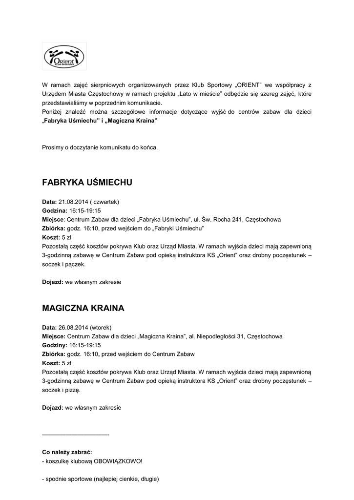 W ramach zajęć sierpniowych organizowanych przez Klub Sportowy „ORIENT” we współpracy z Urzędem Miasta Częstochowy w ramach projektu „Lato w mieście” odbędzie się szereg zajęć, które przedstawialiśmy w poprzednim komunikacie. Poniżej znaleźć można szczegółowe informacje dotyczące wyjść do centrów zabaw dla dzieci „Fabryka Uśmiechu” i „Magiczna Kraina” Prosimy o doczytanie komunikatu do końca. FABRYKA UŚMIECHU Data: 21.08.2014 ( czwartek) Godzina: 16:15-19:15 Miejsce: Centrum Zabaw dla dzieci „Fabryka Uśmiechu”, ul. Św. Rocha 241, Częstochowa Zbiórka: godz. 16:10, przed wejściem do „Fabryki Uśmiechu” Koszt: 5 zł Pozostałą część kosztów pokrywa Klub oraz Urząd Miasta. W ramach wyjścia dzieci mają zapewnioną 3-godzinną zabawę w Centrum Zabaw pod opieką instruktora KS „Orient” oraz drobny poczęstunek – soczek i pączek. Dojazd: we własnym zakresie MAGICZNA KRAINA Data: 26.08.2014 (wtorek) Miejsce: Centrum Zabaw dla dzieci „Magiczna Kraina”, al. Niepodległości 31, Częstochowa Godziny: 16:15-19:15 Zbiórka: godz. 16:10, przed wejściem do Centrum Zabaw Koszt: 5 zł Pozostałą część kosztów pokrywa Klub oraz Urząd Miasta. W ramach wyjścia dzieci mają zapewnioną 3-godzinną zabawę w Centrum Zabaw pod opieką instruktora KS „Orient” oraz drobny poczęstunek – soczek i pizzę. Dojazd: we własnym zakresie ———————————Co należy zabrać: - koszulkę klubową OBOWIĄZKOWO! - spodnie sportowe (najlepiej cienkie, długie) - skarpetki OBOWIĄZKOWO - ciuchy na przebranie - wodę niegazowaną, ewentualnie sok (prosimy nie dawać dzieciom napojów gazowanych) - przekąskę (ciasteczko, kanapkę, wg uznania; prosimy nie dawać dzieciom słodyczy w czekoladzie) - chusteczki higieniczne PROSIMY, NIE ZAKŁADAĆ DZIECIOM ŻADNEJ BIŻUTERII. PROSIMY TAKŻE, BY DZIECI UBRANE BYŁY WYGODNIE, NA SPORTOWO (jeansy, spódniczki, sukienki nie dadzą dzieciom komfortu zabawy). BARDZO PROSIMY, ABY DZIECI NIE ZABIERAŁY ZE SOBĄ SPRZĘTU ELEKTRONICZNEGO. OPIEKUN NIE PONOSI ODPOWIEDZIALNOŚCI ZA EWENTUALNE ZGUBIENIA RZECZY WARTOŚCIOWYCH. PONADTO, ZALEŻY NAM, ABY DZIECI MIAŁY MOŻLIWOŚĆ AKTYWNEGO SPĘDZENIA CZASU WOLNEGO WŚRÓD RÓWIEŚNIKÓW, CHCEMY UNIKNĄĆ SYTUACJI, GDY DZIECI BEZPRODUKTYWNIE SPĘDZAJĄ CZAS PRZY TELEFONACH/TABLETACH. Z GÓRY DZIĘKUJEMY. Warunki uczestnictwa: decyduje kolejność zgłoszeń, ilość miejsc jest ograniczona - pisemna zgoda rodziców (druk do pobrania na stronie) - wpłata 5zł (każde wyjście) - dojazd we własnym zakresie Każdy rodzic/prawny opiekun ma obowiązek OSOBIŚCIE odebrać dziecko z basenu PUNKTUALNIE O GODZINIE 19:15. Jeśli dziecko odbierane będzie przez osobę inną niż rodzic MUSI POSIADAĆ PISEMNE UPOWAŻNIENIE RODZICA DO ODBIORU DZIECKA. BRAK TAKIEGO UPOWAŻNIENIA UNIEMOŻLIWI ODBIÓR DZIECKA, KONIECZNY BĘDZIE ODBIÓR DZIECKA PRZEZ PRAWNEGO OPIEKUNA. Wzór upoważnienia do pobrania ze strony klubowej www.ksorient.pl. Osoba odbierająca dziecko składa na liście uczestników czytelny podpis odbioru dziecka. Instruktorzy będą przestrzegać tej zasady bezwzględnie. Rodzice dowożą dzieci na miejsce zbiórki i odwożą z miejsca zbiórki we własnym zakresie. Koszty wszelkich zakupów na terenie Centrów Zabaw uczestnicy ponoszą we własnym zakresie. ZAPISY SĄ WIĄŻĄCE. OSOBY, KTÓRE ZAPISZĄ SIĘ NA LISTĘ UCZESTNIKÓW, A NASTĘPNIE WYCOFAJĄ SIĘ Z UDZIAŁU, POKRYWAJĄ KOSZT CAŁODNIOWEGO POBYTU DZIECKA W CENTRUM ZABAW. Organizator zastrzega sobie prawo zmiany terminu wyjść lub też odwołanie danego wyjścia z powodu czynników organizacyjnych. O wszystkich zmianach zawodnicy będą informowani na bieżąco na treningach oraz za pośrednictwem strony internetowej. Ja, niżej podpisana/y ……………………………………………………………. przyjmuję do wiadomości powyższe, zobowiązuję się do przestrzegania powyższych zasad oraz wyrażam zgodę, aby moje dziecko …………………………………………………………………….. wzięło udział we wszystkich powyższych zajęciach. Przyjmuję również do wiadomości fakt, że moje dziecko, podczas wszystkich zajęć przebywać będzie pod opieką instruktorów Klubu Sportowego „Orient”. Jednocześnie przyjmuję do wiadomości fakt, że opiekunowie nie ponoszą odpowiedzialności za rzeczy zgubione przez dzieci, w szczególności za rzeczy cenne- sprzęt elektroniczny, telefony itp. ………………………………………………………………. Czytelny podpis, data Numer telefonu do rodziców: …………………………………………………. Numer telefonu do zawodnika: ………………………………………………..