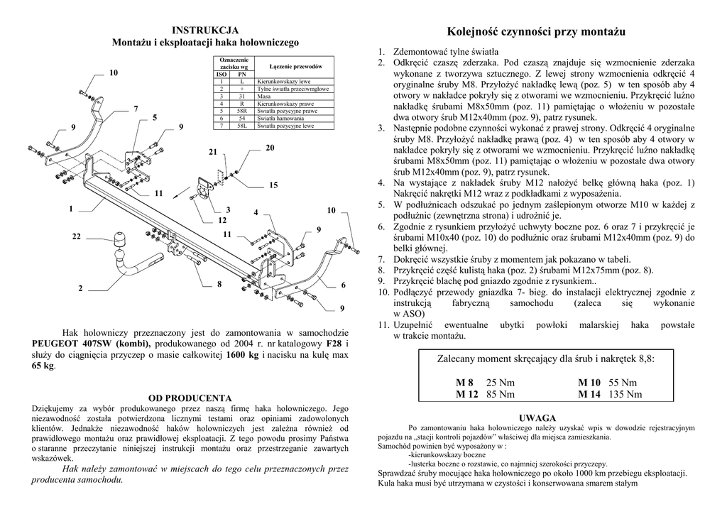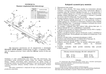 INSTRUKCJA MontaŜu i eksploatacji haka holowniczego 10 7 5 9 9 Oznaczenie zacisku wg ISO PN 1 L 2 + 3 31 4 R 5 58R 6 54 7 58L Kolejność czynności przy montaŜu Łączenie przewodów Kierunkowskazy lewe Tylne światła przeciwmgłowe Masa Kierunkowskazy prawe Światła pozycyjne prawe Światła hamowania Światła pozycyjne lewe 20 21 15 11 1 3 12 11 22 2 8 10 4 9 6 9 Hak holowniczy przeznaczony jest do zamontowania w samochodzie PEUGEOT 407SW (kombi), produkowanego od 2004 r. nr katalogowy F28 i słuŜy do ciągnięcia przyczep o masie całkowitej 1600 kg i nacisku na kulę max 65 kg. OD PRODUCENTA Dziękujemy za wybór produkowanego przez naszą firmę haka holowniczego. Jego niezawodność została potwierdzona licznymi testami oraz opiniami zadowolonych klientów. JednakŜe niezawodność haków holowniczych jest zaleŜna równieŜ od prawidłowego montaŜu oraz prawidłowej eksploatacji. Z tego powodu prosimy Państwa o staranne przeczytanie niniejszej instrukcji montaŜu oraz przestrzeganie zawartych wskazówek. Hak naleŜy zamontować w miejscach do tego celu przeznaczonych przez producenta samochodu. 1. Zdemontować tylne światła 2. Odkręcić czaszę zderzaka. Pod czaszą znajduje się wzmocnienie zderzaka wykonane z tworzywa sztucznego. Z lewej strony wzmocnienia odkręcić 4 oryginalne śruby M8. PrzyłoŜyć nakładkę lewą (poz. 5) w ten sposób aby 4 otwory w nakładce pokryły się z otworami we wzmocnieniu. Przykręcić luźno nakładkę śrubami M8x50mm (poz. 11) pamiętając o włoŜeniu w pozostałe dwa otwory śrub M12x40mm (poz. 9), patrz rysunek. 3. Następnie podobne czynności wykonać z prawej strony. Odkręcić 4 oryginalne śruby M8. PrzyłoŜyć nakładkę prawą (poz. 4) w ten sposób aby 4 otwory w nakładce pokryły się z otworami we wzmocnieniu. Przykręcić luźno nakładkę śrubami M8x50mm (poz. 11) pamiętając o włoŜeniu w pozostałe dwa otwory śrub M12x40mm (poz. 9), patrz rysunek. 4. Na wystające z nakładek śruby M12 nałoŜyć belkę główną haka (poz. 1) Nakręcić nakrętki M12 wraz z podkładkami z wyposaŜenia. 5. W podłuŜnicach odszukać po jednym zaślepionym otworze M10 w kaŜdej z podłuŜnic (zewnętrzna strona) i udroŜnić je. 6. Zgodnie z rysunkiem przyłoŜyć uchwyty boczne poz. 6 oraz 7 i przykręcić je śrubami M10x40 (poz. 10) do podłuŜnic oraz śrubami M12x40mm (poz. 9) do belki głównej. 7. Dokręcić wszystkie śruby z momentem jak pokazano w tabeli. 8. Przykręcić część kulistą haka (poz. 2) śrubami M12x75mm (poz. 8). 9. Przykręcić blachę pod gniazdo zgodnie z rysunkiem.. 10. Podłączyć przewody gniazdka 7- bieg. do instalacji elektrycznej zgodnie z instrukcją fabryczną samochodu (zaleca się wykonanie w ASO) 11. Uzupełnić ewentualne ubytki powłoki malarskiej haka powstałe w trakcie montaŜu. Zalecany moment skręcający dla śrub i nakrętek 8,8: M 8 25 Nm M 12 85 Nm M 10 55 Nm M 14 135 Nm UWAGA Po zamontowaniu haka holowniczego naleŜy uzyskać wpis w dowodzie rejestracyjnym pojazdu na „stacji kontroli pojazdów” właściwej dla miejsca zamieszkania. Samochód powinien być wyposaŜony w : -kierunkowskazy boczne -lusterka boczne o rozstawie, co najmniej szerokości przyczepy. Sprawdzać śruby mocujące haka holowniczego po około 1000 km przebiegu eksploatacji. Kula haka musi być utrzymana w czystości i konserwowana smarem stałym PPUH AUTO-HAK S.J. WyposaŜenie haka: Produkcja Haków Holowniczych Henryk & Zbigniew Nejman 76-200 SŁUPSK ul. Słoneczna 16K tel/fax (059) 8-414-414; 8-414-413 E-mail: [email protected] www. autohak.com.pl Hak holowniczy bez wyposaŜenia elektrycznego Klasa: A50-X Nr kat. F28 Przeznaczony do zamontowania w samochodzie: Producent: PEUGEOT Model: 407 SW Typ: KOMBI produkowanego od 2004r. Dane techniczne: Wartość siły D : 9,5 kN maksymalna masa przyczepy: 1600 kg maksymalny nacisk na kulę: 65 kg Numer homologacji zgodnie z dyrektywą 94/20/WE: e20*94/20*0213*00 KARTA GWARANCYJNA Producent udziela gwarancji niniejszą kartą gwarancyjną na okres 12 miesięcy licząc od dnia zakupu haka holowniczego do samochodu: PEUGEOT 407SW (KOMBI) produkowanego od 2004r. Data produkcji .............................. Data zakupu........................................... Zakres gwarancji obejmuje wyłącznie wady jakościowe wynikające z winy producenta. Gwarancja nie obejmuje natomiast uszkodzeń zawinionych przez nabywcę, wynikających z niewłaściwego montaŜu, uŜytkowania lub konserwacji, uszkodzeń mechanicznych, normalnego zuŜycia podczas eksploatacji itp. Reklamacje naleŜy zgłaszać w punkcie sprzedaŜy, składając jednocześnie kartę gwarancyjną. Usunięcie "wady" następuje po stwierdzeniu przez punkt sprzedaŜy wspólnie z producentem słuszności złoŜonej reklamacji. Reklamacja powinna być załatwiona w ciągu czternastu dni od dnia uznania reklamacji. Karta gwarancyjna jest niewaŜna jeŜeli nie jest wypełniona i podpisana. Data zgłoszenia reklamacji: ................................................................... INFORMACJA WSTĘPNA Hak holowniczy jest skonstruowany zgodnie z zasadami bezpieczeństwa ruchu drogowego. Hak holowniczy jest elementem wpływającym na bezpieczeństwo jazdy i moŜe zostać zainstalowany wyłącznie przez personel wyspecjalizowany. Niedopuszczalne jest dokonywanie jakichkolwiek zmian w konstrukcji haka. Powoduje to wygaśniecie dopuszczenia do stosowania. W przypadku obecności masy izolacyjnej lub osłony podwozia w miejscu przylegania haka, naleŜy ją usunąć. Nieosłonięte miejsca karoserii oraz wywiercone otwory naleŜy pomalować farbą antykorozyjną. Informacjami wiąŜącymi odnośnie wartości obciąŜeń są dane podawane przez producenta samochodu, względnie wartości maksymalnej masy przyczepy oraz maksymalnego nacisku na kulę, przy czym wartości parametrów haka holowniczego nie mogą być przekroczone. Wzór do obliczania wartości siły D: Maks. masa przyczepy [kg] x Maks. masa samochodu 