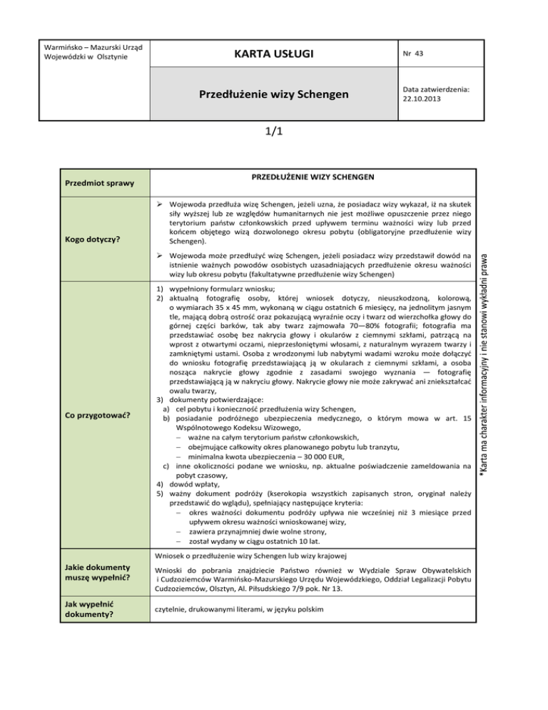 Warmińsko – Mazurski Urząd Wojewódzki w Olsztynie KARTA USŁUGI Przedłużenie wizy Schengen Nr 43 Data zatwierdzenia: 22.10.2013 1/1 Przedmiot sprawy Kogo dotyczy? PRZEDŁUŻENIE WIZY SCHENGEN Wojewoda przedłuża wizę Schengen, jeżeli uzna, że posiadacz wizy wykazał, iż na skutek siły wyższej lub ze względów humanitarnych nie jest możliwe opuszczenie przez niego terytorium państw członkowskich przed upływem terminu ważności wizy lub przed końcem objętego wizą dozwolonego okresu pobytu (obligatoryjne przedłużenie wizy Schengen). Wojewoda może przedłużyć wizę Schengen, jeżeli posiadacz wizy przedstawił dowód na istnienie ważnych powodów osobistych uzasadniających przedłużenie okresu ważności wizy lub okresu pobytu (fakultatywne przedłużenie wizy Schengen) Co przygotować? 1) wypełniony formularz wniosku; 2) aktualną fotografię osoby, której wniosek dotyczy, nieuszkodzoną, kolorową, o wymiarach 35 x 45 mm, wykonaną w ciągu ostatnich 6 miesięcy, na jednolitym jasnym tle, mającą dobrą ostrość oraz pokazującą wyraźnie oczy i twarz od wierzchołka głowy do górnej części barków, tak aby twarz zajmowała 70—80% fotografii; fotografia ma przedstawiać osobę bez nakrycia głowy i okularów z ciemnymi szkłami, patrzącą na wprost z otwartymi oczami, nieprzesłoniętymi włosami, z naturalnym wyrazem twarzy i zamkniętymi ustami. Osoba z wrodzonymi lub nabytymi wadami wzroku może dołączyć do wniosku fotografię przedstawiającą ją w okularach z ciemnymi szkłami, a osoba nosząca nakrycie głowy zgodnie z zasadami swojego wyznania — fotografię przedstawiającą ją w nakryciu głowy. Nakrycie głowy nie może zakrywać ani zniekształcać owalu twarzy, 3) dokumenty potwierdzające: a) cel pobytu i konieczność przedłużenia wizy Schengen, b) posiadanie podróżnego ubezpieczenia medycznego, o którym mowa w art. 15 Wspólnotowego Kodeksu Wizowego, − ważne na całym terytorium państw członkowskich, − obejmujące całkowity okres planowanego pobytu lub tranzytu, − minimalna kwota ubezpieczenia – 30 000 EUR, c) inne okoliczności podane we wniosku, np. aktualne poświadczenie zameldowania na pobyt czasowy, 4) dowód wpłaty, 5) ważny dokument podróży (kserokopia wszystkich zapisanych stron, oryginał należy przedstawić do wglądu), spełniający następujące kryteria: − okres ważności dokumentu podróży upływa nie wcześniej niż 3 miesiące przed upływem okresu ważności wnioskowanej wizy, − zawiera przynajmniej dwie wolne strony, − został wydany w ciągu ostatnich 10 lat. Wniosek o przedłużenie wizy Schengen lub wizy krajowej Jakie dokumenty muszę wypełnić? Jak wypełnić dokumenty? Wnioski do pobrania znajdziecie Państwo również w Wydziale Spraw Obywatelskich i Cudzoziemców Warmińsko-Mazurskiego Urzędu Wojewódzkiego, Oddział Legalizacji Pobytu Cudzoziemców, Olsztyn, Al. Piłsudskiego 7/9 pok. Nr 13. czytelnie, drukowanymi literami, w języku polskim Warmińsko – Mazurski Urząd Wojewódzki w Olsztynie KARTA USŁUGI Przedłużenie wizy Schengen Nr 43 Data zatwierdzenia: 22.10.2013 2/1 Ile muszę zapłacić? Kiedy złożyć dokumenty? - opłata skarbowa za przedłużenie wizy Schengen - równowartość 30 euro (przeliczenia równowartości euro na złote dokonuje się według referencyjnego kursu euro ogłoszonego przez Europejski Bank Centralny w ostatnim dniu roboczym poprzedzającym dzień złożenia wniosku o przedłużenie wizy), - przedłużenie wizy na skutek siły wyższej lub ze względów humanitarnych – bezpłatnie, wpłaty można dokonać: gotówką w kasie Urzędu Miasta Olsztyna pok. nr 35, Pl. Jana Pawła II 1,10-101 Olsztyn w godzinach: 8:00 – 17:45 poniedziałek, 8:00- 15:15 wtorek – piątek lub na rachunek: Urząd Miasta Olsztyna - Wydział Podatków i Opłat Plac Jana Pawła II nr 1, 10-101 Olsztyn Bank Handlowy w Warszawie S.A. 20 1030 1218 0000 0000 9040 1513 z tytułu “opłata za przedłużenie wizy” Wniosek o przedłużenie wizy: 1) należy złożyć 3 dni przed upływem okresu pobytu oznaczonego w posiadanej wizie, 2) można złożyć w ostatnim dniu okresu pobytu oznaczonego w posiadanej wizie Schengen w przypadkach o których mowa w art. 33 ust. 1 Wspólnotowego Kodeksu Wizowego (siła wyższa, względy humanitarne) lub gdy cudzoziemiec przebywa w szpitalu. UWAGA: Wniosek o przedłużenie wizy Schengen złożony po terminie pozostawia się bez rozpoznania. Gdzie załatwię sprawę? Wydział Spraw Obywatelskich i Cudzoziemców Oddział Legalizacji Pobytu Cudzoziemców Warmińsko-Mazurskiego Urzędu Wojewódzkiego w Olsztynie 10-575 Olsztyn, Al. M.J. Piłsudskiego 7/9, pok. Nr 13 poniedziałek wtorek środa czwartek piątek – – – – – 9.00-17.00 10.00-15.00 10.00-15.00 10.00-15.00 10.00-15.00 Czy sprawę załatwię drogą elektroniczną? nie Co zrobi urząd? wyda decyzję Jaki jest czas realizacji? 1 miesiąc Jak się odwołać? Stronie przysługuje prawo wniesienia odwołania od decyzji, za pośrednictwem wojewody do Szefa Urzędu do Spraw Cudzoziemców, w terminie 14 dni od daty jej doręczenia. Warmińsko – Mazurski Urząd Wojewódzki w Olsztynie KARTA USŁUGI Przedłużenie wizy Schengen Nr 43 Data zatwierdzenia: 22.10.2013 3/1 Przedłużenia wizy Schengen dokonuje wojewoda właściwy ze względu na miejsce pobytu cudzoziemca. Należy dostarczyć oryginały lub odpisy powyższych dokumentów, jeżeli ich zgodność z oryginałem została poświadczona przez notariusza albo przez występującego w sprawie pełnomocnika strony będącego adwokatem, radcą prawnym, rzecznikiem patentowym lub doradcą podatkowym (art.76a kpa). Kserokopie dokumentów nie mogą stanowić dowodów w postępowaniu administracyjnym. Okres ważności wydanej wizy lub długość pobytu objętego tą wizą można przedłużyć, jeżeli posiadacz wizy przedstawi dowód na istnienie ważnych powodów osobistych uzasadniających przedłużenie okresu ważnośc
