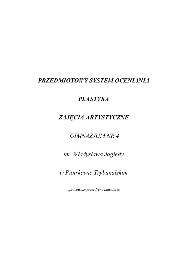 PRZEDMIOTOWY SYSTEM OCENIANIA PLASTYKA ZAJĘCIA ARTYSTYCZNE GIMNAZJUM NR 4 im. Władysława Jagiełły w Piotrkowie Trybunalskim opracowany przez Irenę Ławniczek Nauczanie plastyki odbywa się z wykorzystaniem podręcznika autorstwa Katarzyny Czernickiej: ,,Plastyka. Podręcznik dla klas I – III”, Wydawnictwo OPERON Na zajęciach artystycznych w klasie II – ej i III – ej uczniowie nie korzystają z podręcznika. Przedmiot plastyka realizowany jest w klasie I w wymiarze jednej godziny tygodniowo. Przedmiot zajęcia artystyczne z plastyki realizowany jest w klasach drugich i trzecich w wymiarze 1 godziny tygodniowo. I. Cele PSO. II. Zasady PSO. III. Co podlega ocenie na danym przedmiocie. IV. Zasady oceniania aktywności uczniów na lekcjach. V. Sposoby oraz częstotliwość sprawdzania osiągnięć uczniów. VI. Skala ocen. VII. Kryteria oceniania w klasach I-III. VIII. Jakościowy i ilościowy sposób oceniania prac pisemnych IX. Sposoby dokumentowania osiągnięć uczniów. X. Sposoby informowania. XI. Poprawa oceny. I. Cele PSO 1. Poinformowanie ucznia o poziomie jego osiągnięć edukacyjnych. 2. Niesienie pomocy uczniowi w samodzielnym planowaniu swego rozwoju. 3. Motywowanie ucznia do dalszej pracy. 4. Dostarczenie rodzicom (prawnym opiekunom) i nauczycielom informacji o postępach, trudnościach, specjalnych uzdolnieniach ucznia. 5. Umożliwienie nauczycielowi doskonalenia organizacji i metod pracy dydaktyczno-wychowawczej. 2 II. Zasady PSO 1. Nauczyciel na początku roku szkolnego informuje uczniów o zakresie wymagań z danego przedmiotu oraz o sposobie i zasadach oceniania. Wskazane jest powtórzenie tych czynności na początku II semestru. 2. Sprawdziany oraz kartkówki z plastyki są obowiązkowe. Jeżeli uczeń w tym czasie był nieobecny na lekcji, powinien pisać sprawdzian lub kartkówkę w terminie późniejszym, nie dłuższym niż odstęp dwóch tygodni. Termin uzgodnionia z nauczycielem. 3. Za sprawdziany uważane są różnego rodzaju testy - zapowiadane z 1-tygodniowym wyprzedzeniem. / plastyka 4. Uczeń jest zobowiązany oddać pracę praktyczną najpóźniej po dwóch tygodniach od daty wykonywania jej na zajęciach. Jeśli tego nie zrobi, otrzymuje za niewykonanie pracy ocenę niedostateczną. 5. Uczeń ma prawo do poprawy oceny niedostatecznej w terminie dwóch tygodni. 6. Uczeń jest zobowiązany do noszenia zeszytu przedmiotowego oraz podręcznika. 7. Dwa razy w semestrze uczeń może zgłosić brak przygotowania do lekcji bez żadnych sankcji, nie podając przyczyny. Nie dotyczy to lekcji, na których nauczyciel zaplanował sprawdzian. 8. Uczeń nie ponosi żadnych konsekwencji, jeśli zgłosi brak przygotowania, które nastąpiło z ważnych przyczyn, potwierdzonych pisemnie przez rodzica/opiekuna. 9. Prace domowe, szczególnie dłuższe formy wypowiedz (recenzja z wystawy lub opis obrazu), powinny być wykonywane w terminie. Jeśli ich brak, nauczyciel odnotowuje to w dzienniku i wyznacza nowy termin. W przypadku ponownego niedotrzymaniu terminu uczeń otrzymuje ocenę niedostateczną. 10. Nie ocenia się ucznia po dłuższej usprawiedliwionej nieobecności w szkole. Okres ten trwa od 3 do 7 dni (w zależności od długości absencji) 11. W przypadku zajęć artystycznych ocenie podlega działalność plastyczna oraz umiejętność wykorzystania wiedzy w pracach plastycznych III. Co podlega ocenie: Oceny cząstkowe uczeń uzyskuje za: - Wykonanie pracy plastycznej na lekcji, - Czytanie tekstów kultury i ich interpretację, - Sprawdzian wiadomości ogłoszony z tygodniowym wyprzedzeniem, - Odpowiedź ustną, przygotowanie referatu, - Aktywność na lekcji (pięć plusów uczeń otrzymuje ocenę bardzo dobrą), - Udział w konkursach plastycznych, wystawach i projektach edukacyjnych, - Wykonanie dodatkowych prac plastycznych np. dekoracje okolicznościowe, - Prowadzenie zeszytu. - Dodatkową działalność plastyczną. - Za każdą dodatkową pracę. - Udział w konkursach. - Sprawdziany pisemne ( testy, kartkówki); - Praca ucznia na lekcji (aktywność, praca w grupie); 3 - Samodzielna praca domowa ucznia (pisemna praca w zeszycie); Wypowiedzi ustne: odpowiedzi na pytania, Wypowiedzi pisemne: odpowiedzi na pytania, referaty, opisy obrazów, recenzje z wystawy; Zeszyt (estetyka, systematyczność prowadzenia; Na zajęciach artystycznych: praca na lekcji, systematyczność, przynoszenie materiałów, praca w grupie. IV. Zasady oceniania aktywności uczniów na lekcjach. Uczeń otrzymuje ocenę pozytywną lub „+” za: 1. Poprawne i szybkie rozwiązanie bieżącego problemu 2. Podejmowanie merytorycznej dyskusji 3. Przygotowanie dodatkowych materiałów do lekcji 4. Wykazanie się szczególnymi wiadomościami i umiejętnościami 5. Pomoc kolegom w przyswajaniu wiedzy i umiejętności technicznych 6. Wykonanie pomocy do pracowni 7. Za pięć plusów uczeń otrzymuje ocenę bardzo dobrą. Uczeń otrzymuje ocenę negatywną lub „-” za: 1. Zajmowanie się na lekcji czynnościami niezwiązanymi z realizowanym tematem 2. Wykazywanie się brakiem oczywistych umiejętności 3. Niszczenie prac kolegów 4. Nie przestrzeganie regulaminu pracowni. 5. Za pięć minusów uczeń otrzymuje ocenę cząstkową negatywną. V. Sposoby oraz częstotliwość sprawdzania osiągnięć uczniów 1. Odpytywanie bieżące – po każdej lekcji z historii sztuki. 2. Wykonywanie przez uczniów ćwiczeń, prac praktycznych – po każdej takiej lekcji. W przypadku wolnego tempa pracy umożliwia się uczniowi dokończenie pracy w domu. 3. Prace klasowe w postaci testów. 4. Kartkówki - z bieżącego materiału - według uznania nauczyciela. 5. Zeszyt przedmiotowy - przynajmniej raz w roku. 6. Na zajęciach artystycznych: wykonanie pracy i oddanie jej w wyznaczonym terminie. VI. Skala ocen Zgodnie z WSO stosuje się skalę ocen od 1 do 6 . VII. Kryteria oceniania w klasach I - III Kryteria ogólne: Ocenę celującą otrzymuje uczeń, który: • wyróżnia się wiedzą plast