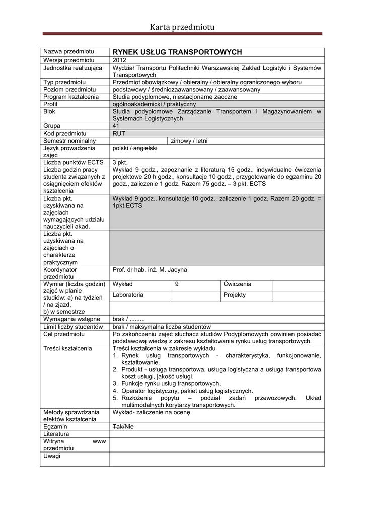 Karta przedmiotu Nazwa przedmiotu Wersja przedmiotu Jednostka realizująca Typ przedmiotu Poziom przedmiotu Program kształcenia Profil Blok Grupa Kod przedmiotu Semestr nominalny Język prowadzenia zajęć Liczba punktów ECTS Liczba godzin pracy studenta związanych z osiągnięciem efektów kształcenia Liczba pkt. uzyskiwana na zajęciach wymagających udziału nauczycieli akad. Liczba pkt. uzyskiwana na zajęciach o charakterze praktycznym Koordynator przedmiotu Wymiar (liczba godzin) zajęć w planie studiów: a) na tydzień / na zjazd, b) w semestrze Wymagania wstępne Limit liczby studentów Cel przedmiotu Treści kształcenia Metody sprawdzania efektów kształcenia Egzamin Literatura Witryna www przedmiotu Uwagi RYNEK USŁUG TRANSPORTOWYCH 2012 Wydział Transportu Politechniki Warszawskiej Zakład Logistyki i Systemów Transportowych Przedmiot obowiązkowy / obieralny / obieralny ograniczonego wyboru podstawowy / średniozaawansowany / zaawansowany Studia podyplomowe, niestacjonarne zaoczne ogólnoakademicki / praktyczny Studia podyplomowe Zarządzanie Transportem i Magazynowaniem w Systemach Logistycznych 41 RUT zimowy / letni polski / angielski 3 pkt. Wykład 9 godz., zapoznanie z literaturą 15 godz., indywidualne ćwiczenia projektowe 20 h godz., konsultacje 10 godz., przygotowanie do egzaminu 20 godz., zaliczenie 1 godz. Razem 75 godz. – 3 pkt. ECTS Wykład 9 godz., konsultacje 10 godz., zaliczenie 1 godz. Razem 20 godz. = 1pkt.ECTS Prof. dr hab. inż. M. Jacyna Wykład Laboratoria 9 Ćwiczenia Projekty brak / ......... brak / maksymalna liczba studentów Po zakończeniu zajęć słuchacz studiów Podyplomowych powinien posiadać podstawową wiedzę z zakresu kształtowania rynku usług transportowych. Treści kształcenia w zakresie wykładu 1. Rynek usług transportowych - charakterystyka, funkcjonowanie, kształtowanie. 2. Produkt - usługa transportowa, usługa logistyczna a usługa transportowa koszt usługi, jakość usługi. 3. Funkcje rynku usług transportowych. 4. Operator logistyczny, pakiet usług logistycznych. 5. Rozłożenie popytu – podział zadań przewozowych. Układ multimodalnych korytarzy transportowych. Wykład- zaliczenie na ocenę Tak/Nie Karta przedmiotu Efekty kształcenia (dla każdej pozycji na liście efektów kształcenia – sposób sprawdzania, w tym dla umiejętności – odwołanie do konkretnych zadań projektowych, laboratoryjnych itp.) Weryfikacja Odniesienie do efektów programu TMsp_W01 Efekt Kod Ma uporządkowaną, podbudowaną teoretycznie wiedzę ogólną obejmującą kształtowanie rynku usług transportowych i logistycznych oraz ich funkcji Ma podbudowaną teoretycznie szczegółową wiedzę dotyczącą systematyki usług transportowych, kompleksowych usług logistycznych, jakości usług Ma podbudowaną teoretycznie szczegółową wiedzę dotyczącą funkcjonowania operatora logistycznego na rynku usług logistycznych Ma podbudowaną teoretycznie szczegółową wiedzę dotyczącą układu sieci multimodalnych korytarzy transportowych oraz rozłożenia potoku ruchu na drogi sieci transportowej Potrafi pozyskiwać informacje z literatury, baz danych oraz z innych źródeł w zastosowaniu do analizy i oceny RUD_W01 pozytywny wynik zaliczenia RUD_W02 pozytywny wynik zaliczenia TMsp_W02 RUD_W03 pozytywny wynik zaliczenia TMsp_W02 TMsp_W03 RUD_W04 pozytywny wynik zaliczenia TMsp_W02 TMsp_W03 RUD_U01 pozytywny wynik zaliczenia TMsp_U01 Karta przedmiotu funkcjonowania rynku usług transportowych Potrafi dokonać systematyki cech jakościowych usług transportowych i usług logistycznych Potrafi dokonać charakterystyki podmiotów i przedmiotu rynku usług transportowych bądź rynku usług logistycznych Potrafi dokonać analizy i oceny funkcjonowania operatorów rynku usług logistycznych Rozumie potrzebę uczenia się przez całe życie, potrafi inspirować i organizować proces uczenia się innych osób RUD_U02 pozytywny wynik zaliczenia TMsp_U02 TMsp_U03 RUD_U03 pozytywny wynik zaliczenia TMsp_U03 TMsp_W04 RUD_U04 pozytywny wynik zaliczenia TMsp_U06 RUD_K01 Bieżąca weryfikacja postępów na zajęciach TMsp_K01