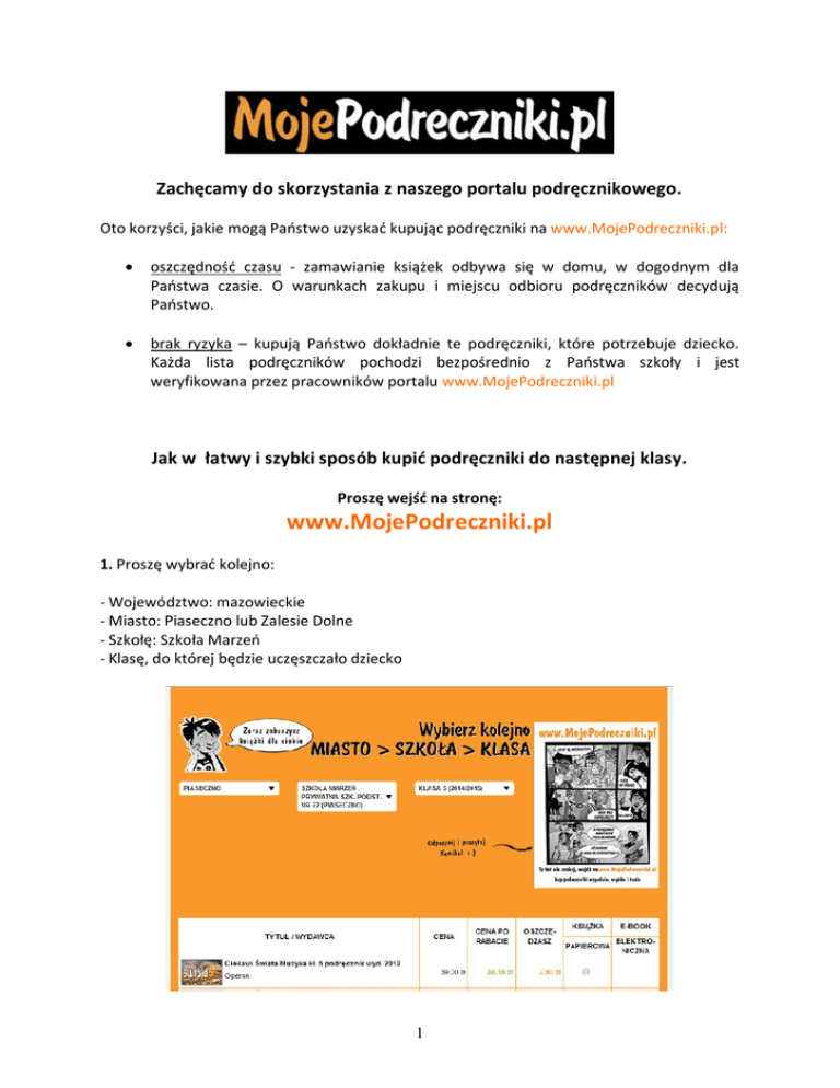 Zachęcamy do skorzystania z naszego portalu podręcznikowego. Oto korzyści, jakie mogą Państwo uzyskać kupując podręczniki na www.MojePodreczniki.pl: • oszczędność czasu - zamawianie książek odbywa się w domu, w dogodnym dla Państwa czasie. O warunkach zakupu i miejscu odbioru podręczników decydują Państwo. • brak ryzyka – kupują Państwo dokładnie te podręczniki, które potrzebuje dziecko. Każda lista podręczników pochodzi bezpośrednio z Państwa szkoły i jest weryfikowana przez pracowników portalu www.MojePodreczniki.pl Jak w łatwy i szybki sposób kupić podręczniki do następnej klasy. Proszę wejść na stronę: www.MojePodreczniki.pl 1. Proszę wybrać kolejno: - Województwo: mazowieckie - Miasto: Piaseczno lub Zalesie Dolne - Szkołę: Szkoła Marzeń - Klasę, do której będzie uczęszczało dziecko 1 2. Po wybraniu klasy zostanie wyświetlona lista podręczników dla dziecka. Z proponowanego zestawienia proszę wybrać książki, które chcieliby Państwo zakupić. W tym celu należy zaznaczyć opcję książka papierowa przy wybranych pozycjach. Można zamówić wszystkie książki wskazane dla klasy lub tylko te brakujące (np. same zeszyty ćwiczeń). Zachęcamy również do zakupu proponowanych przez nas pozycji z oferty dodatkowej. 3. Proszę o naciśnięcie hasła: Zamów teraz! Wybrane tytuły zostaną dodane do koszyka. 4. Wybrane przez Państwa książki pojawią się w koszyku. Tutaj można sprawdzić wybrane pozycje i dokonać ewentualnej zmiany zamówienia. 5. Proszę wybrać dogodną dla siebie formę płatności i sposób dostawy. Proponujemy następujące formy płatności: - płatność elektroniczna - pobranie - gotówka. Proponujemy następujące sposoby odbioru zamówienia: - dostawa paczki za pośrednictwem firmy kurierskiej na podany adres - dostawa paczki za pośrednictwem Poczty Polskiej na podany adres - odbiór w wybranym Paczkomacie InPost. 2 6. Proszę podać swoje dane kontaktowe i adres potrzebny do ewentualnej wysyłki paczki. Jeśli została wybrana opcja płatności elektronicznej, zostaną Państwo przeniesieni na stronę Payeezy, gdzie za pośrednictwem bramki First Data Polcard w bezpieczny sposób zostanie zrealizowana płatność elektroniczna. 3 7. Podręczniki do następnej klasy zostały zamówione w sklepie MojePodreczniki.pl. Za chwilę otrzymają Państwo e-mail potwierdzający złożenie zamówienia. Realizacja zamówienia trwa. Wkrótce będziemy się z Państwem kontaktować drogą mailową lub telefonicznie. Dziękujemy! Zapraszamy częściej! Zespół MojePodreczniki.pl 4